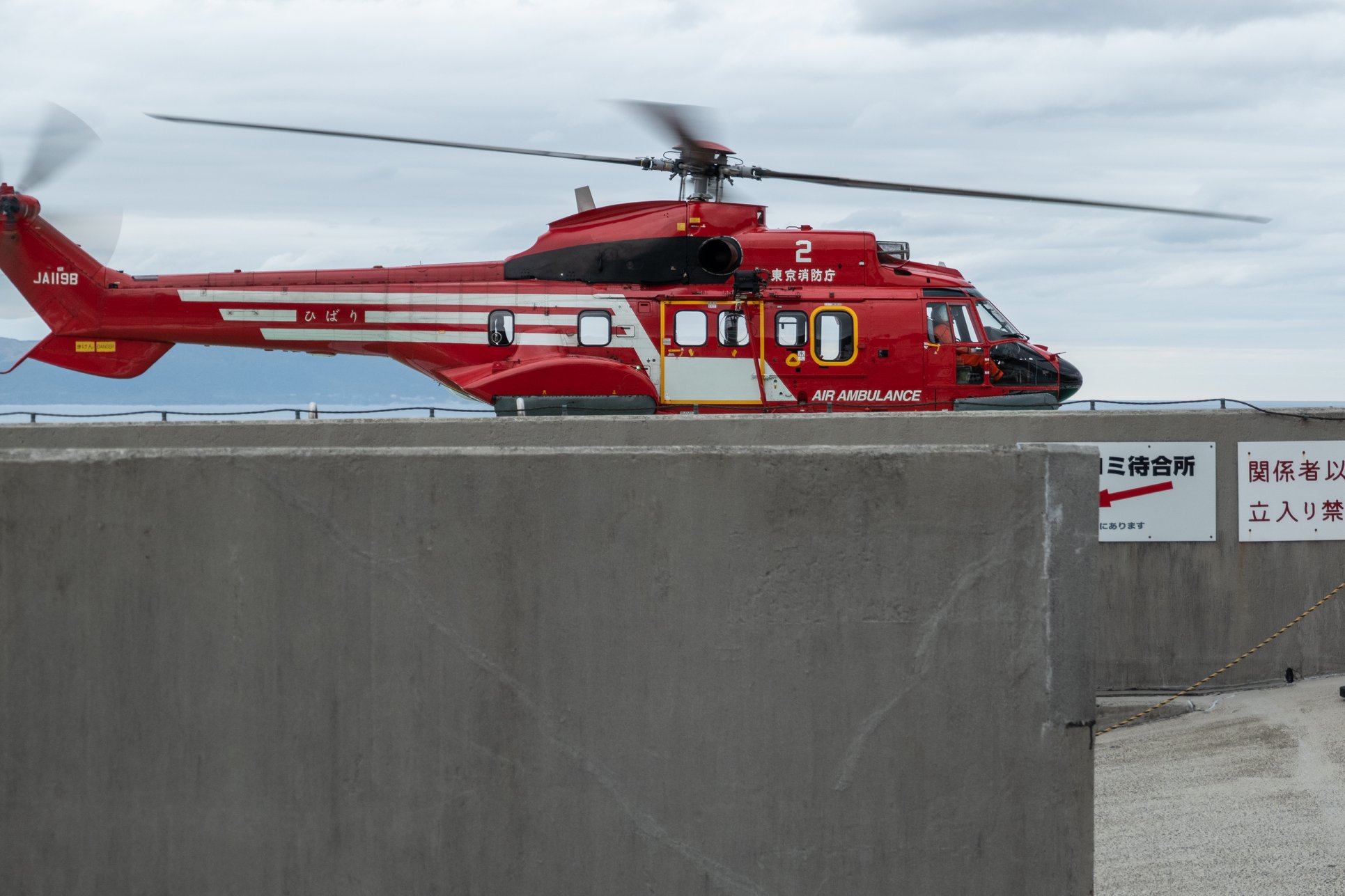 13:59 防災のヘリが飛んできて、急に具合の悪くなったおばあちゃんを乗せて、飛び去っていった。