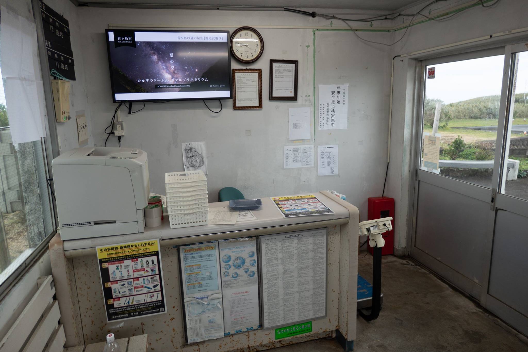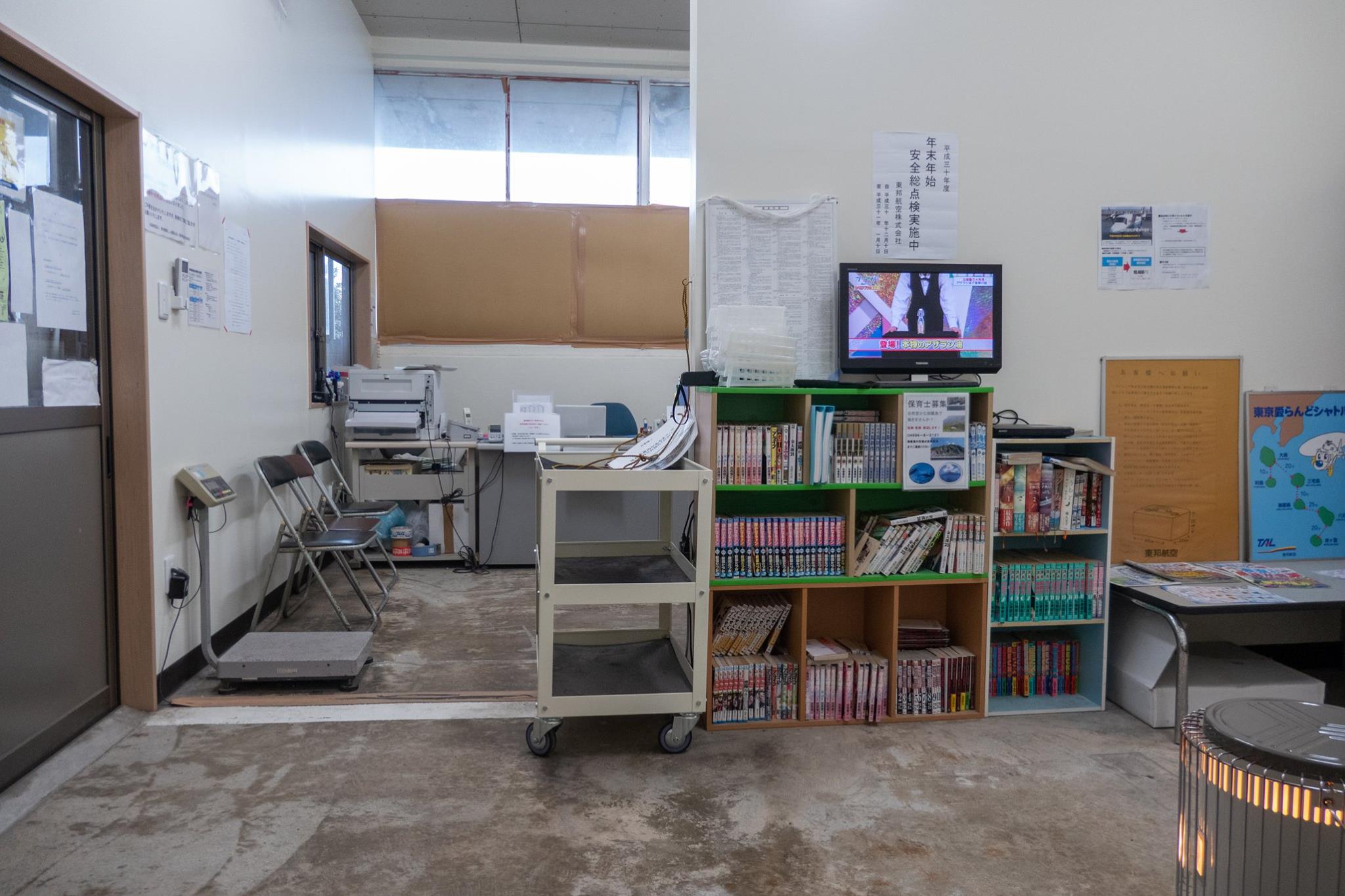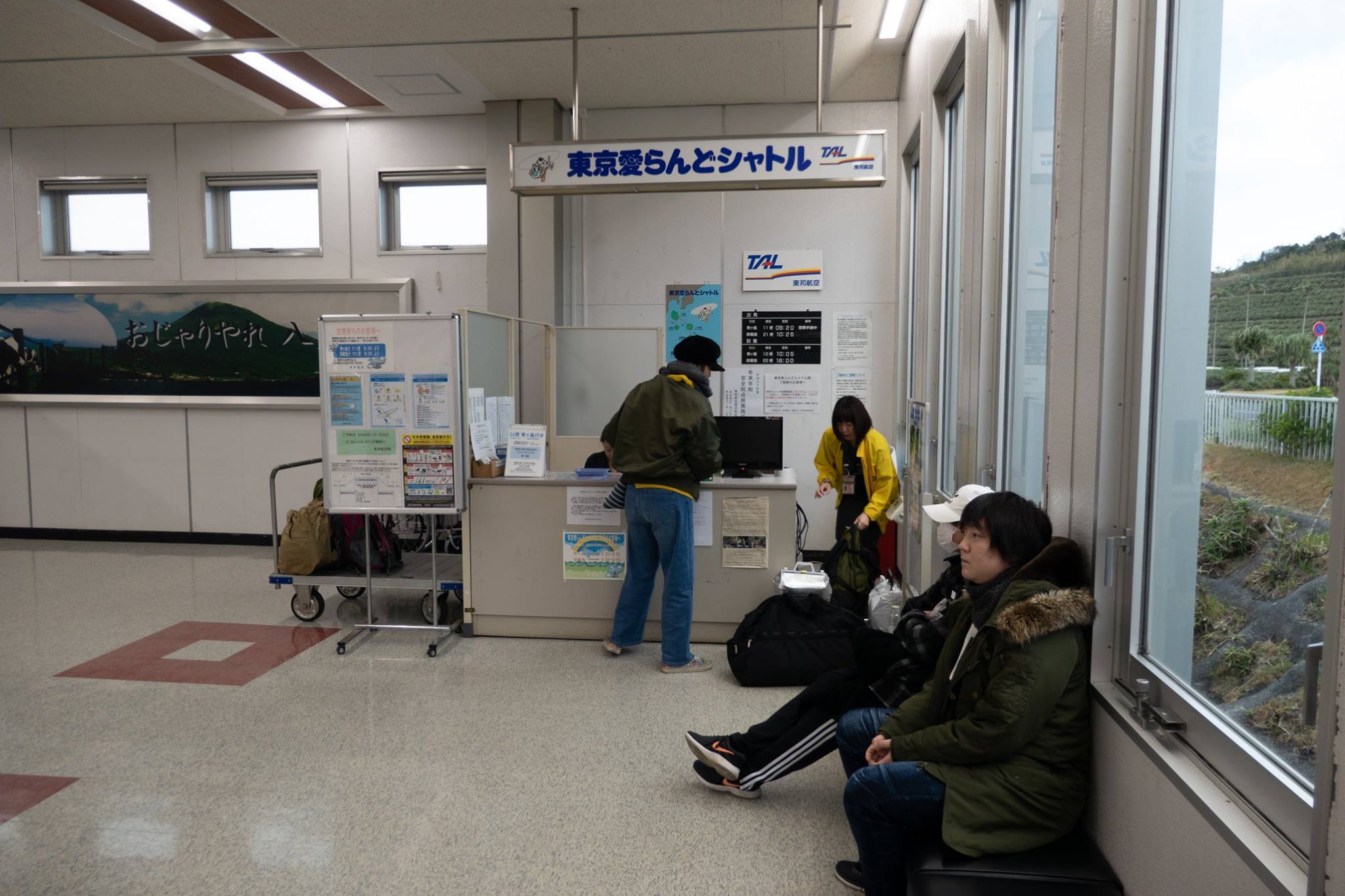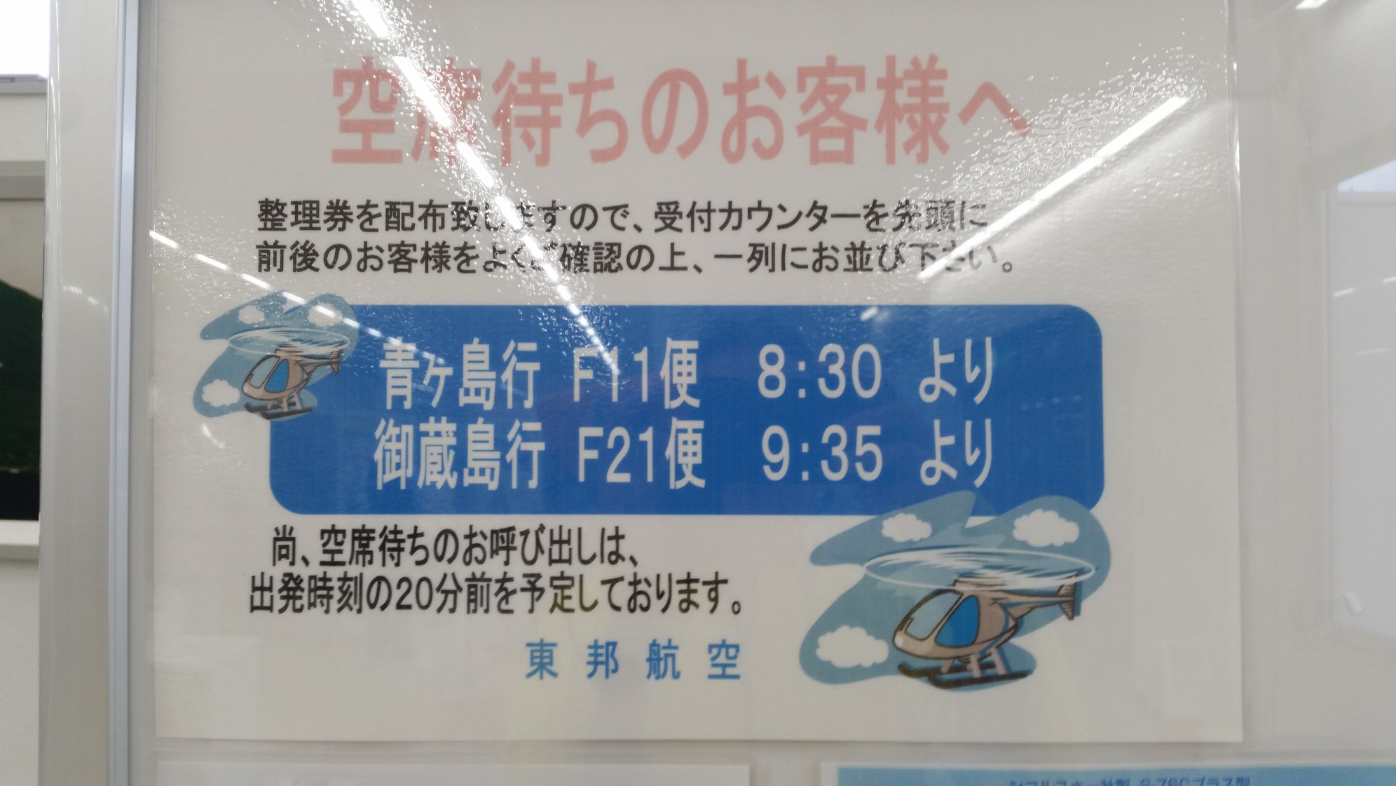 港近くまで下って、再びヘリポートまで登ってくると、ヘリポート地下のアイランドシャトル受付にはもう係員が来ていた。受付はまだ始まっていなかったけど、暖房のきいた建物には入れた。