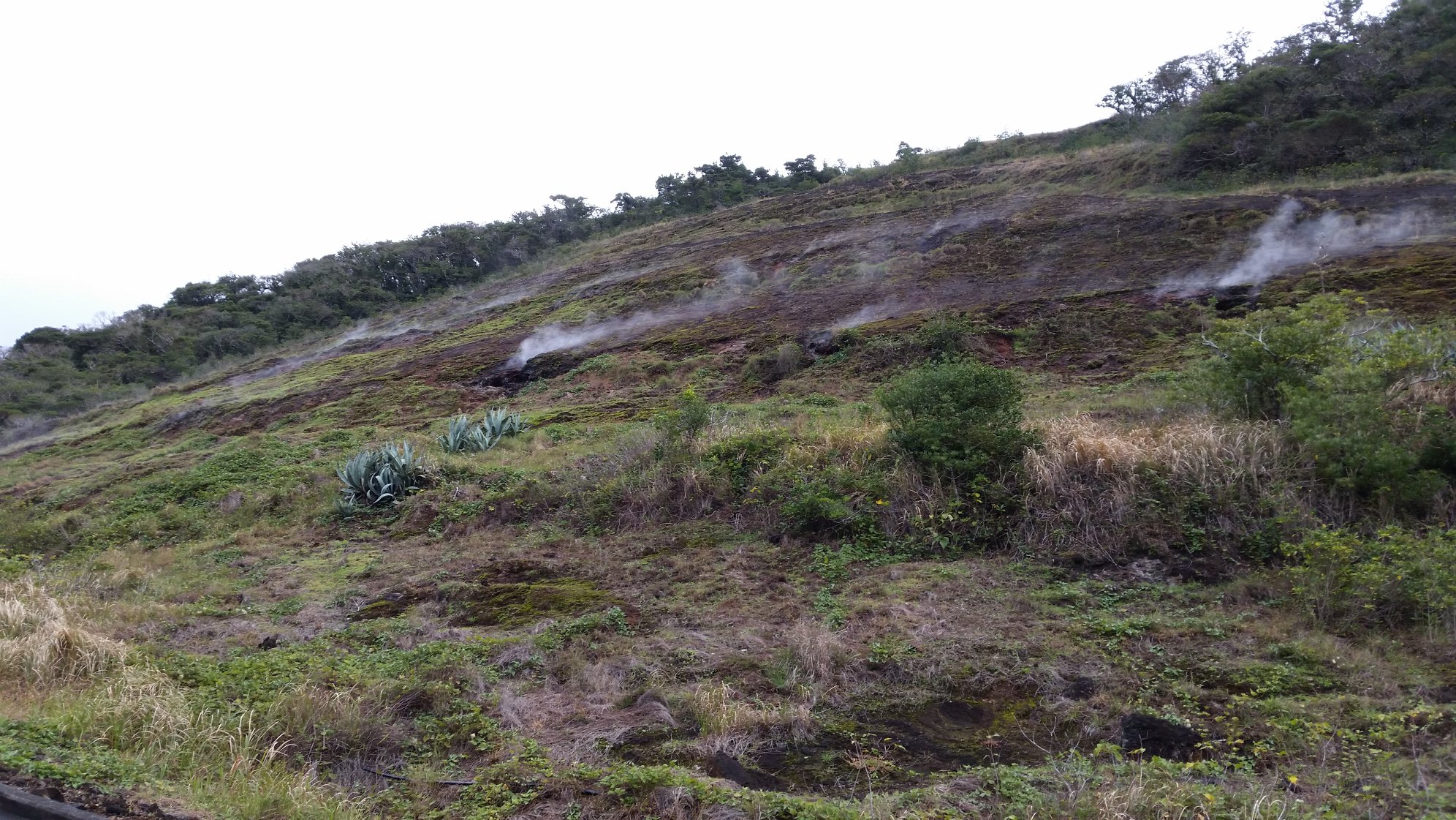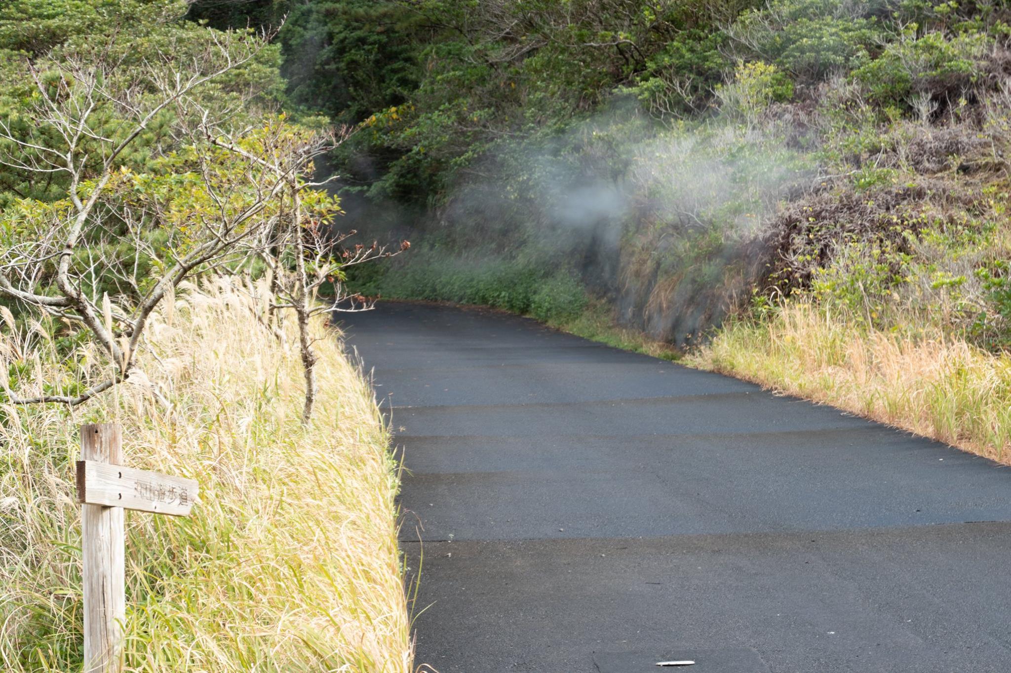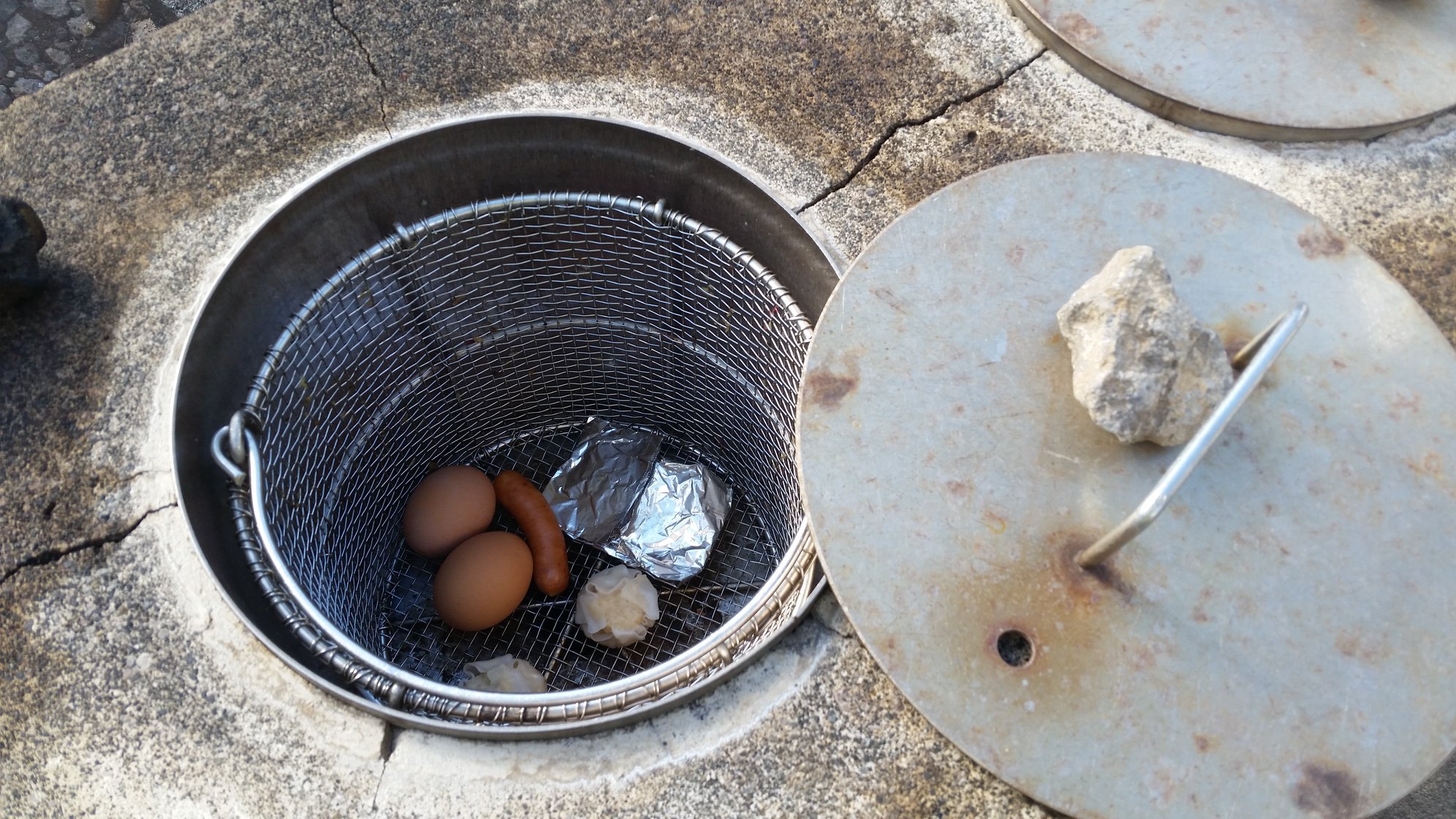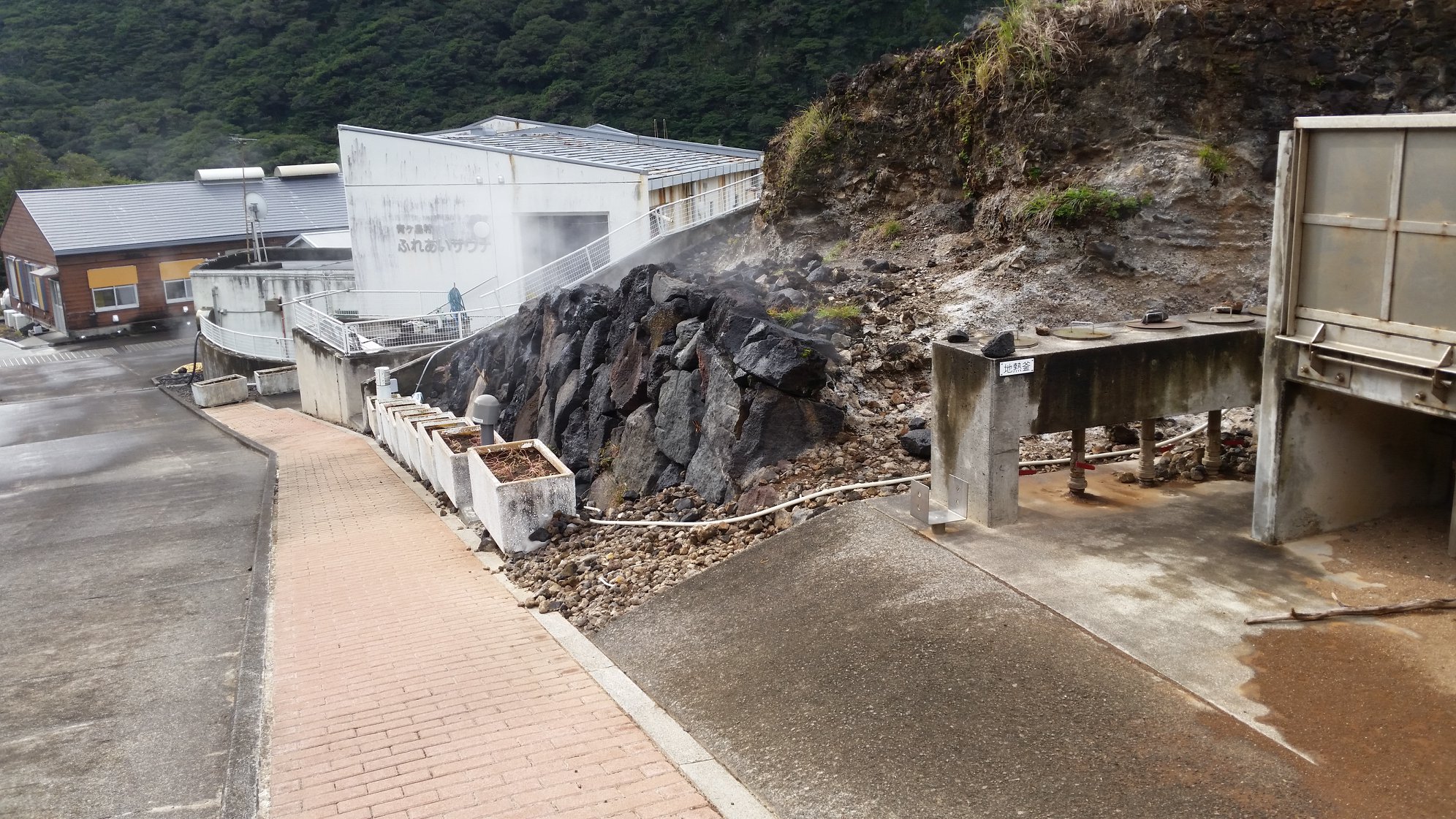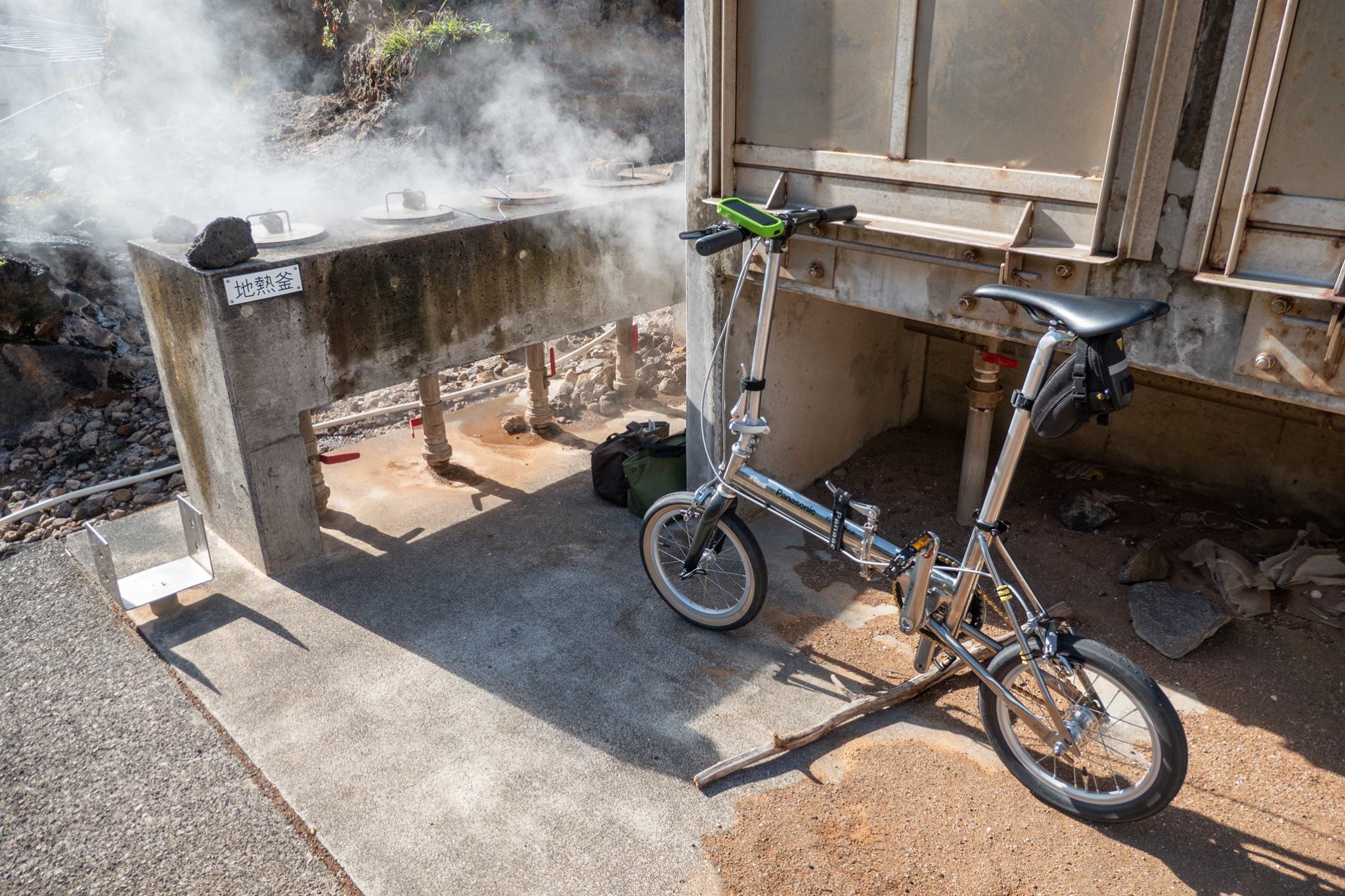 ビジネス宿中里に行き、チェックインして、お昼の地熱釜セットを受け取る。そのまま、車で青ヶ島の内側へ向かう。外輪山の内側を抜け、まずは三宝港までゆく。次いで、ふれあいサウナまで戻り、地熱釜で昼飯の支度をしながら、自転車を組み上げて、付近を少し走る。