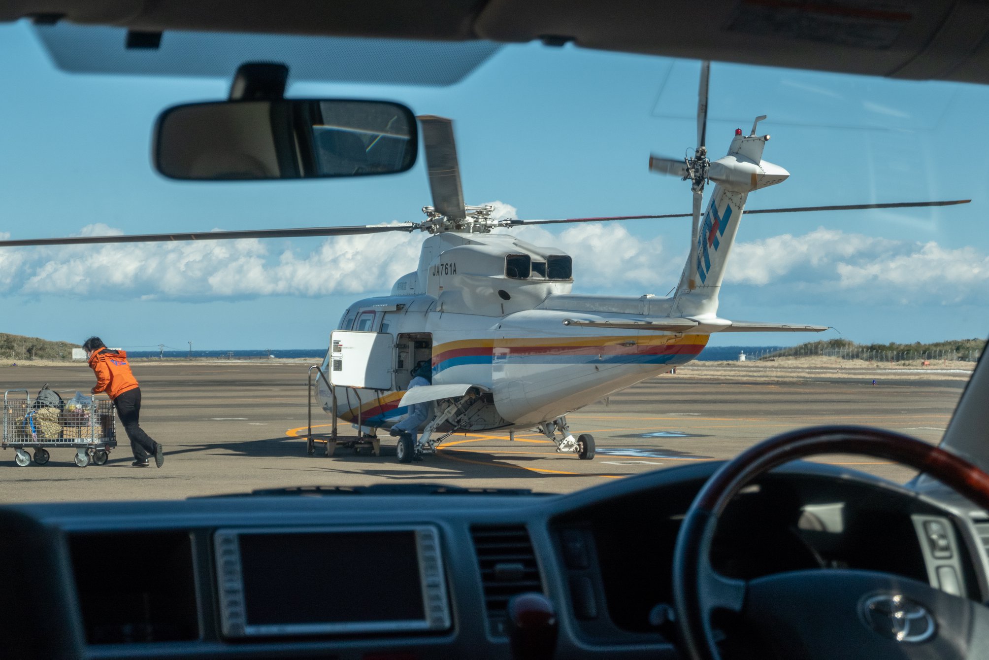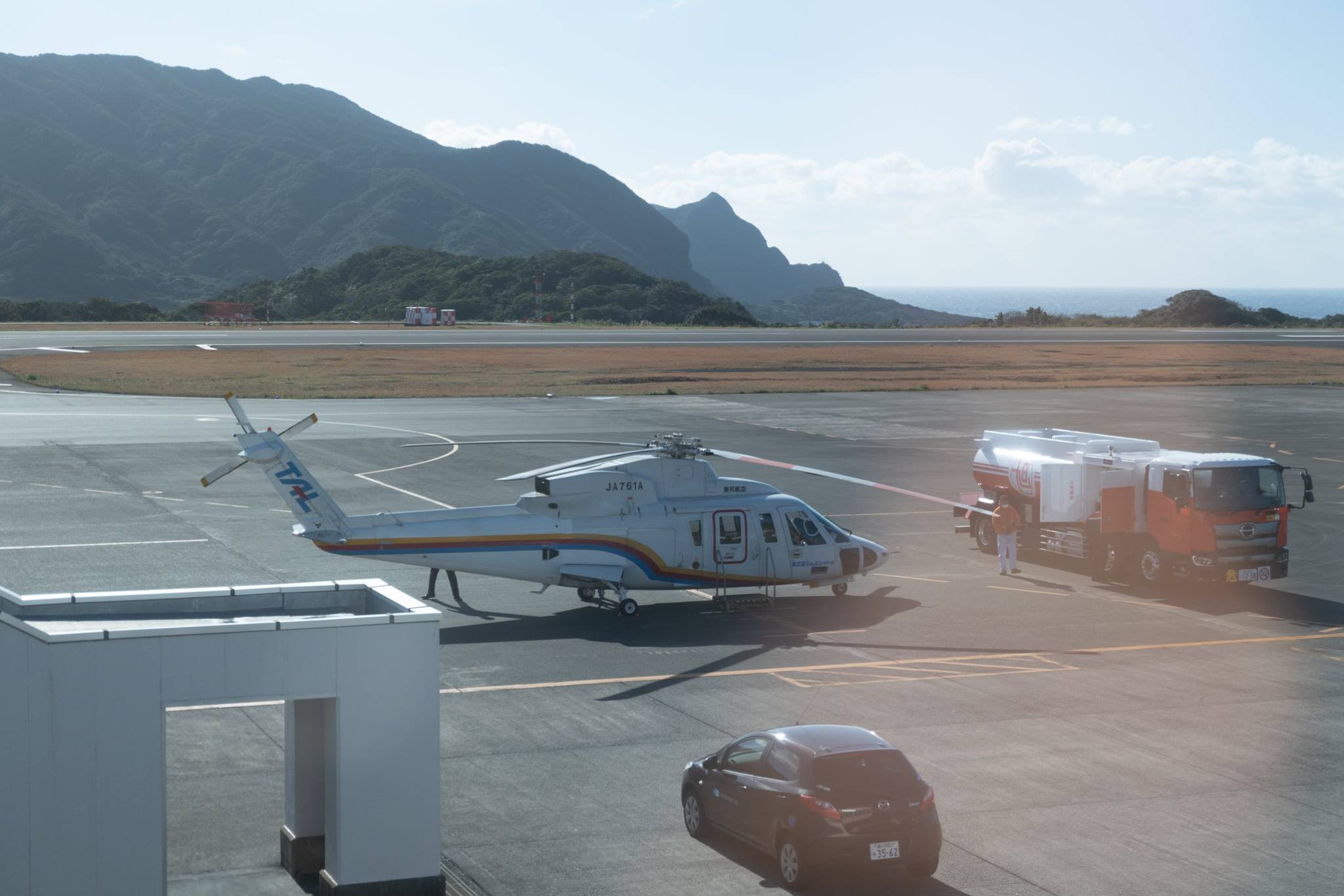 レンタカーを返しにゆき、そこでガソリン補給。そのまま車を運転して、ヘリポートまで行って乗り捨て。ヘリポートで待っている間に、同じ宿だった職人さんと「しまぽ」の話をした。星見物の夫婦二人連れも見送りに来てくれた。彼等はここにもう一泊するという。