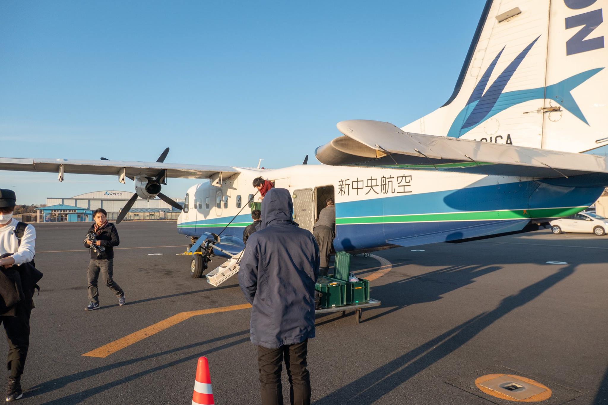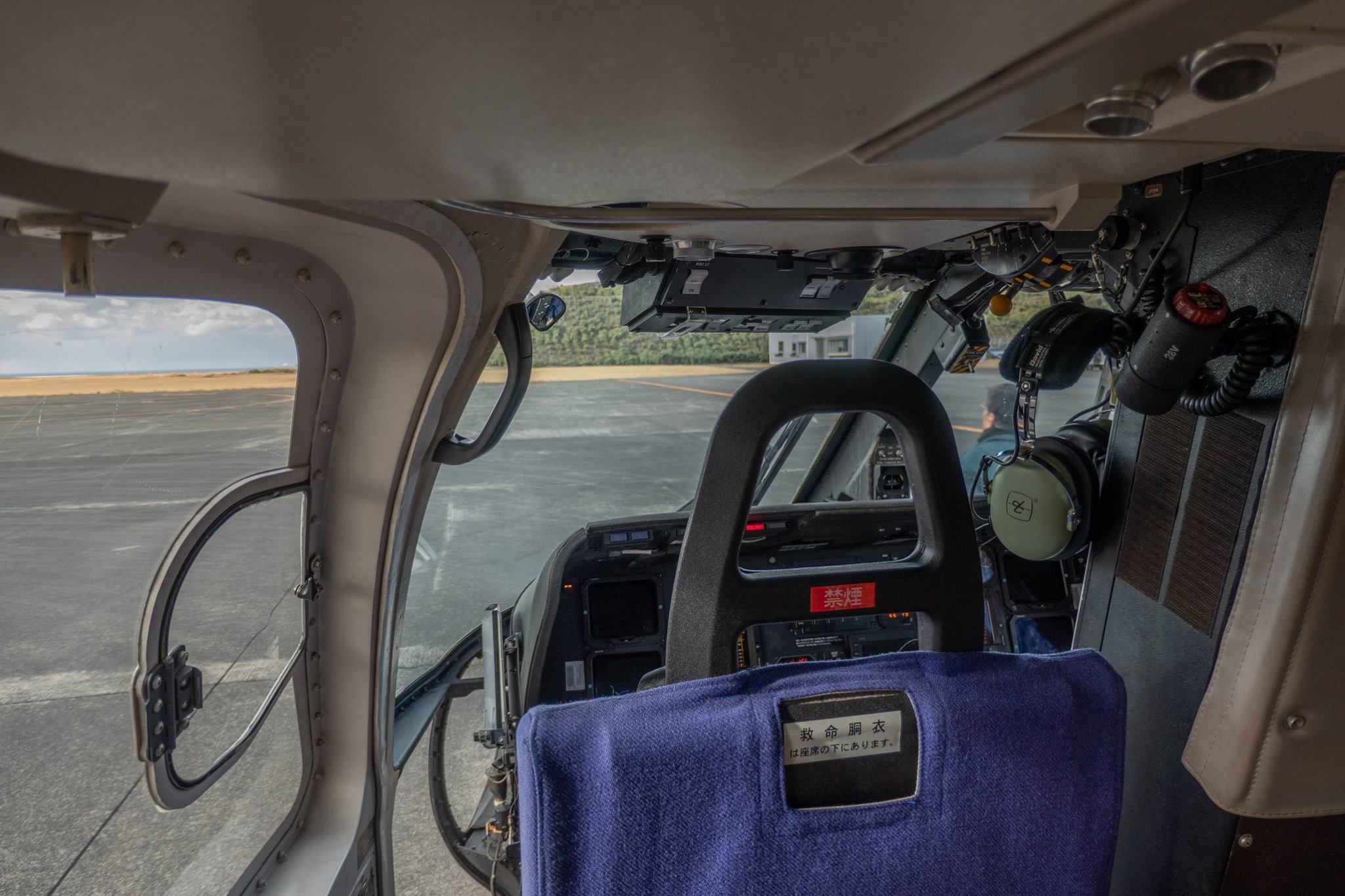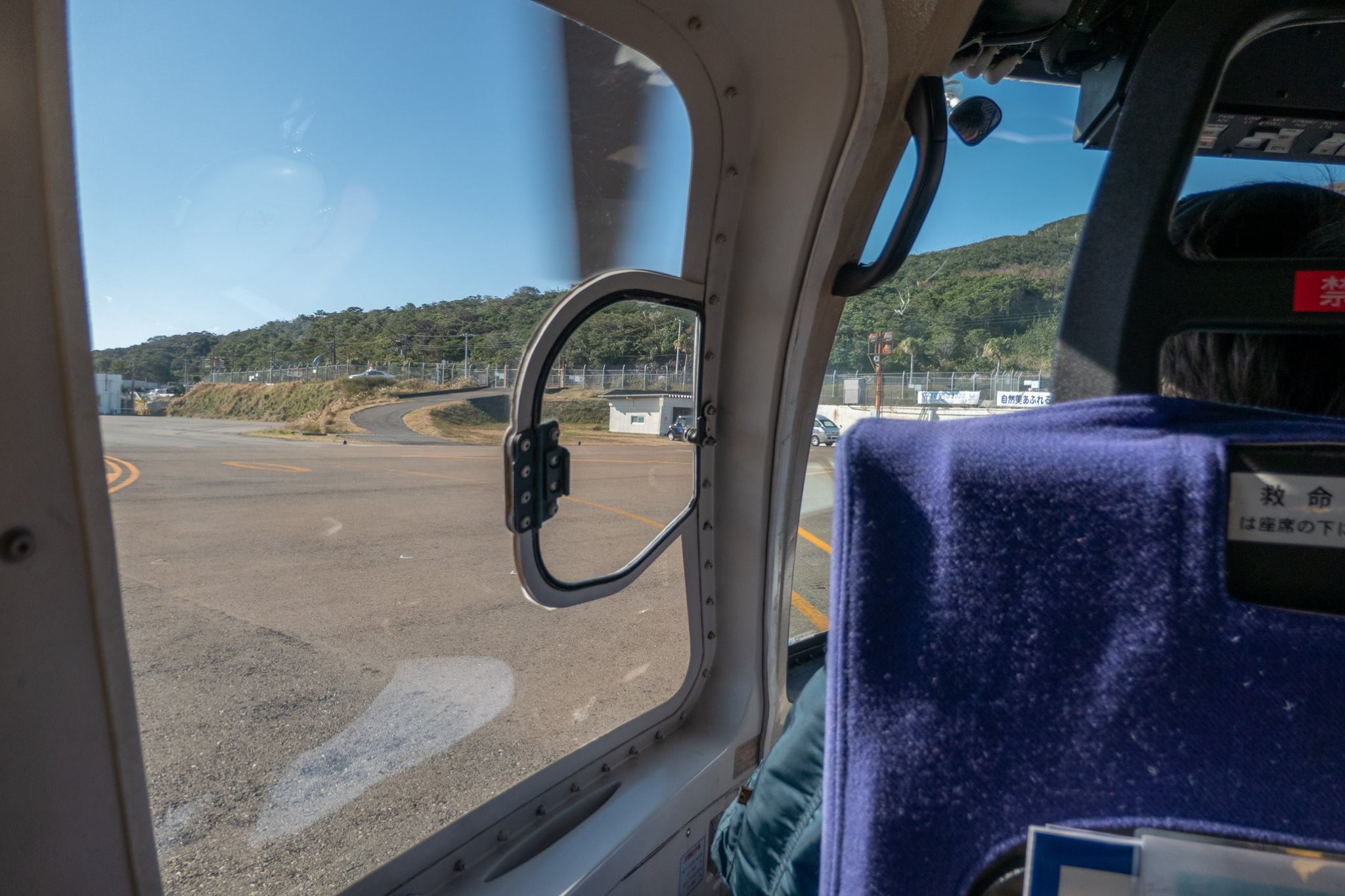 09:00の東京行きANA便の搭乗が完了した後、通常の手荷物検査場を通って、待合室へ進み、階段から滑走路へ下りてヘリに搭乗。このヘリの中から、宿も、「日本中の夜空を見て回っている」という、変わった御夫婦と一緒だった。