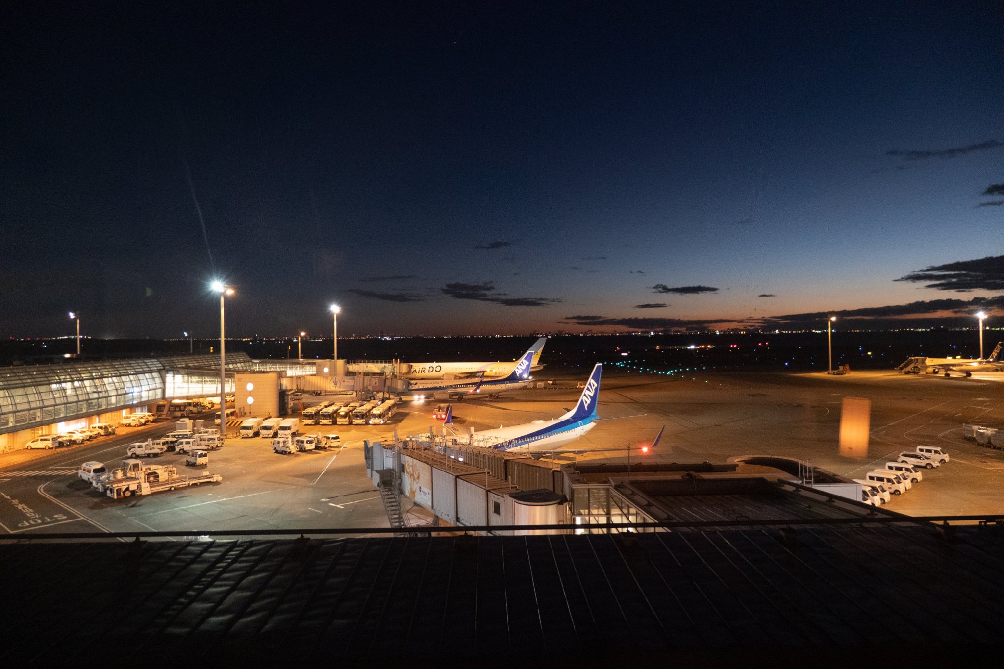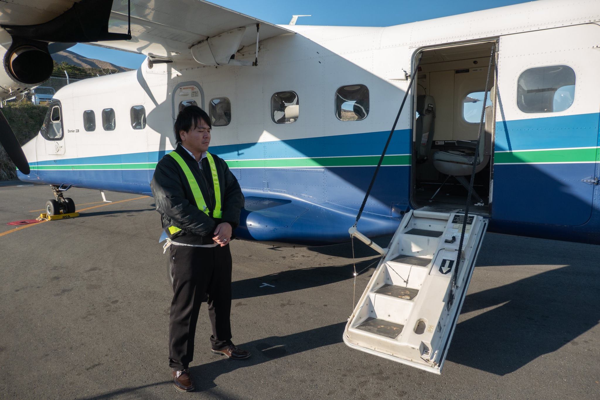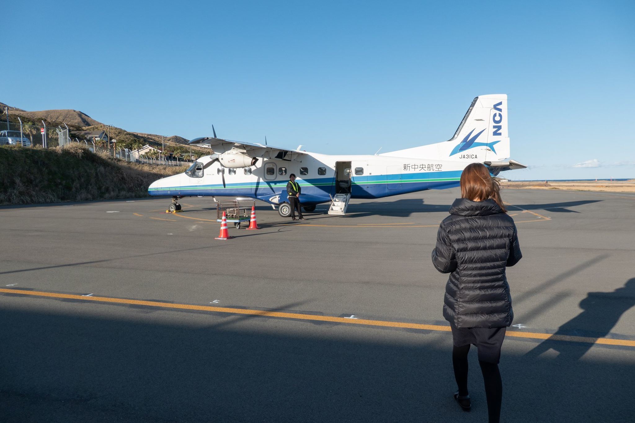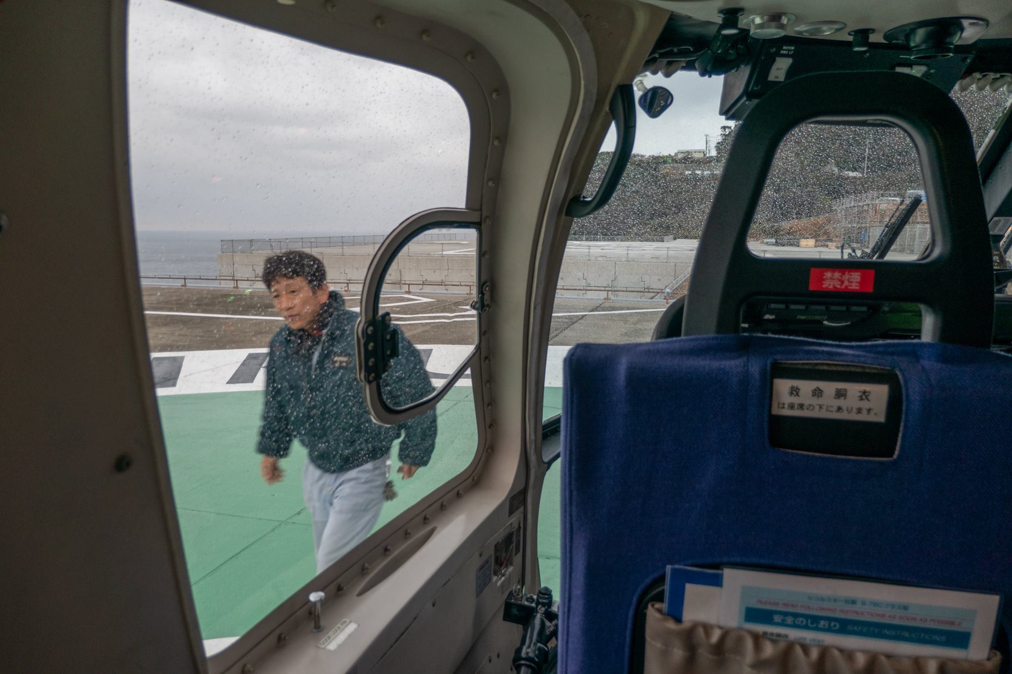 09:00の東京行きANA便の搭乗が完了した後、通常の手荷物検査場を通って、待合室へ進み、階段から滑走路へ下りてヘリに搭乗。このヘリの中から、宿も、「日本中の夜空を見て回っている」という、変わった御夫婦と一緒だった。