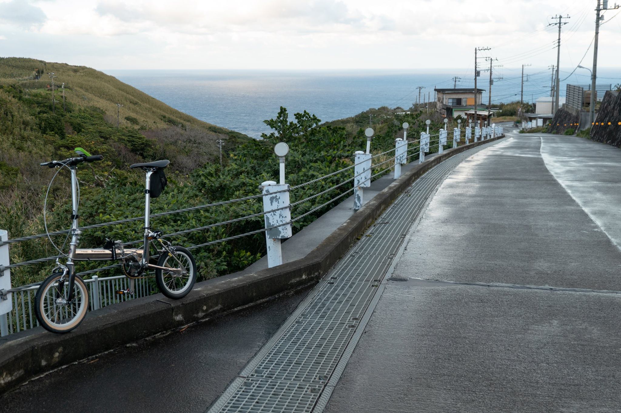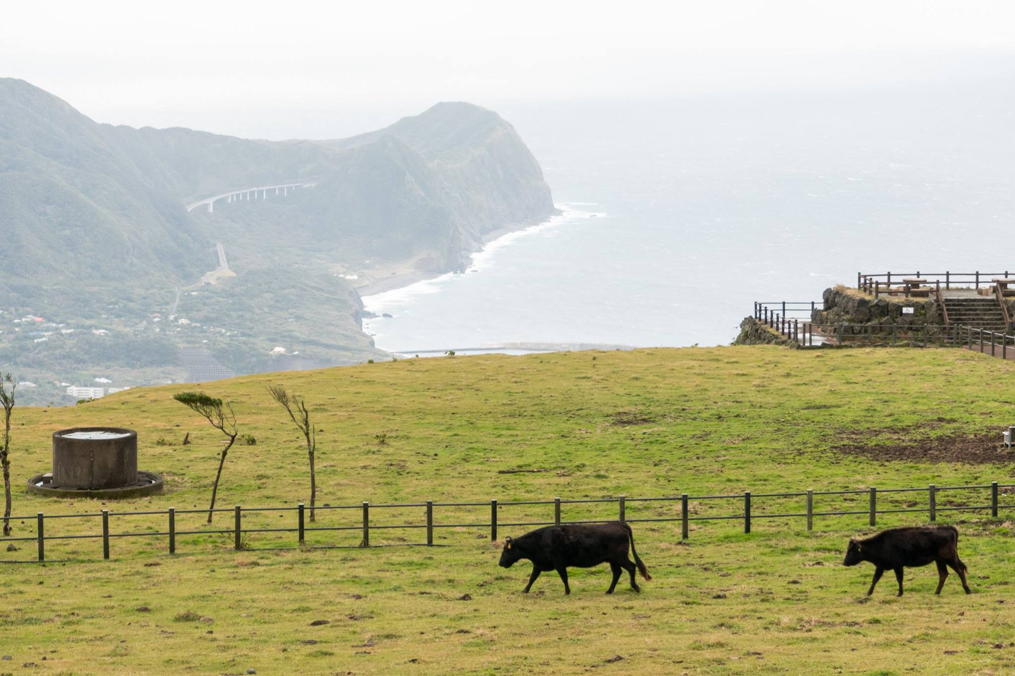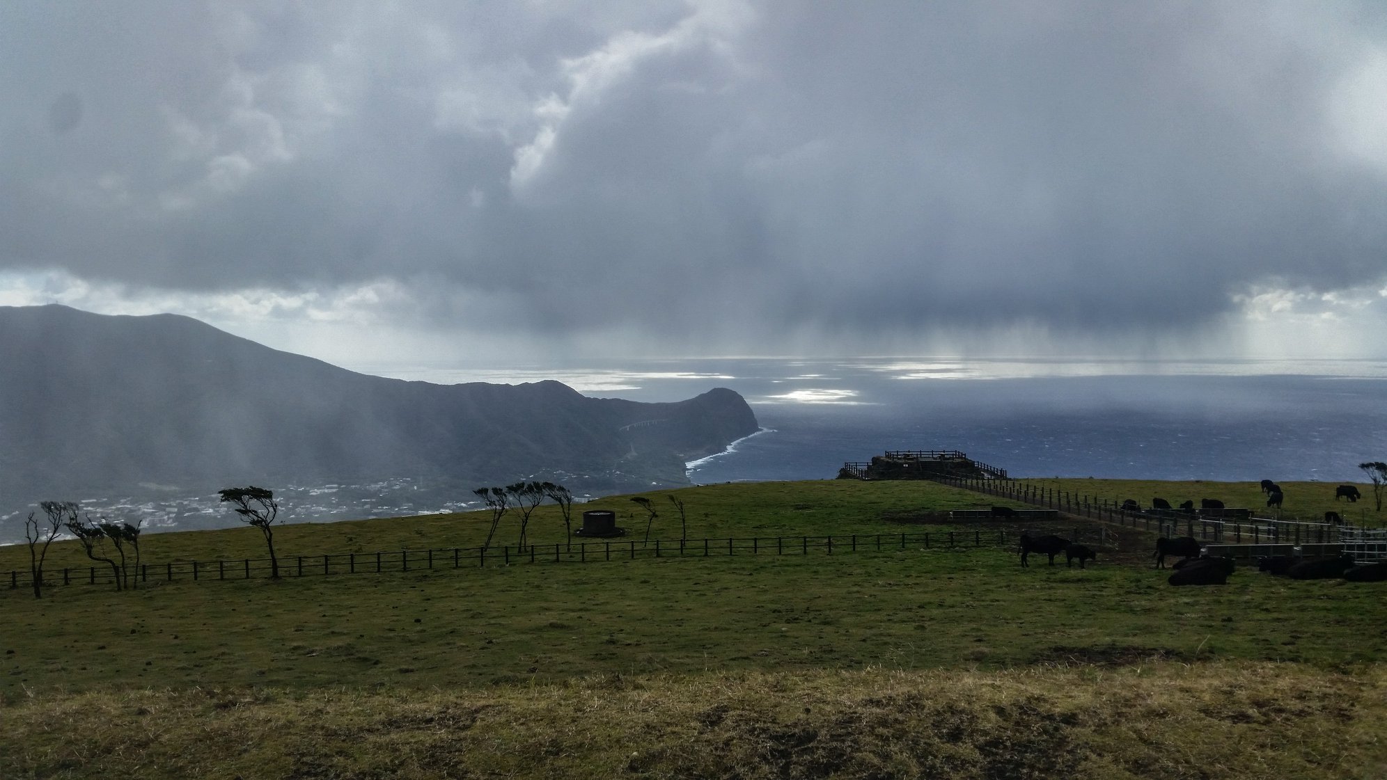 大越鼻灯台から八丈富士を巡る道路に登り、八丈富士牧野ふれあい牧場近くで、自転車に乗るが、急に風雨が強まり、すぐに車に戻る。