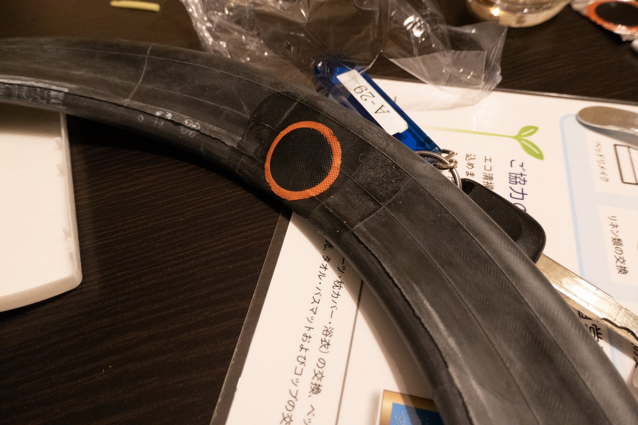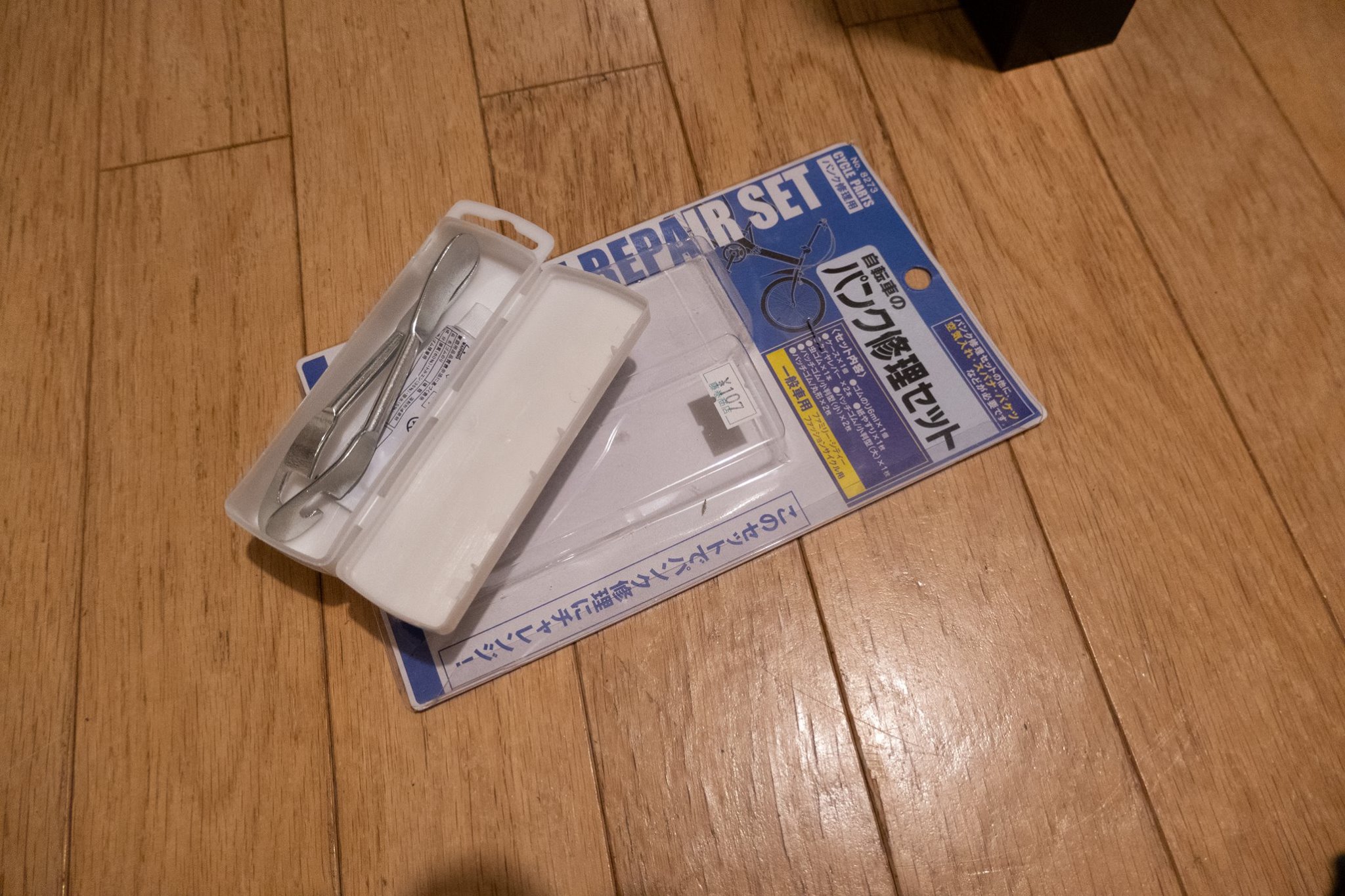 駐車場をでて、藤巻商店へ向かい、バーストしたタイヤにパッチするための材料やハサミなどを買う。