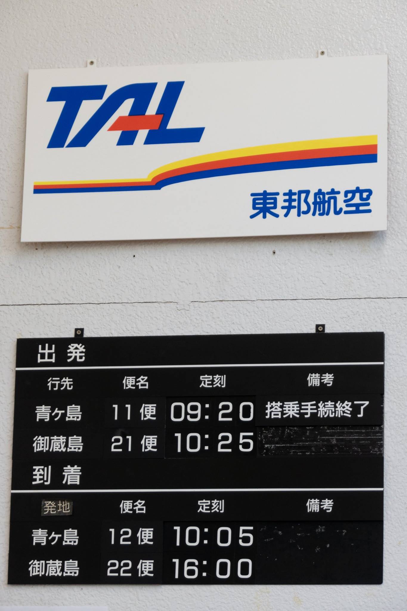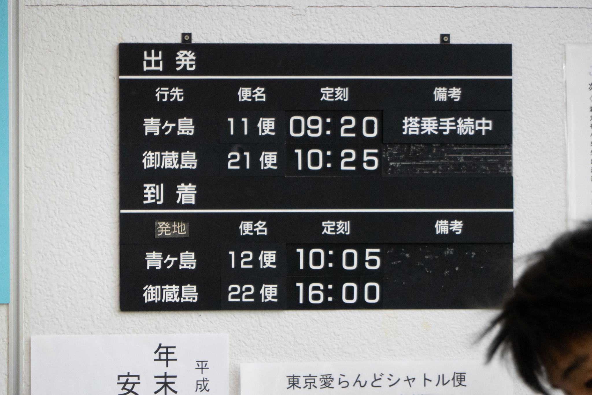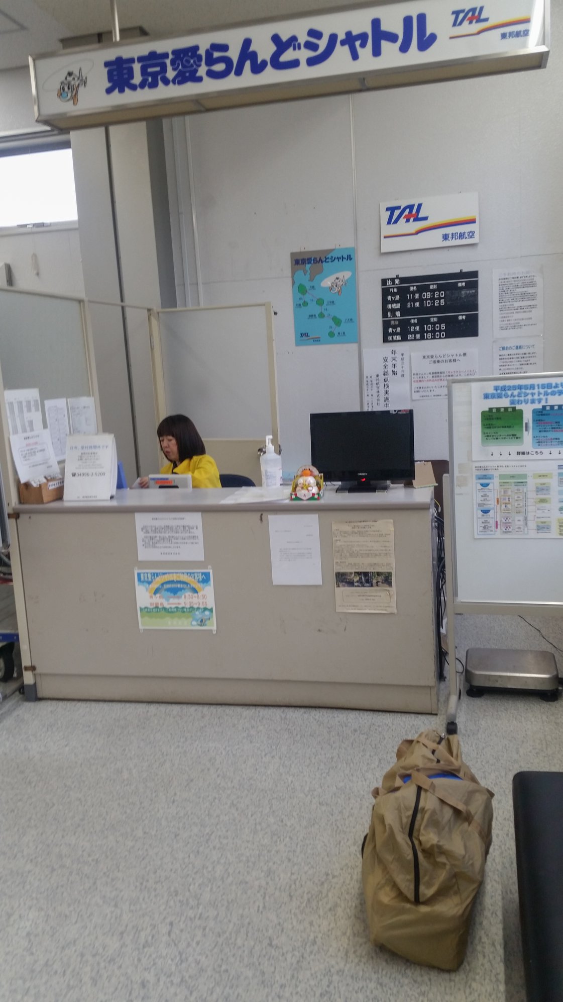 愛らんどシャトルはまだ、青ヶ島行きの受付中。120CMがヘリに積める荷物の長さの限度のようで、釣り竿をもったクセのある若者が断られ、カウンターに釣り竿を預かってもらって出発していた。へんなプロレスラーみたいは浮浪者キャラや、ちょっとクセのある女の子たちもいた。やはり観光で青ヶ島行こうなんてやつらはちょっと変だ。