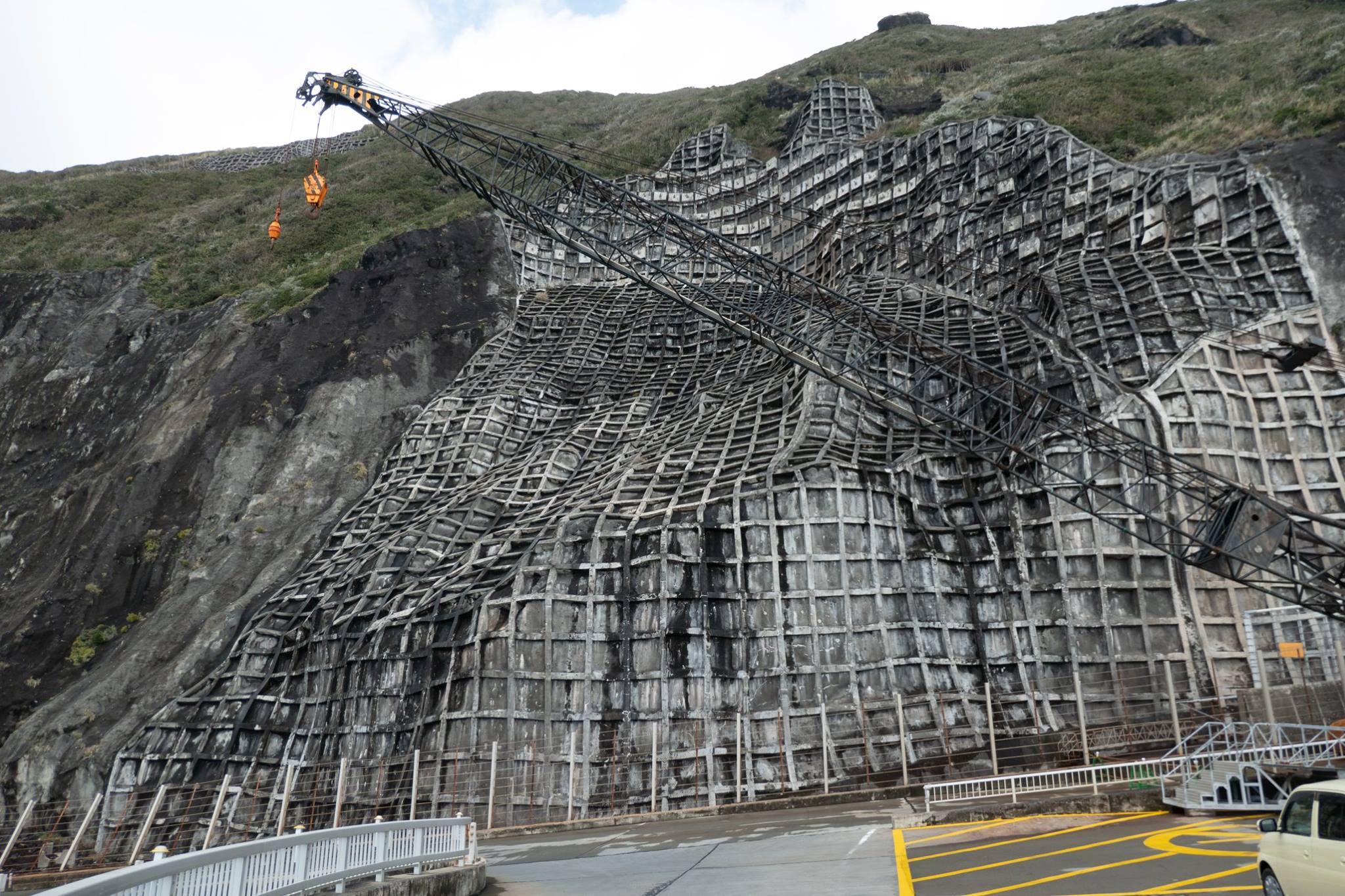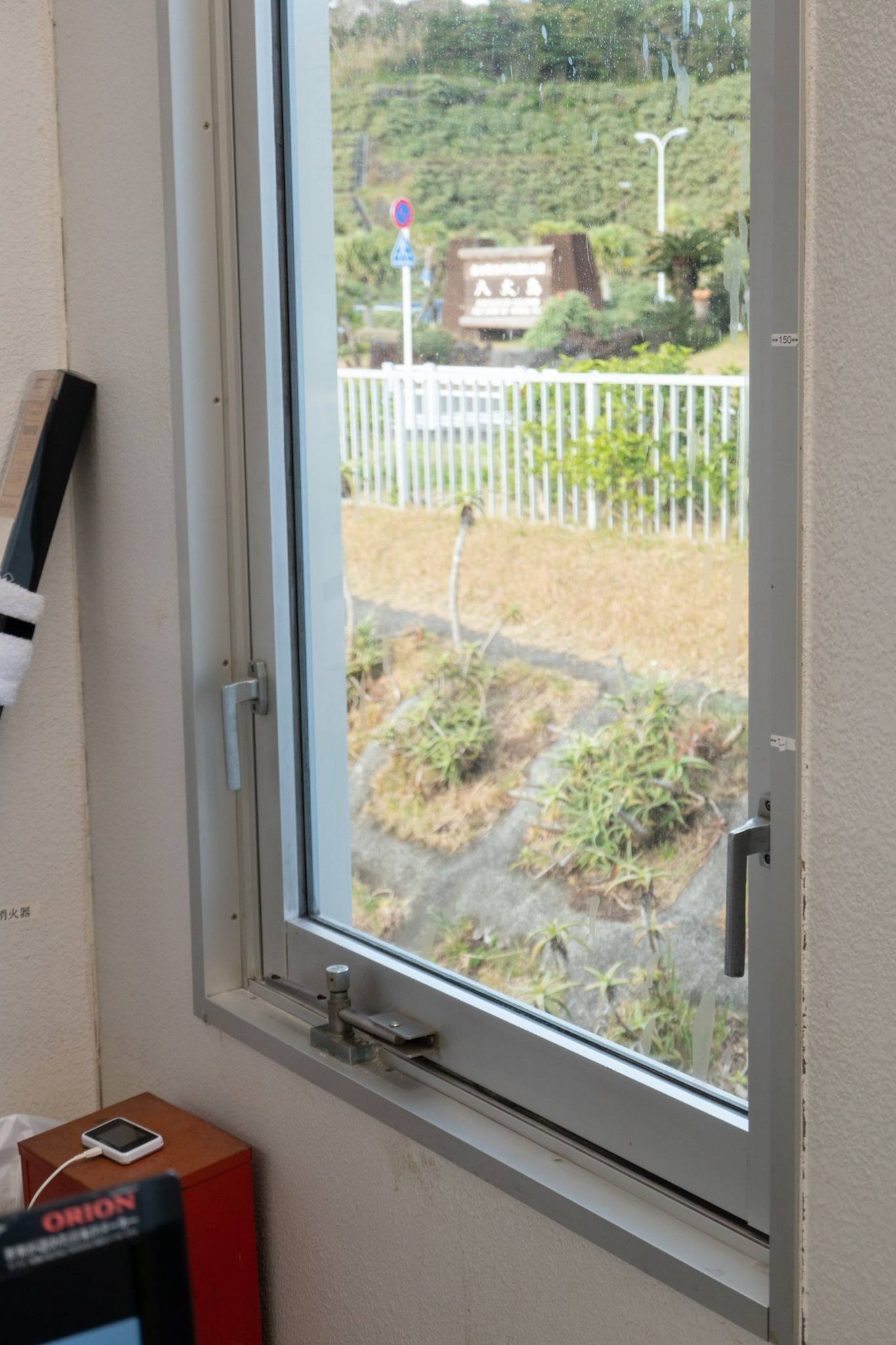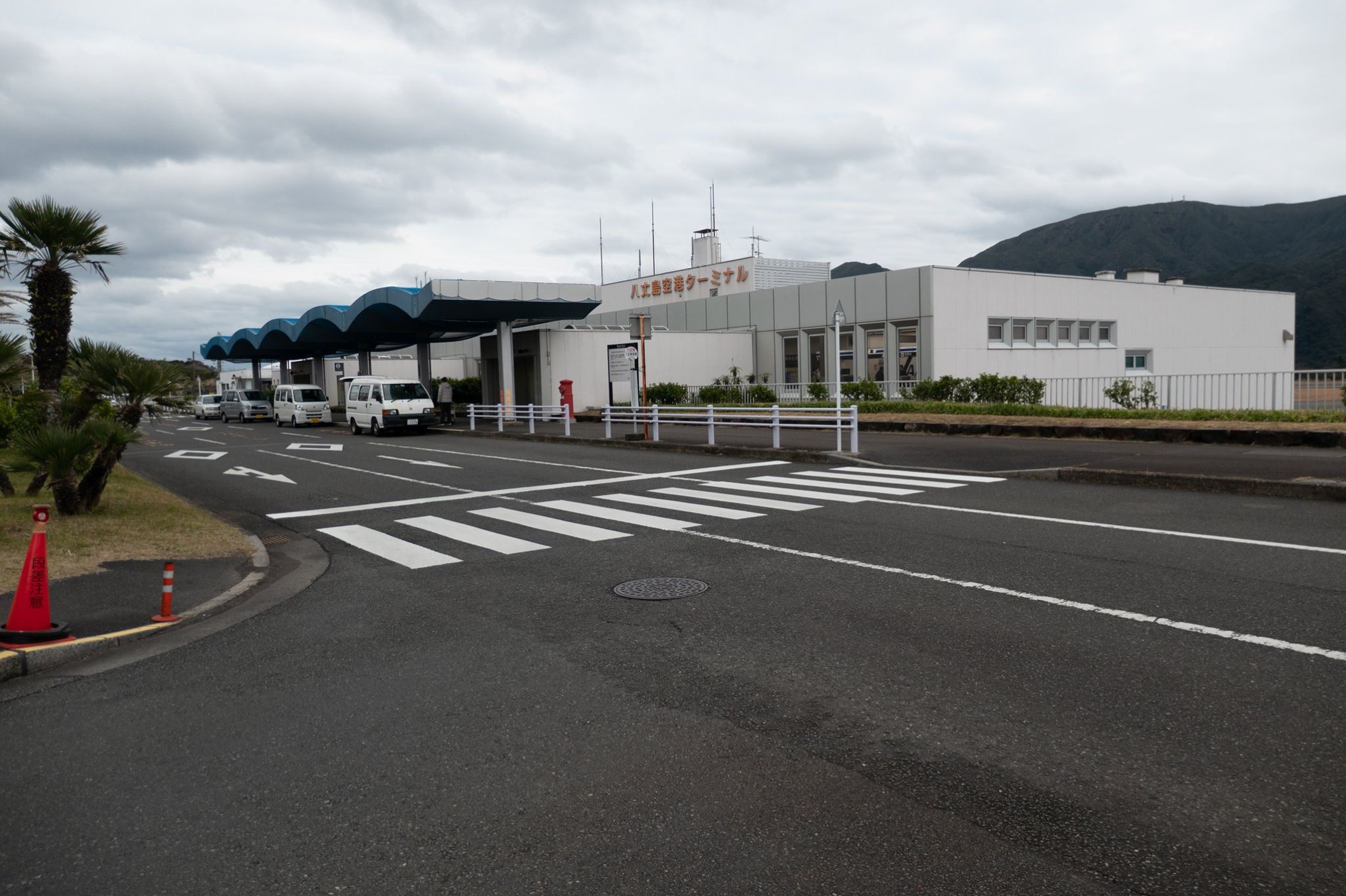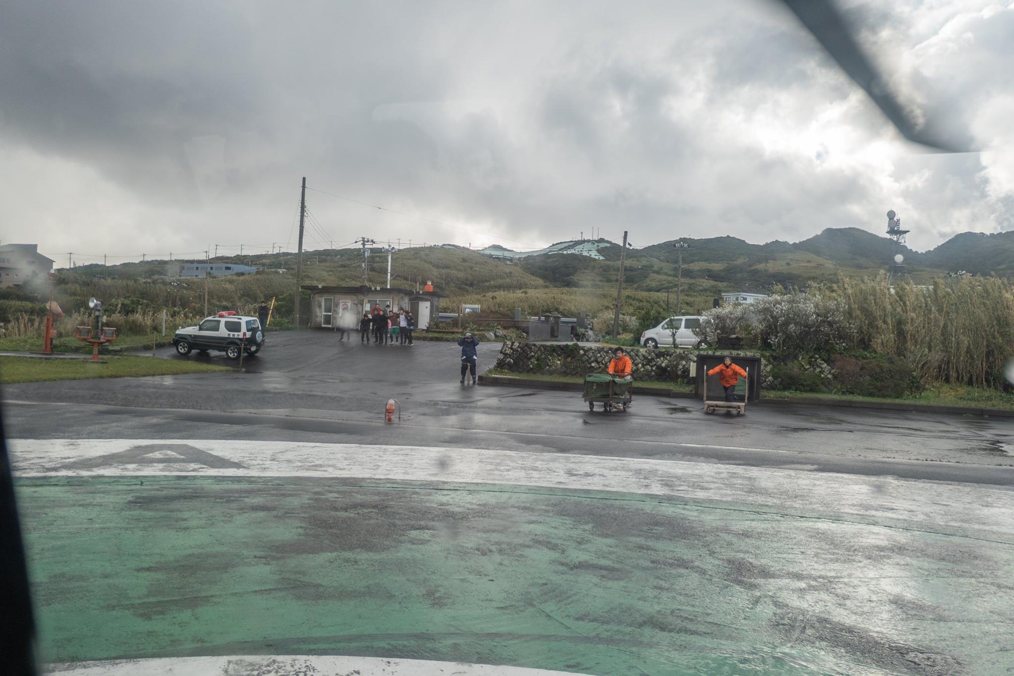 青ヶ島ヘリポートに着くと、雨。レンタカー屋さんのご主人がヘリポートの建物に居た。レンタルする軽自動車はヘリポート脇の駐車場に置かれていた。先ほどの夫妻とともに、レンタカー屋のオヤジの後ろについて。3台連なって運転して、青ヶ島整備工場の事務所でレンタル手続き。