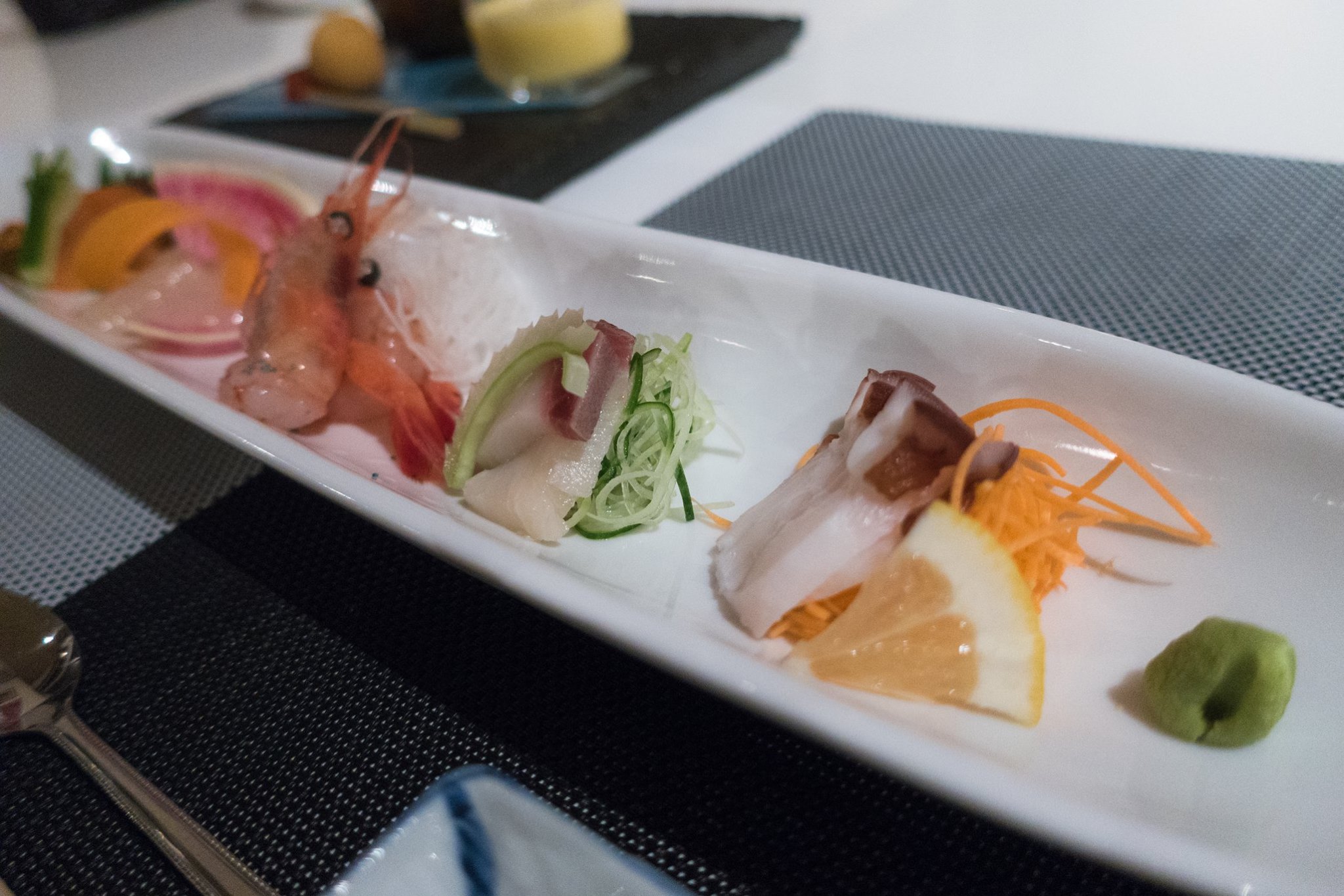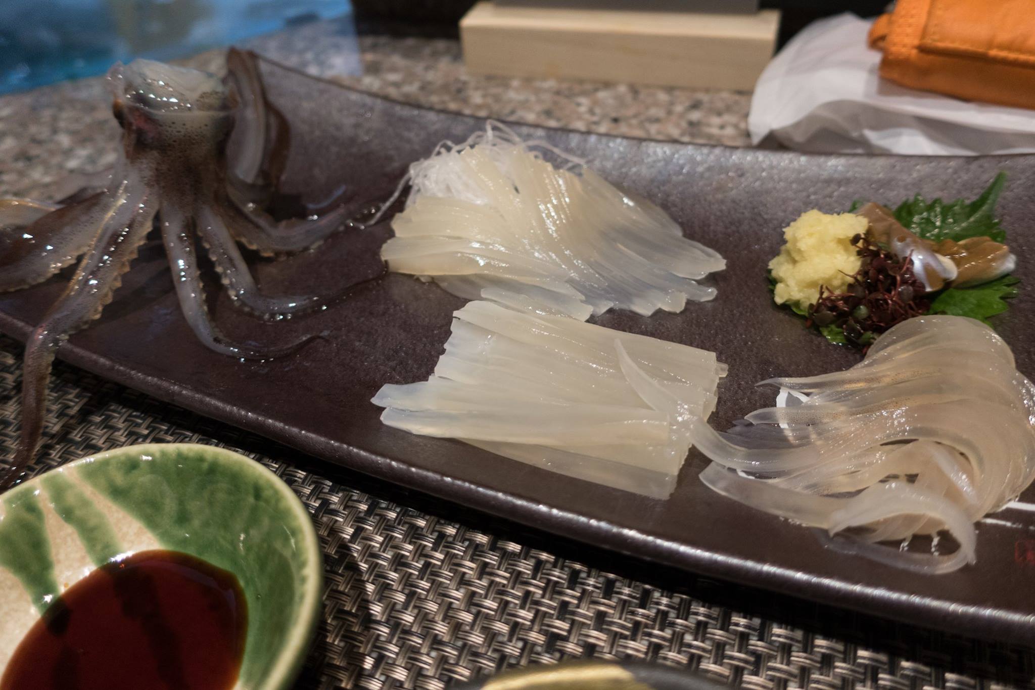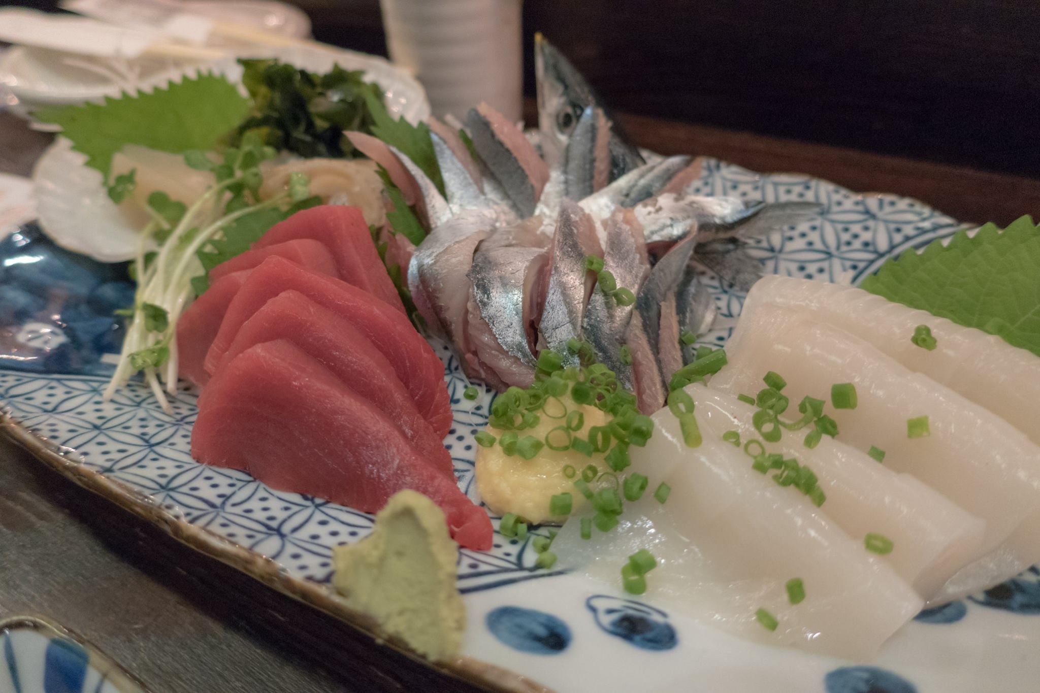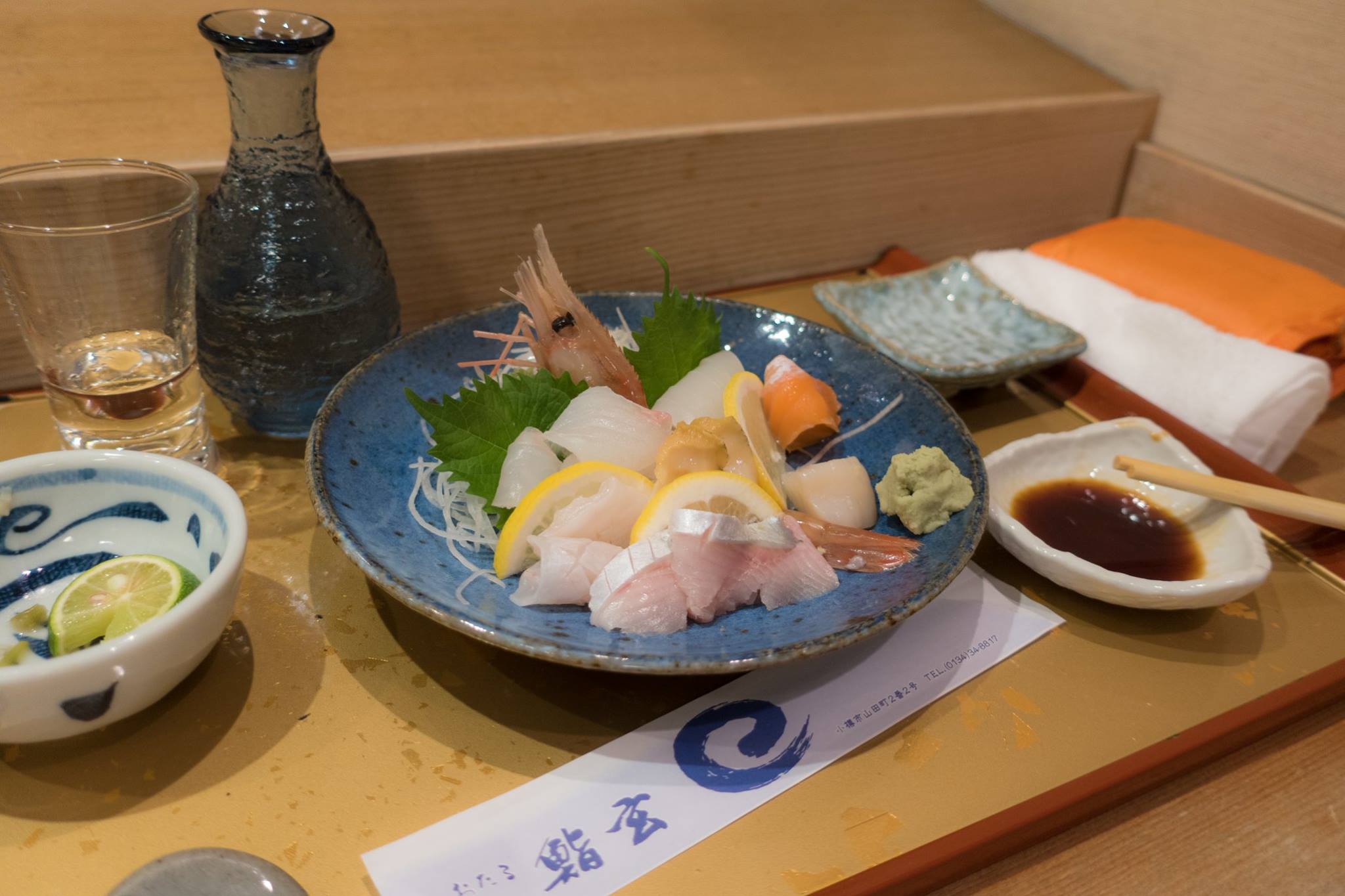 15:00という、すっごく半端な時間なのに、「政寿司」とやらを訪ねてみたら、なんと1時間待てと言われて、はいさよなら。寿司屋どおりで空いてる、小さな店で、ゆっくり酒と刺し盛りをいただく。