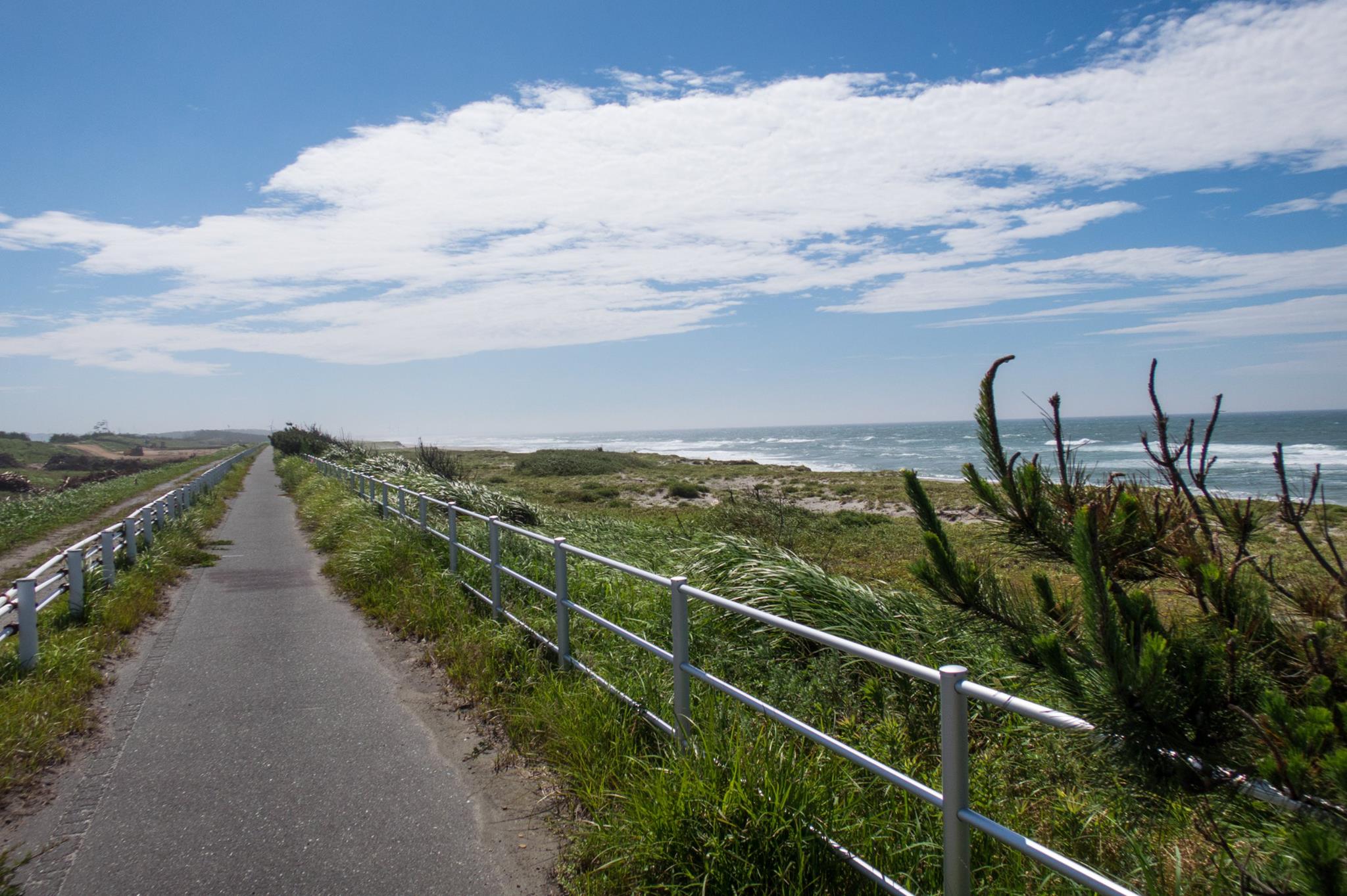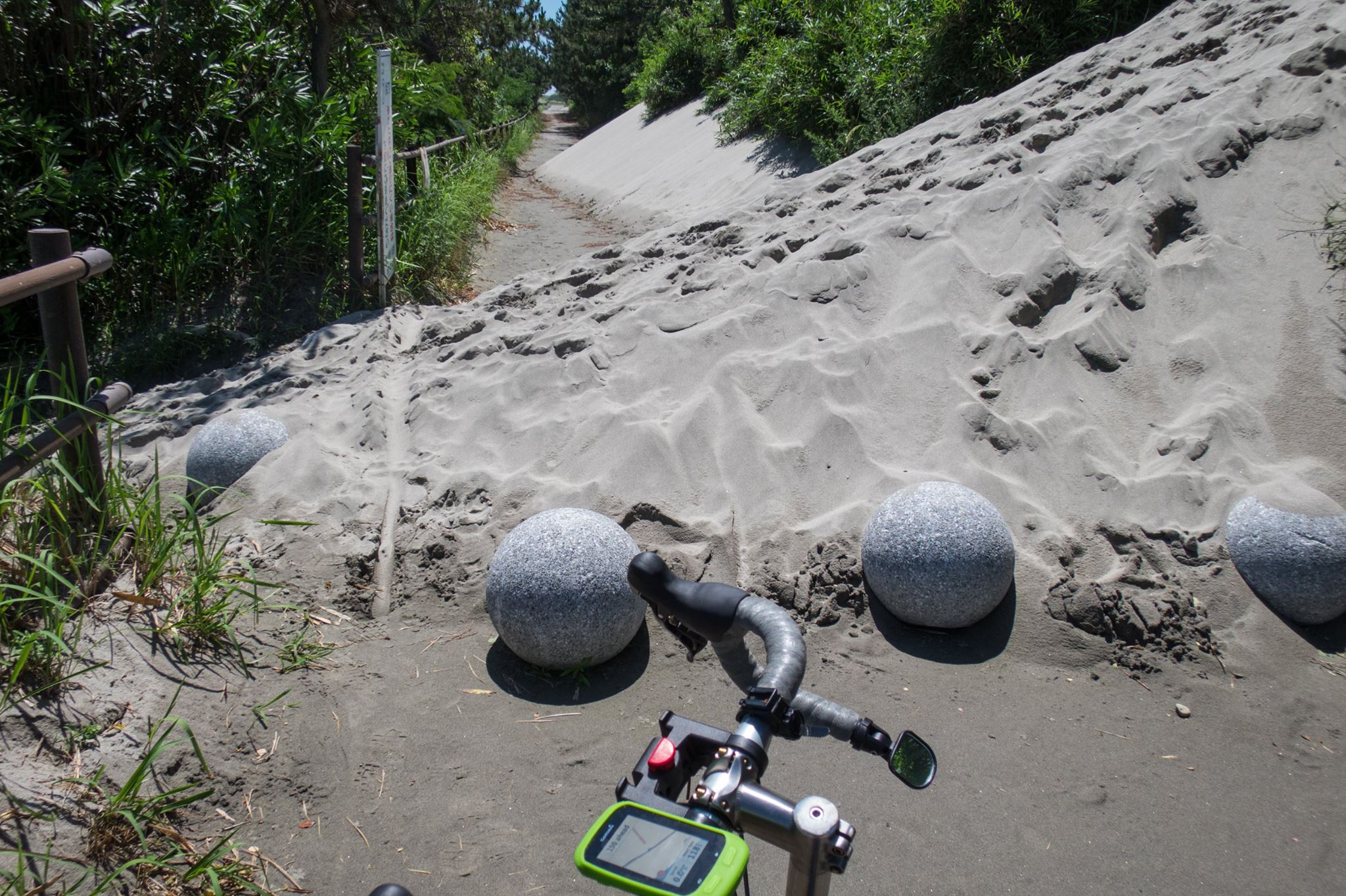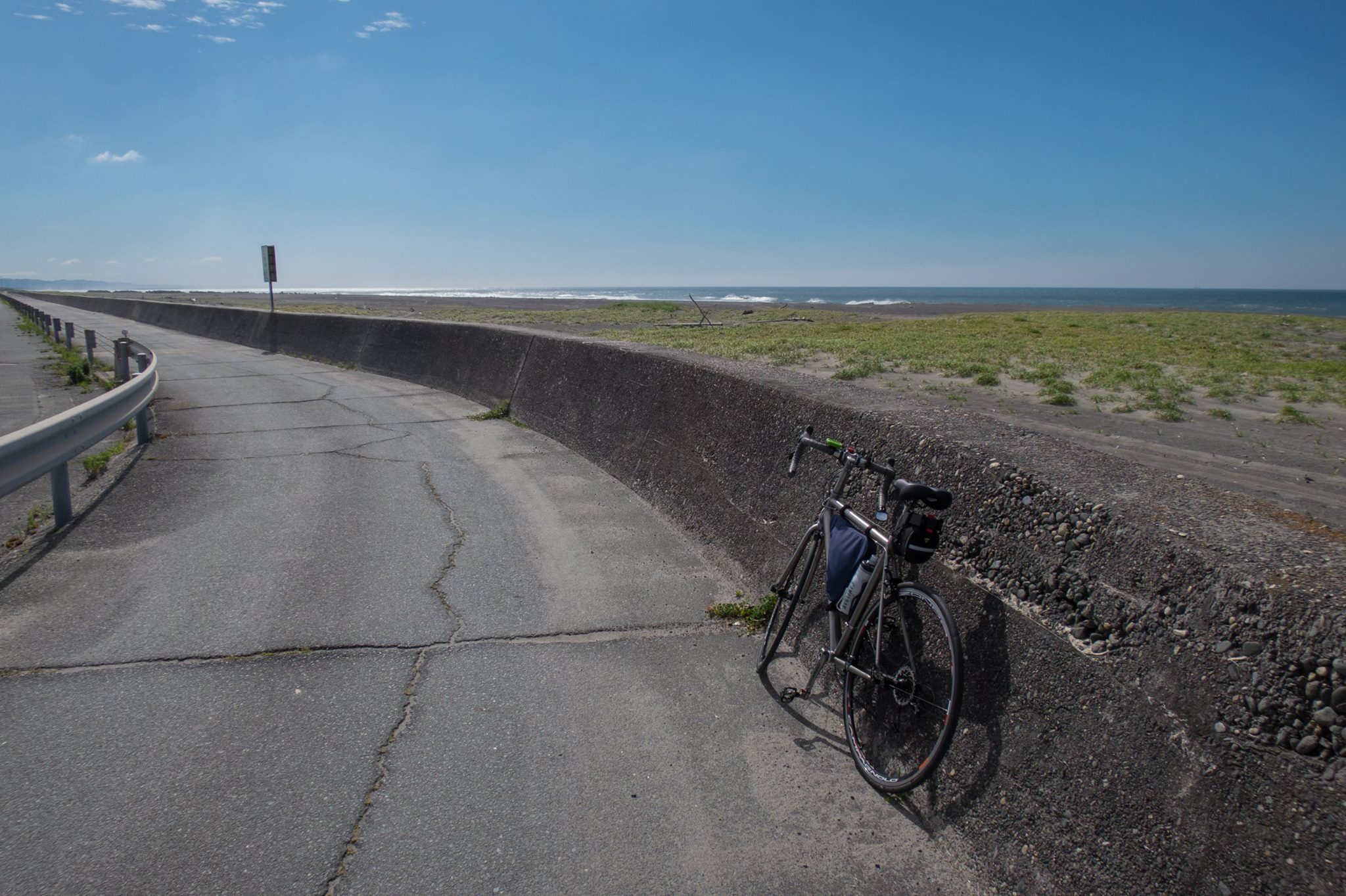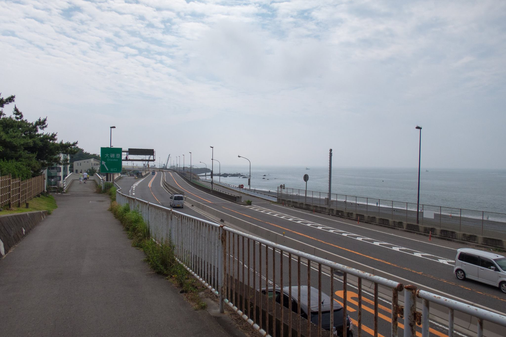 R1を走り、大磯の吉田邸脇から、西湘バイパス沿いの太平洋岸自転車道にでるが、間も無く道は終わる。大磯海岸は大渋滞。