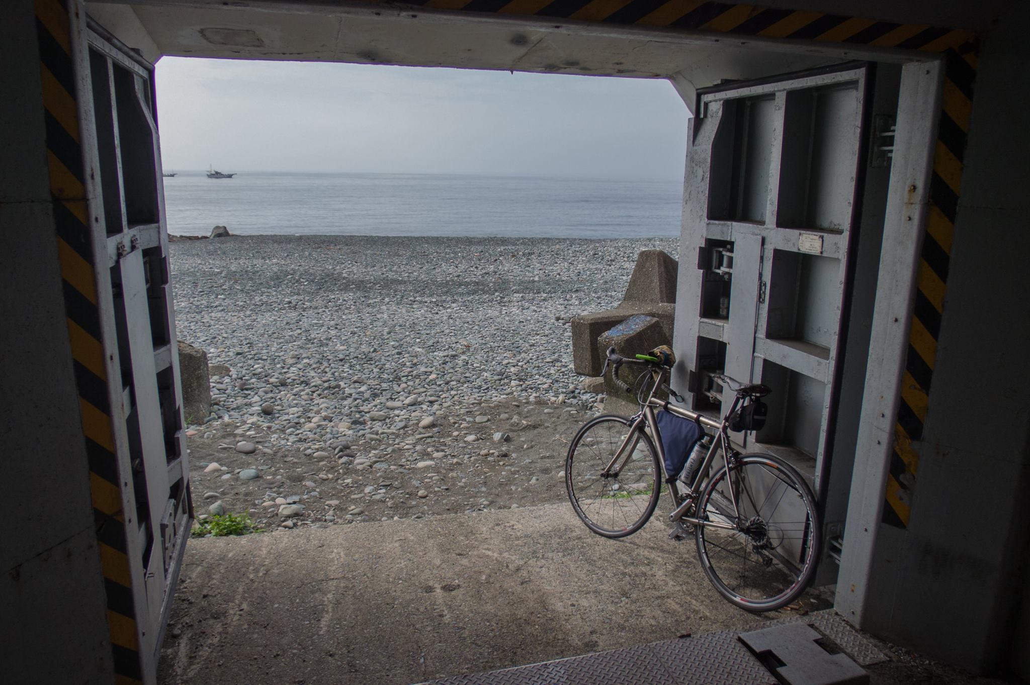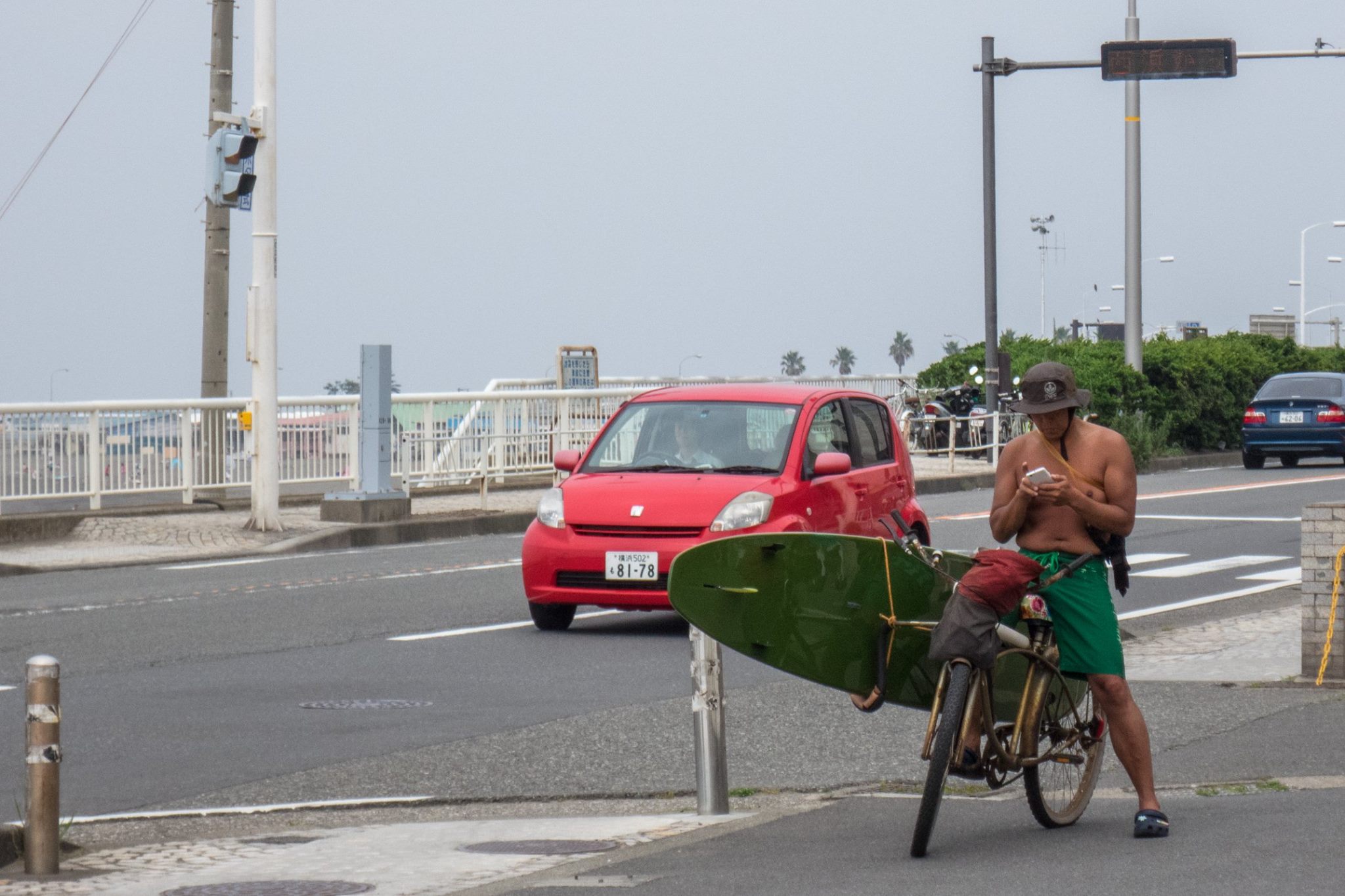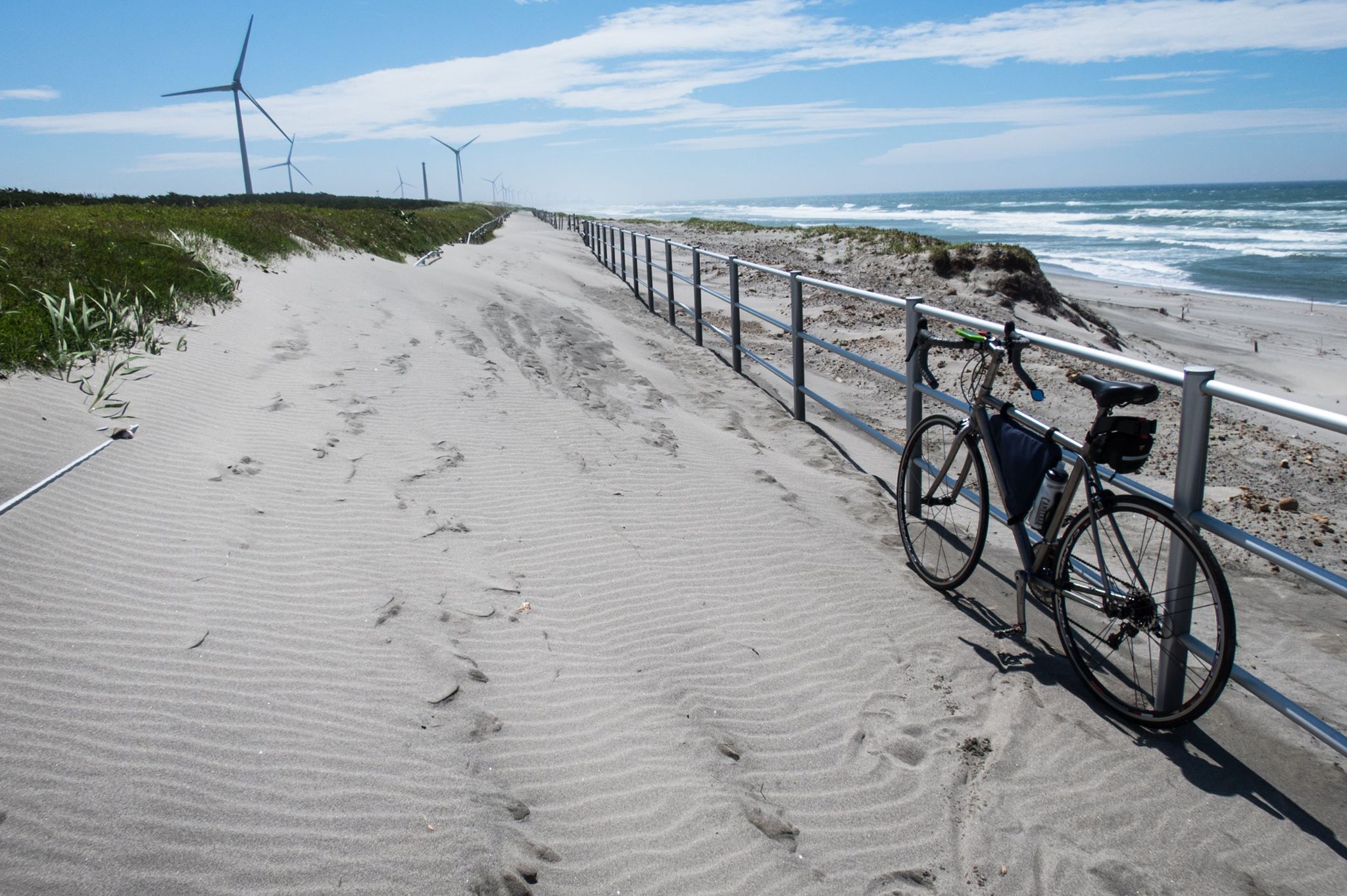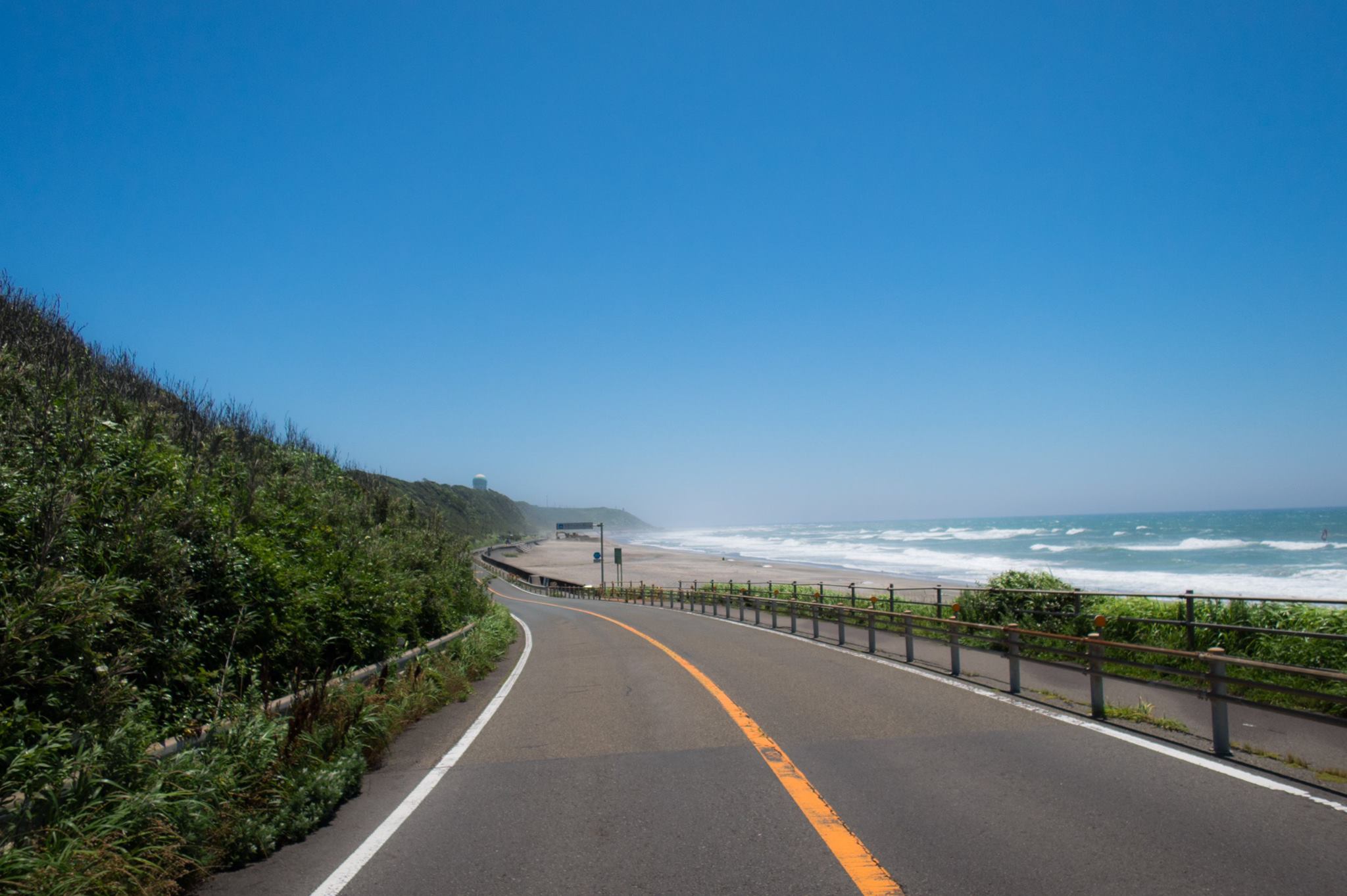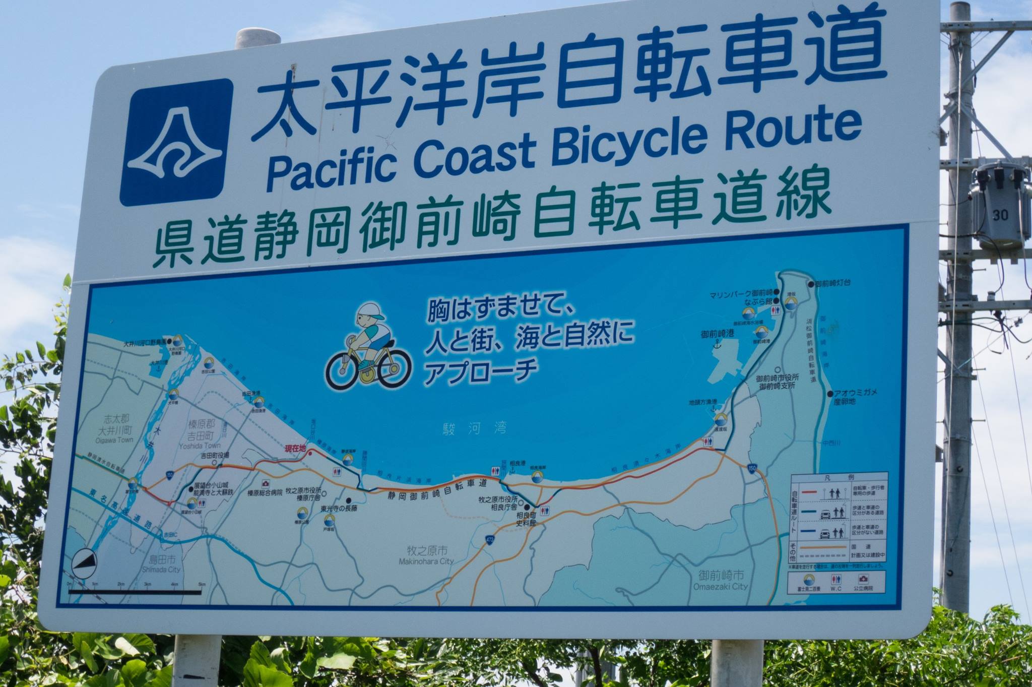 R1を走り、大磯の吉田邸脇から、西湘バイパス沿いの太平洋岸自転車道にでるが、間も無く道は終わる。大磯海岸は大渋滞。