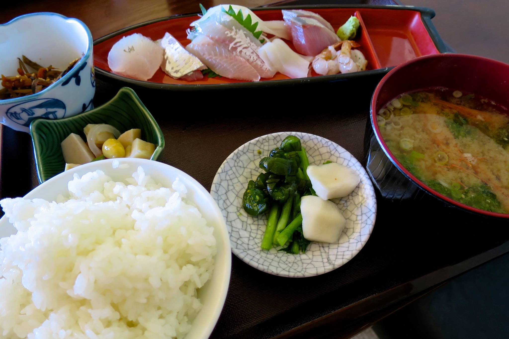 13時すぎて田ノ浦海水浴場の旅館丸一で昼飯にありつく。