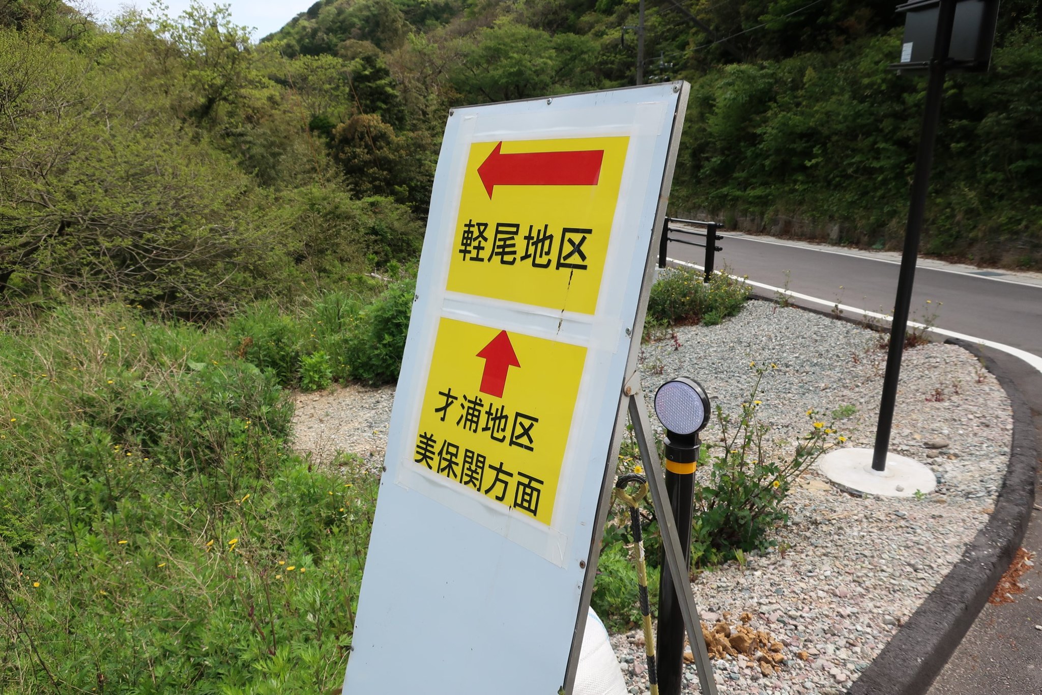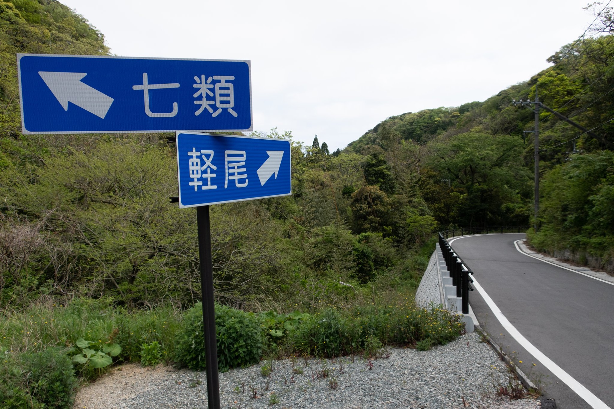 一方さきほどの峠の頂からやや刈尾海岸へ向けて下ったあたりから、地図にはない新しい林道が、左に分岐していて、「七類」と標識まで立っていた(5月末時点でも、GoogleMapにもOSMにも相変わらずこの道は存在しない)。