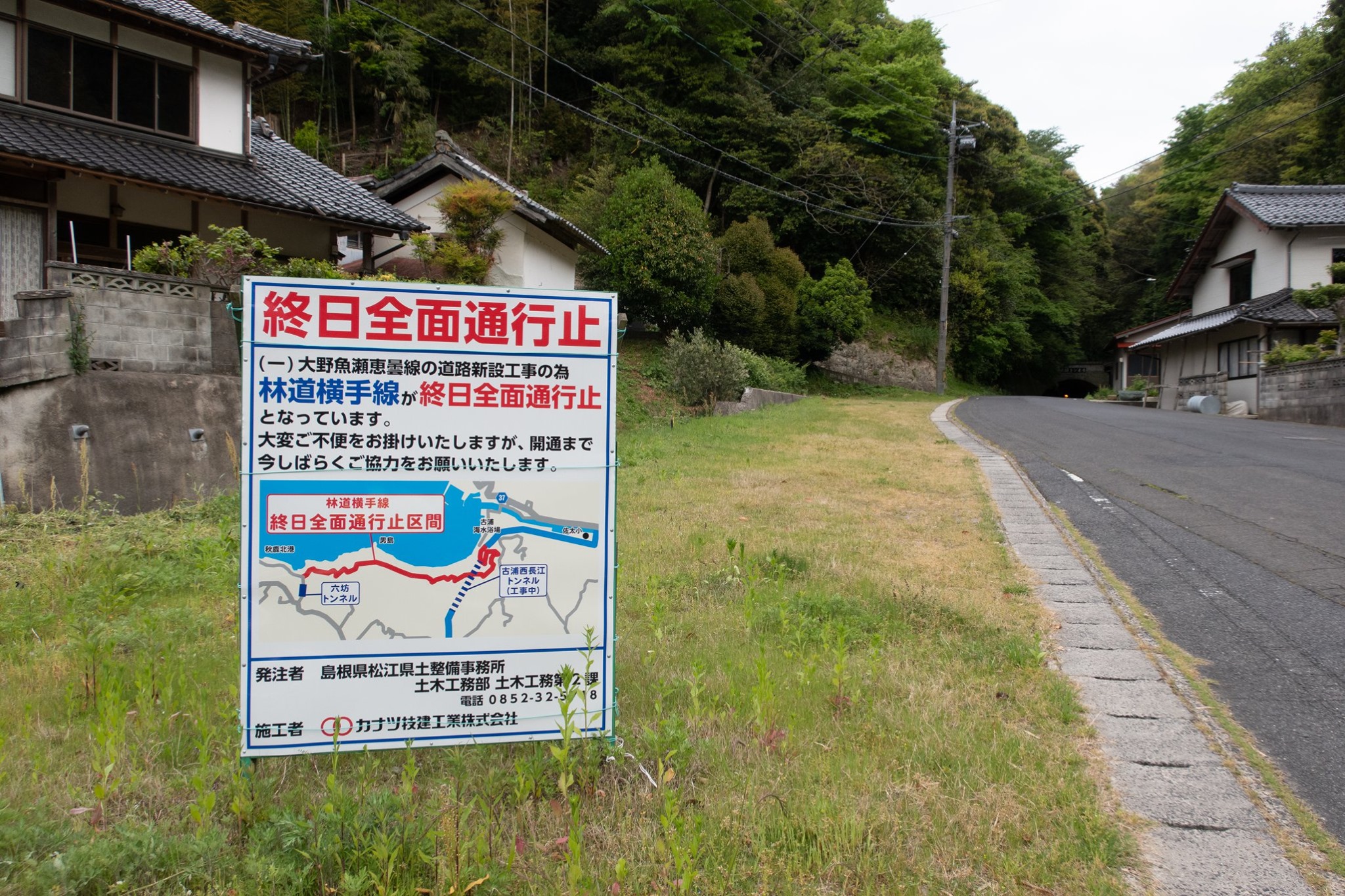 島根原発を過ぎ、鹿島町恵曇へ出た。ここからは県道37号を外れて、古浦沿いに県道266を進む予定だったが、海沿いの道は道路改良工事のため完全通行止め(というより、新しい県道を作るため旧道がなくなってる)。