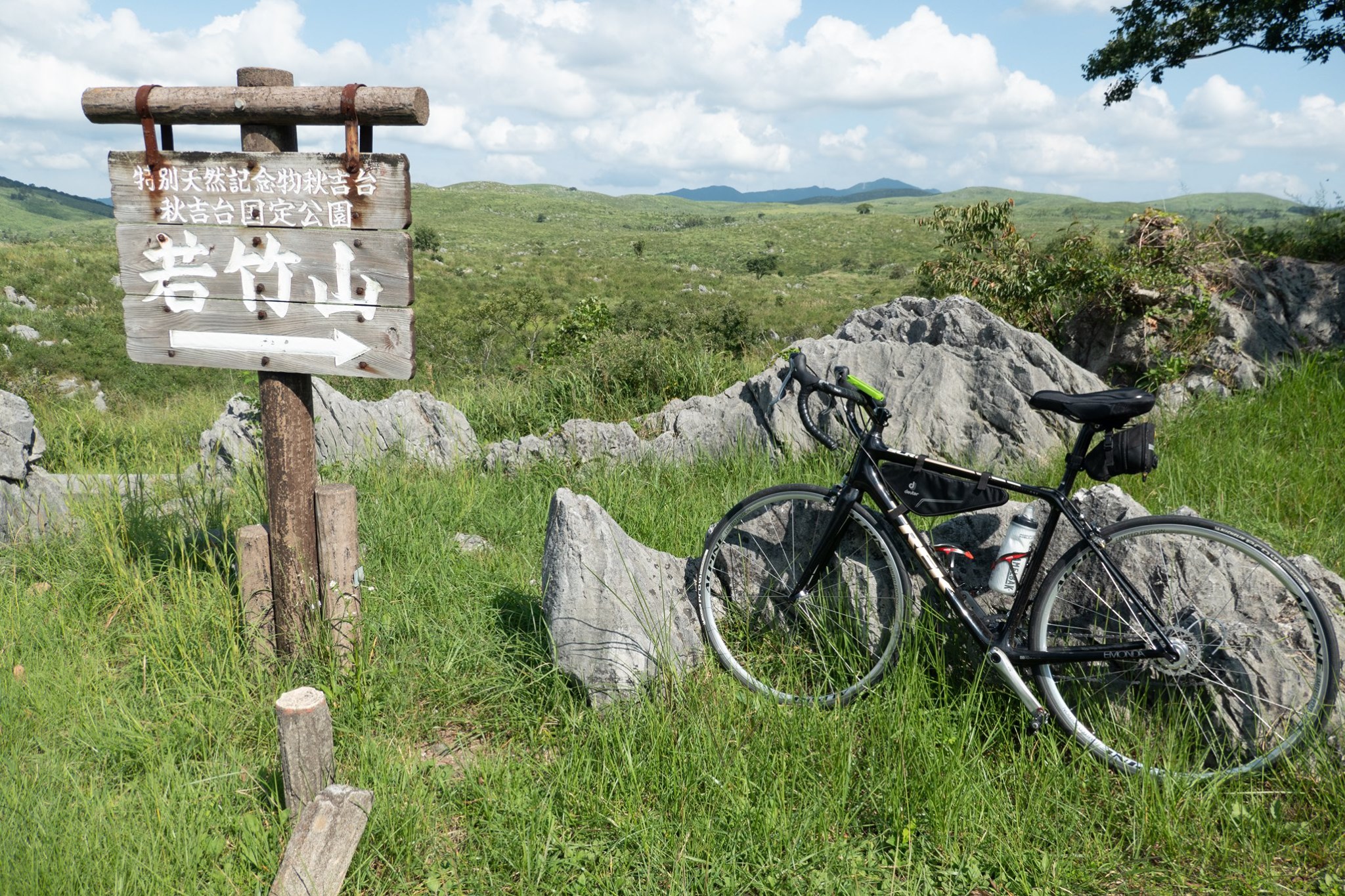 09:50 秋吉台に到着。中国山地分水嶺を自転車でひと筆書きするため、この夏の旅でタクシー輪行してしまった美祢駅前までをまず走る。