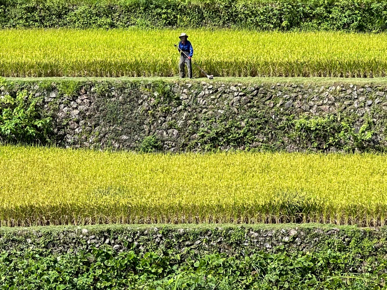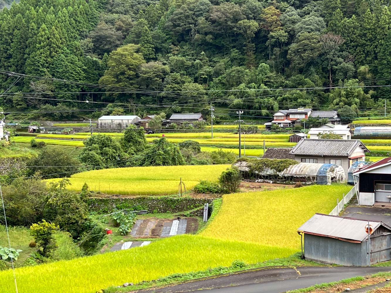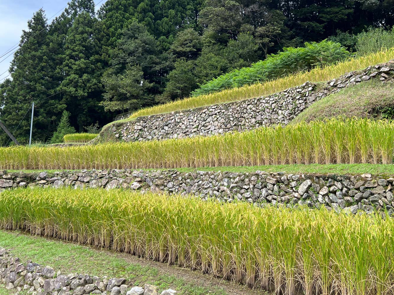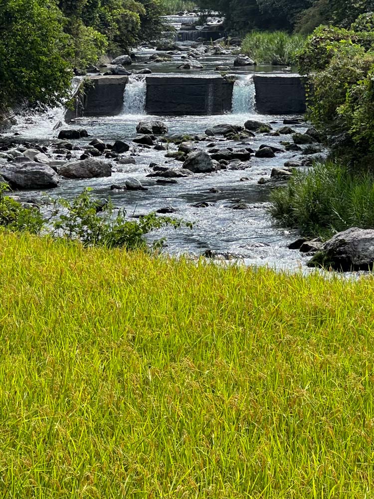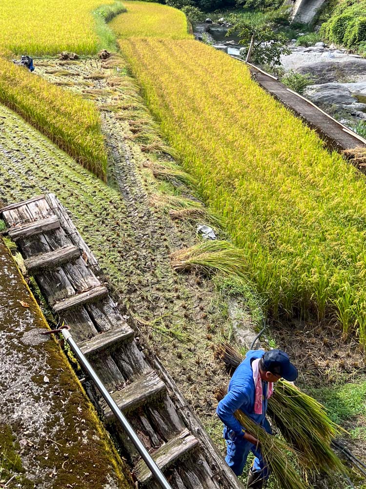 小川川ぞいの棚田の稲刈り風景(小川新別あたり)