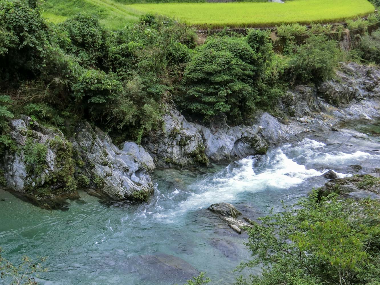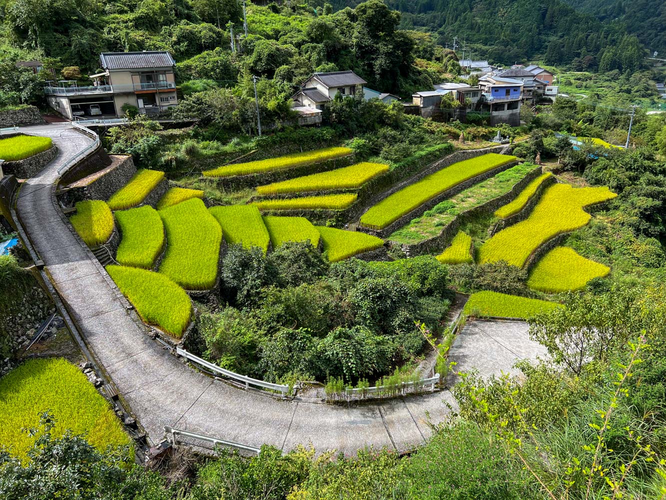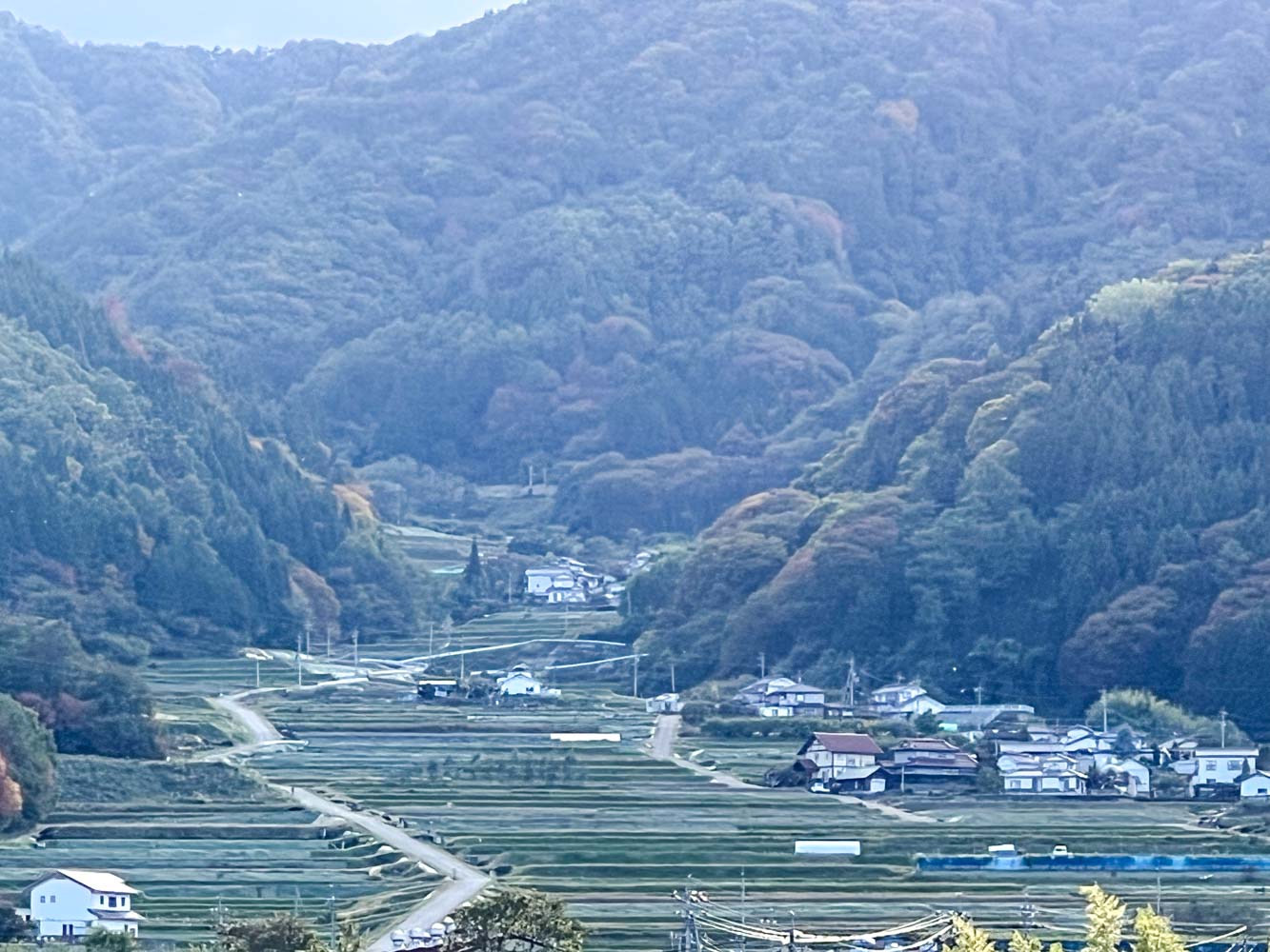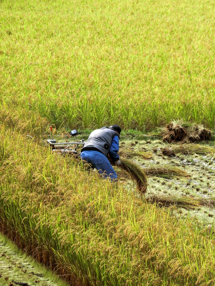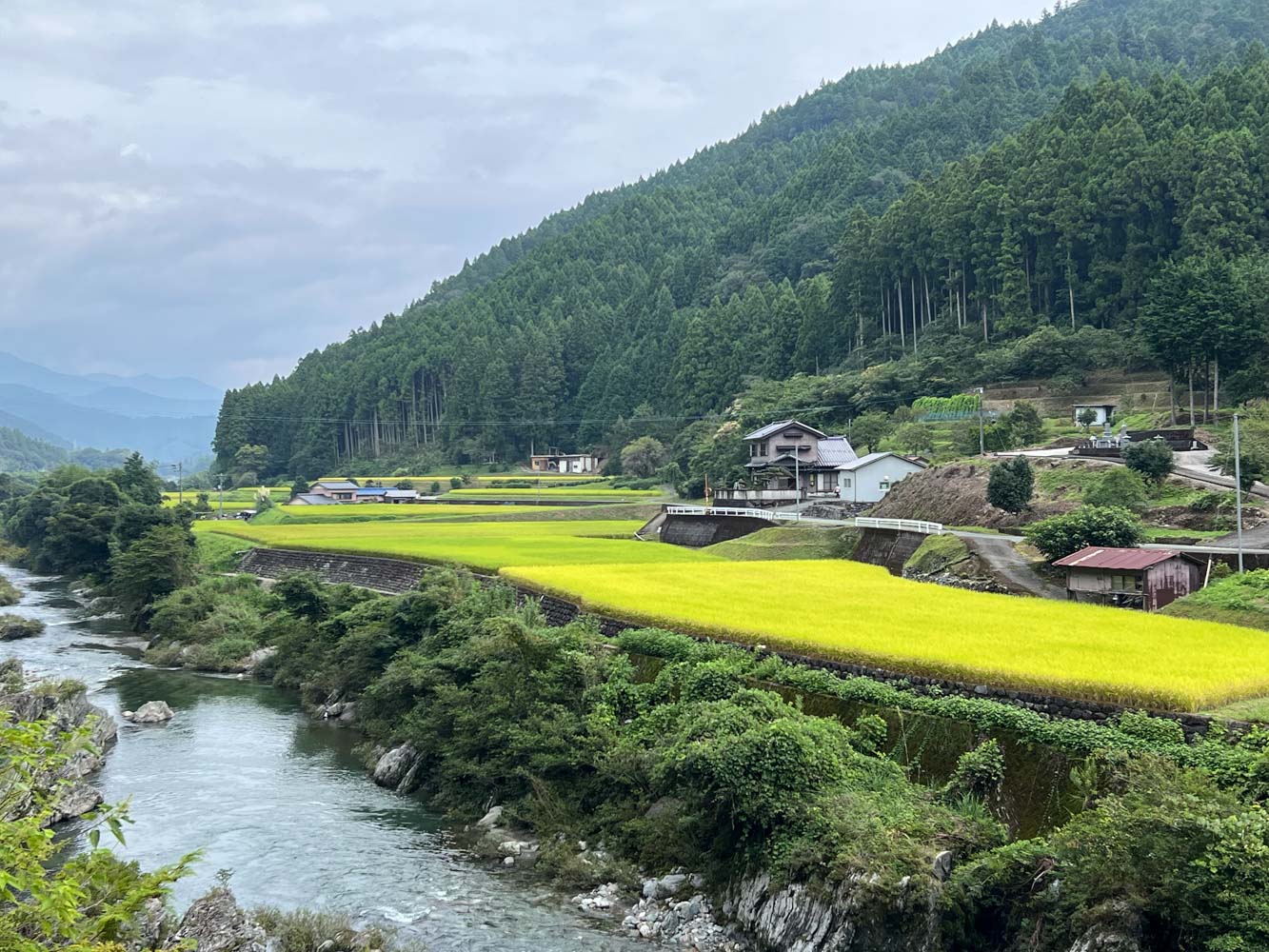 小川川ぞいの棚田の稲刈り風景(小川新別あたり)