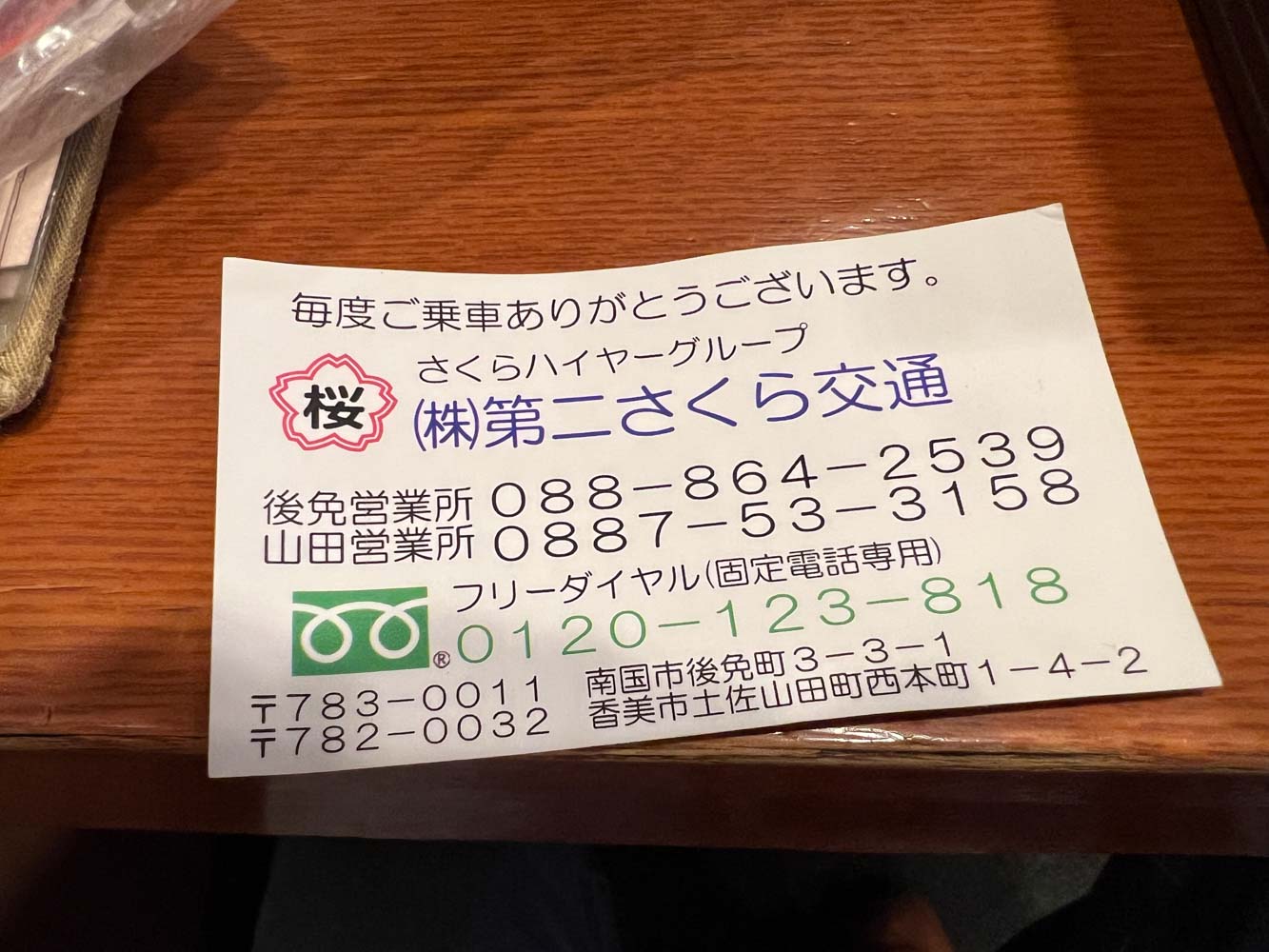 後免駅の前を通りながら、駅前のタクシープールに待っているタクシーの運転手さんに会社の電話番号を書いた名刺をいただき・・・