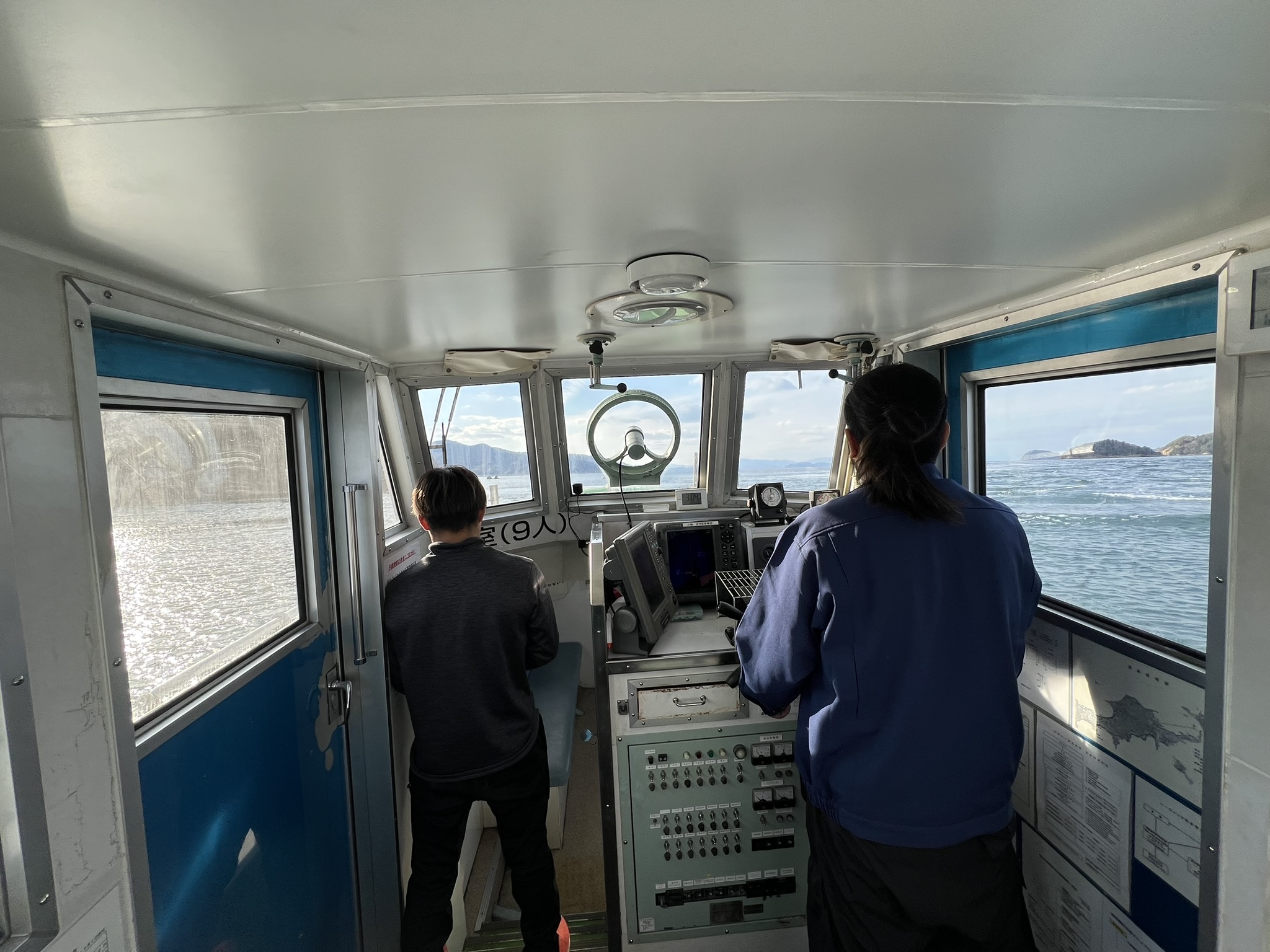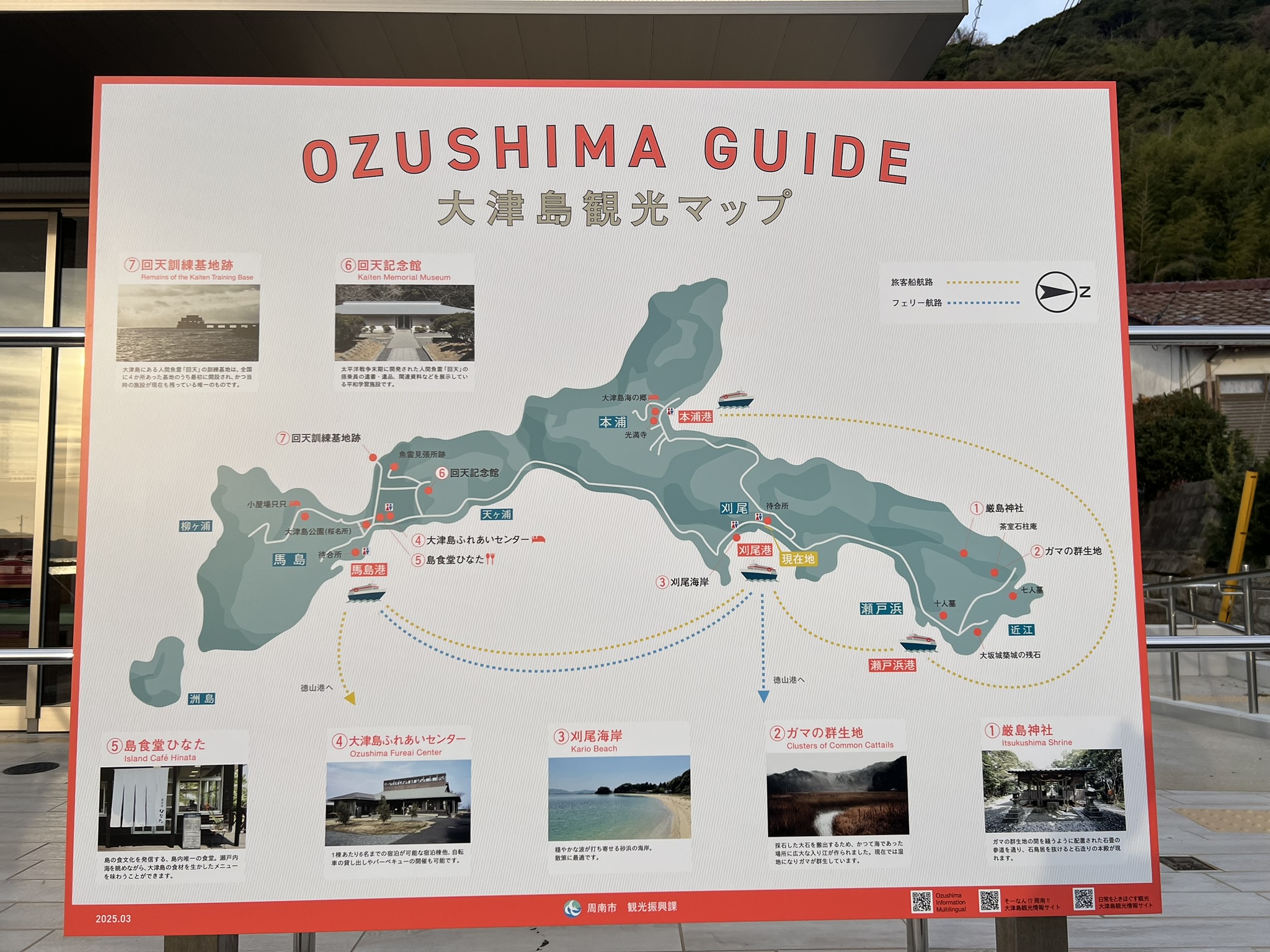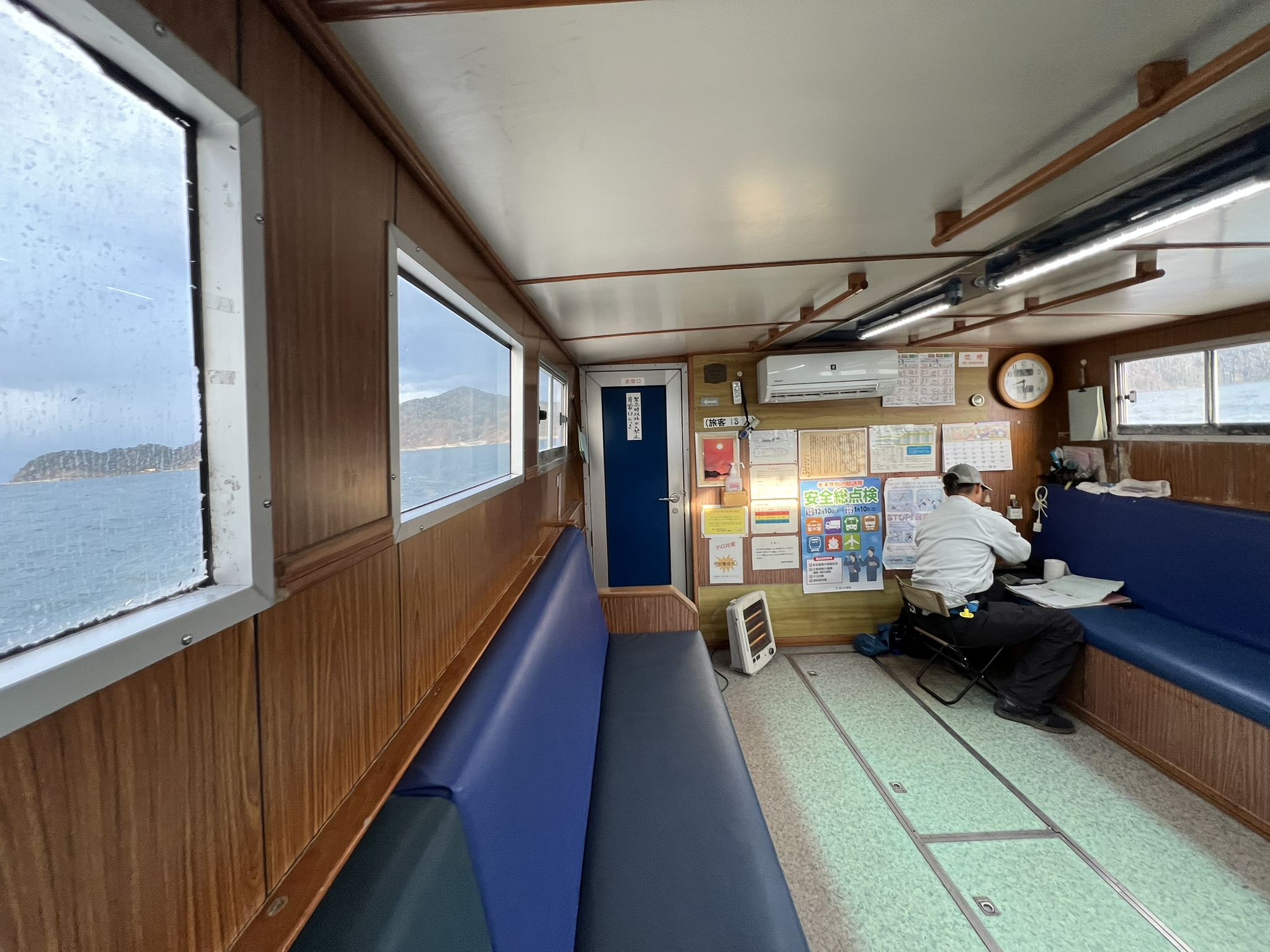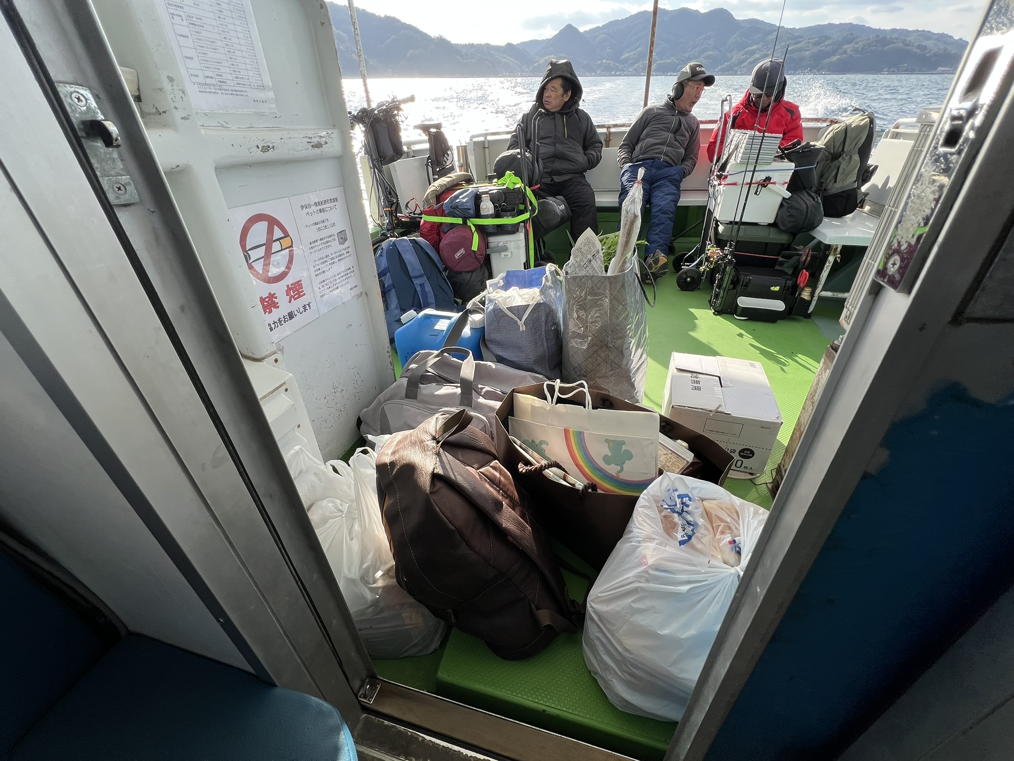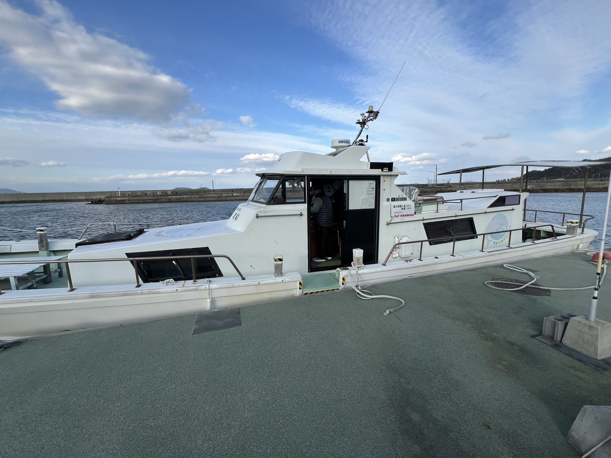 07:55にホテルを出発。この日は鵜の港からチャーター船で出発し、沖ノ島、小豊島、石島、その他の直島諸島をめぐる。