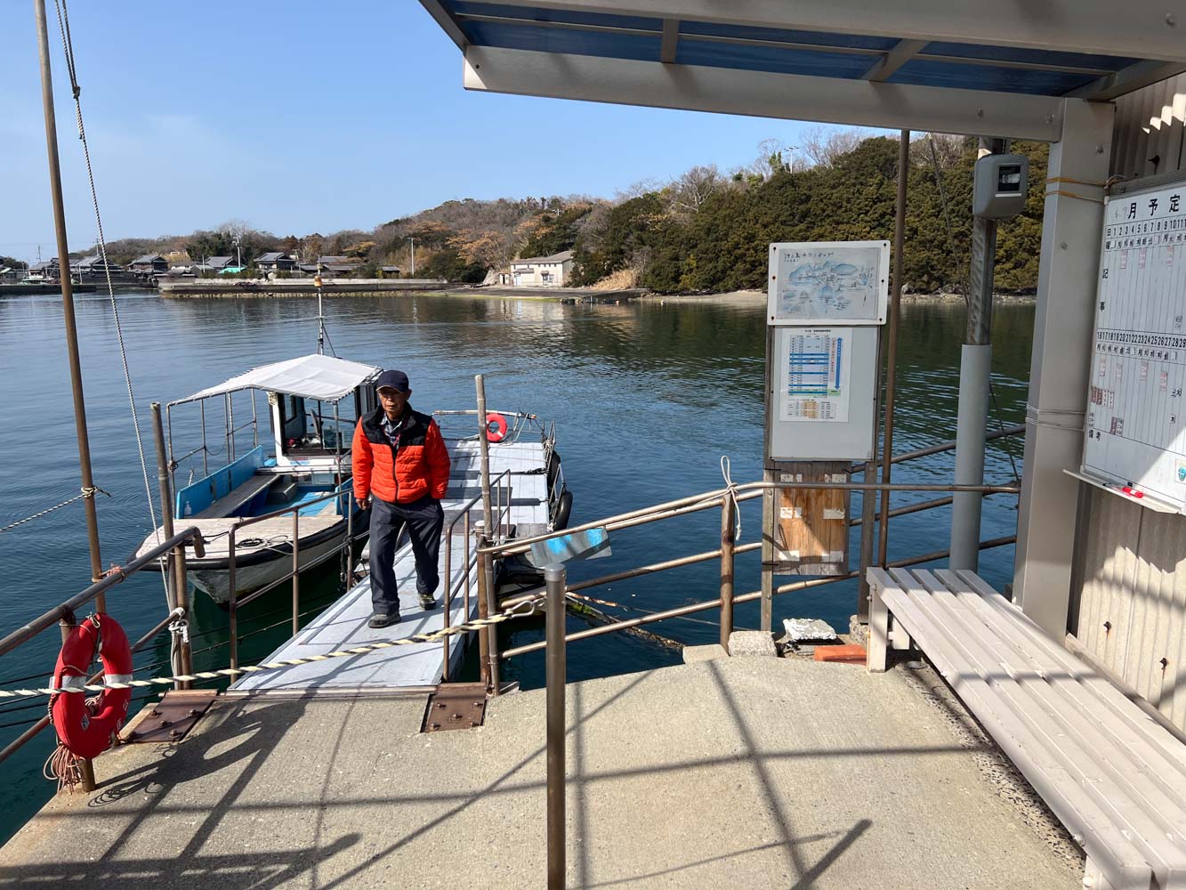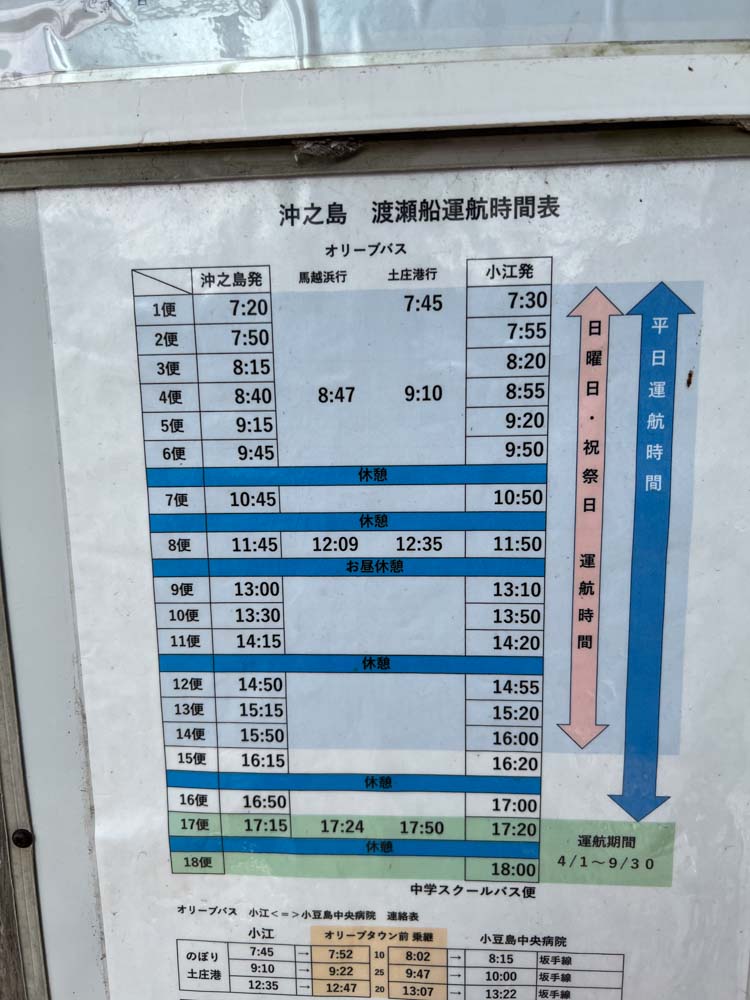 沖ノ島10:45 ー 小江10:47 の渡船で小豆島に戻る