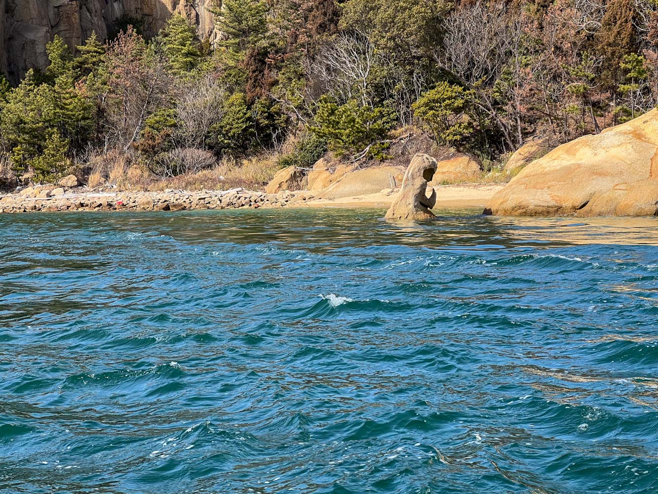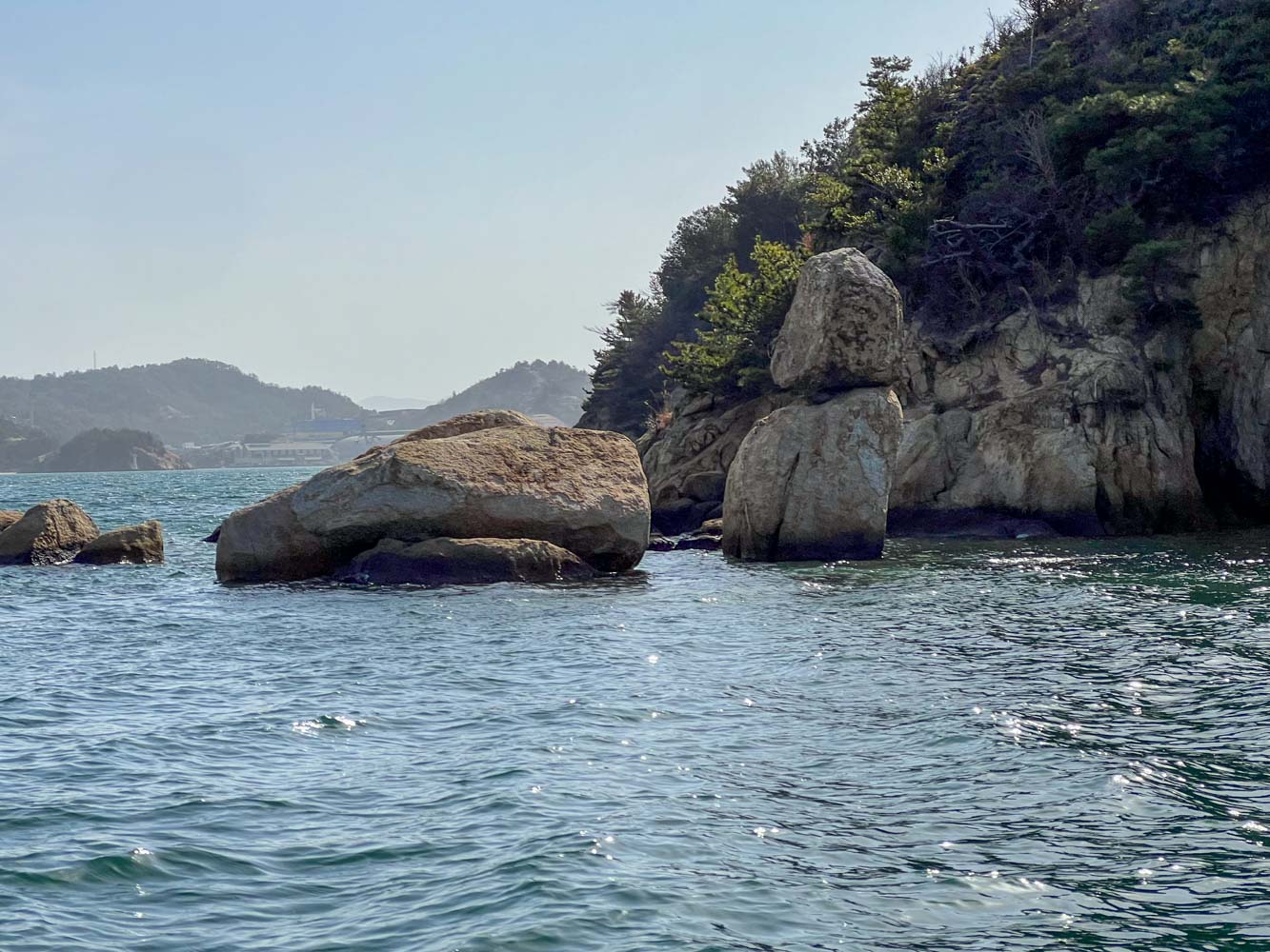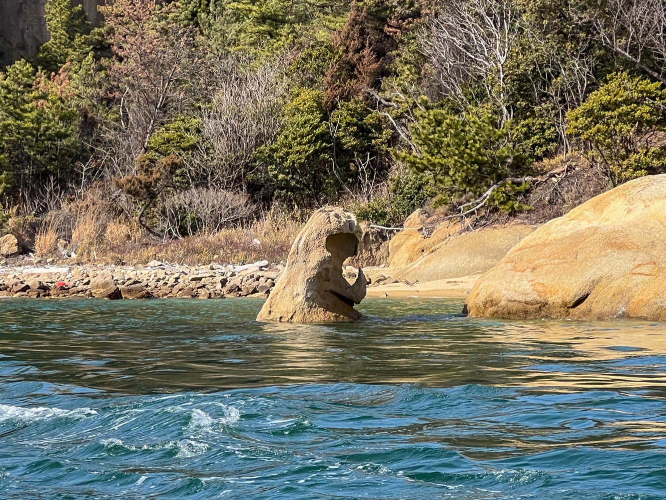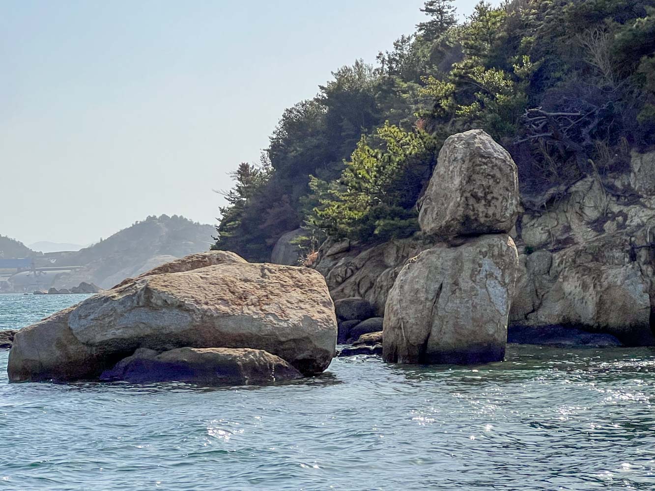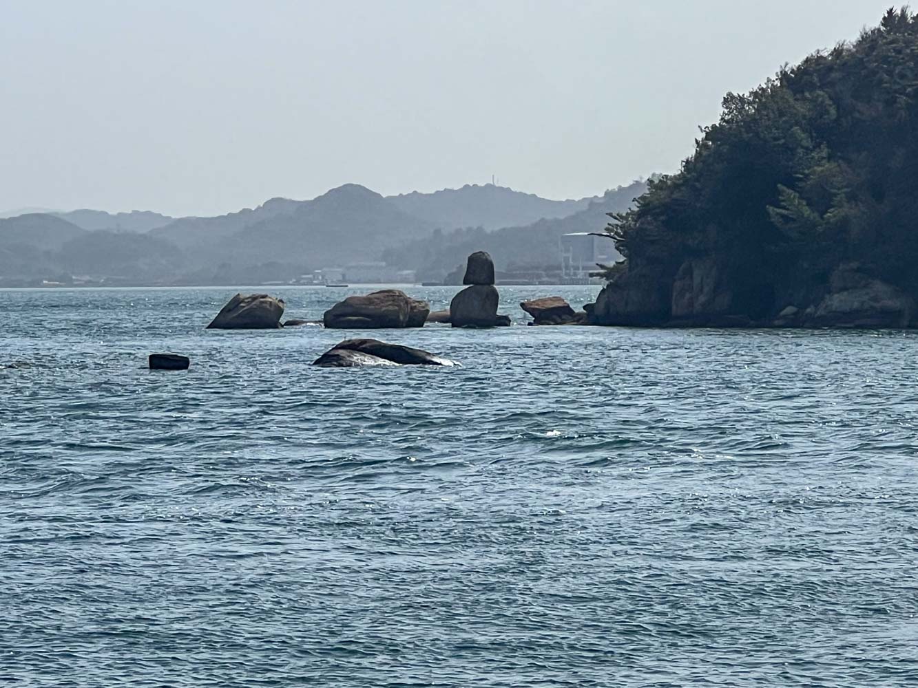安野島(あんのじま) 直島諸島の無人島。 船をつけられそうな場所はなく上陸できなかった。 「虚無僧」あるいは「雪だるま」と呼ばれる、積み重なった岩が島の北東にあった。
