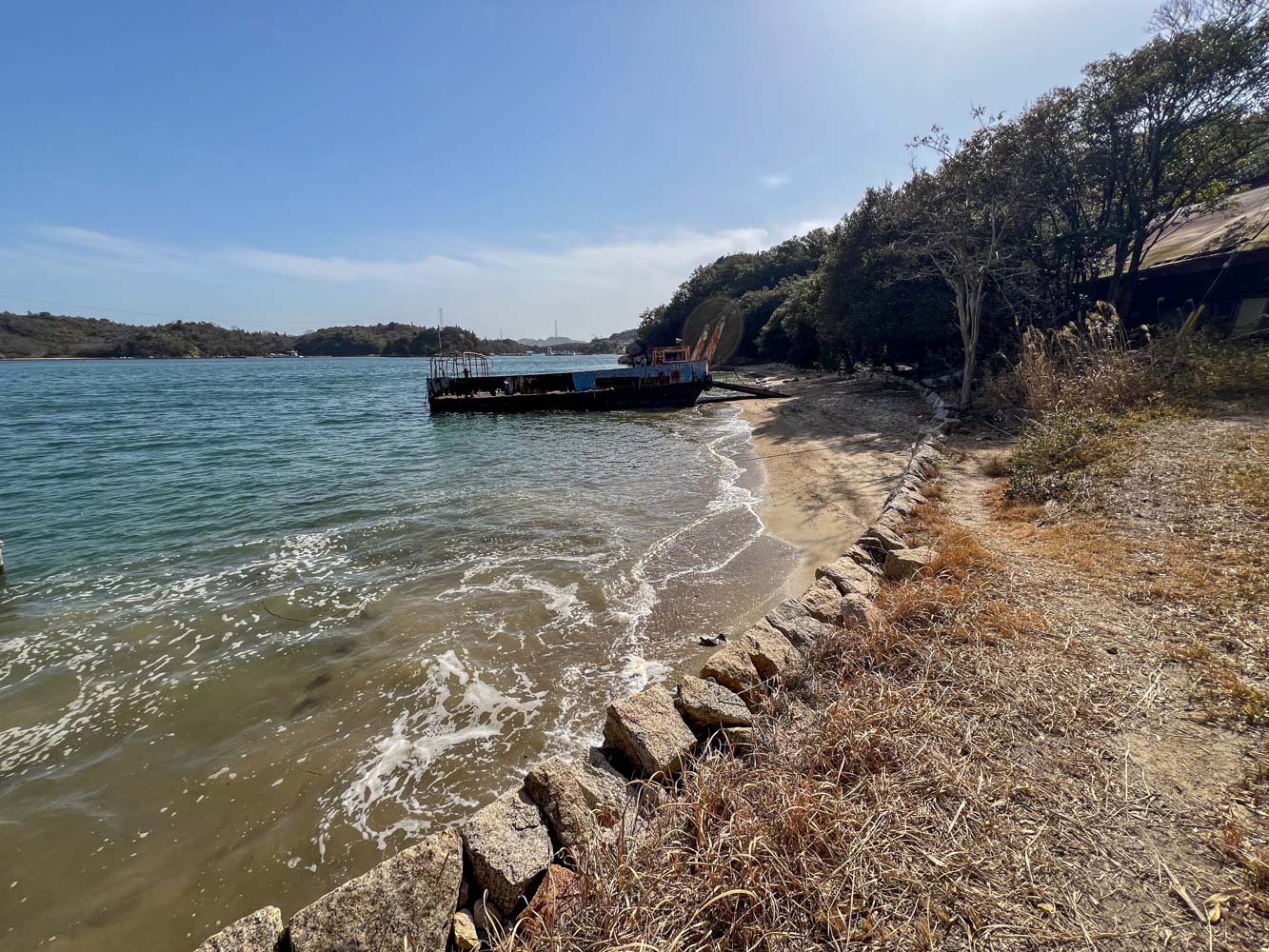 家島(えじま) 平成12年以降無人島化。 島の南東部では塩田跡が残っている。 海賊の隠した財宝が隠した島の洞窟に眠っているという伝説や「島を守る大蛇の住む洞窟」の伝説がある。 無人島なのに、島猫たくさんいる、と川西さんは言っていたが、今回はまったく猫の姿はなかった。