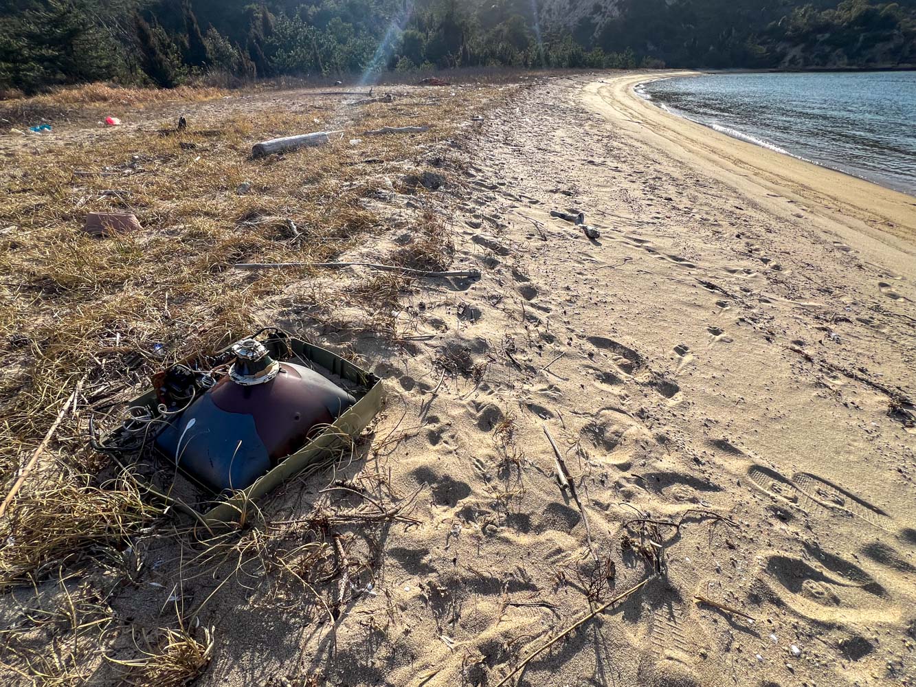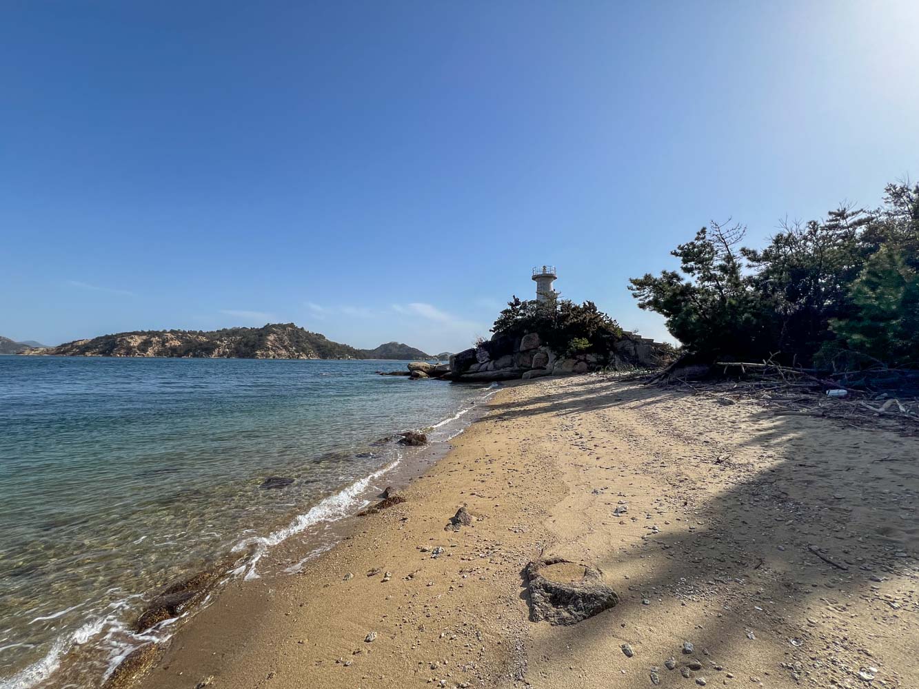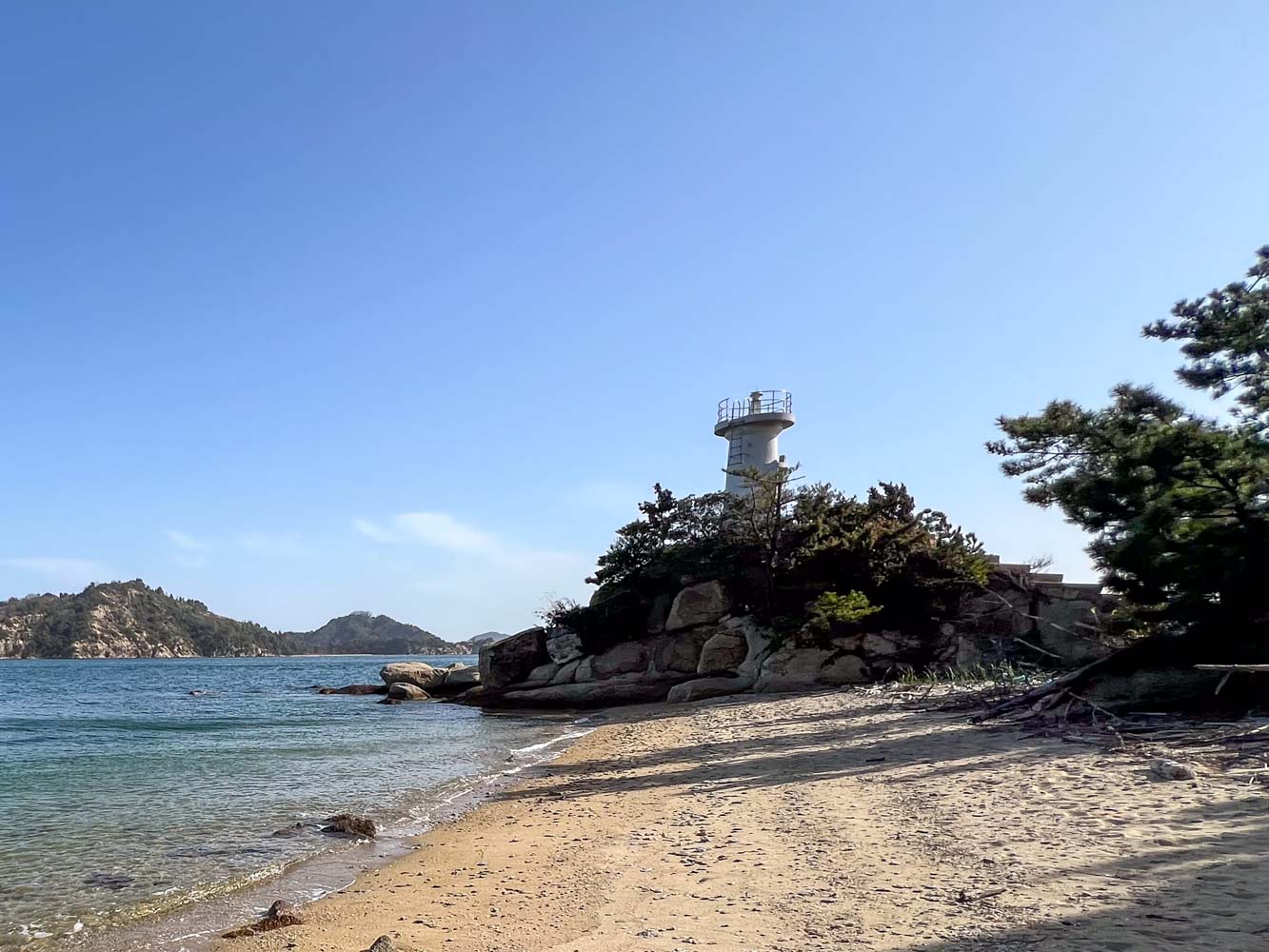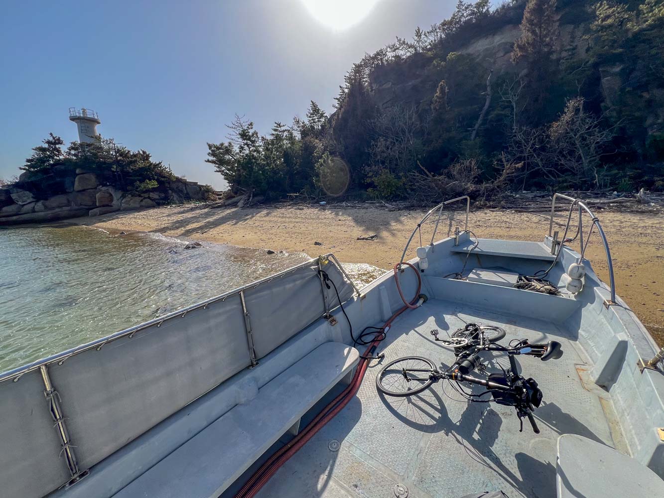 南端の灯台わきの砂浜に上陸。灯台までは浜から階段があった。