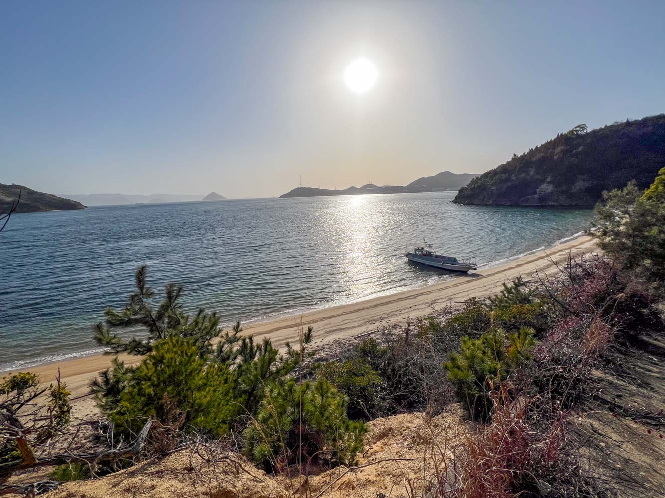 ほぼ満潮のため、アルバトロスで島につけてもらって、島に滞在しているあいだに、川西さんは宇野港へもどり、こののちの無人島めぐりのため、作業船に乗り換えてきた。