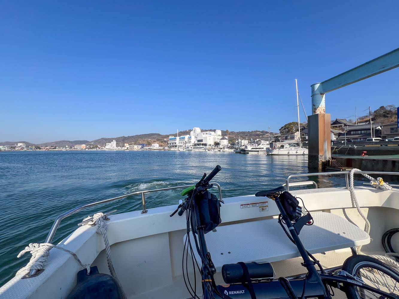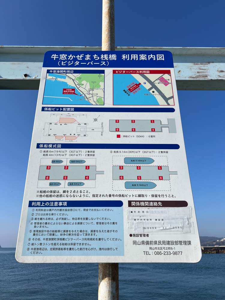 大生汽船の雄島さんが、牛窓の県営桟橋にAM9:00にモーターボートをつけてくれる予定なので、8:30になってホテルをでて、駐車場に車は置いたまま自転車で「牛窓かぜまち桟橋」まで向かう。