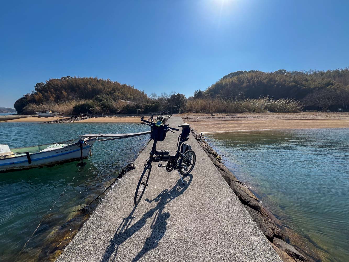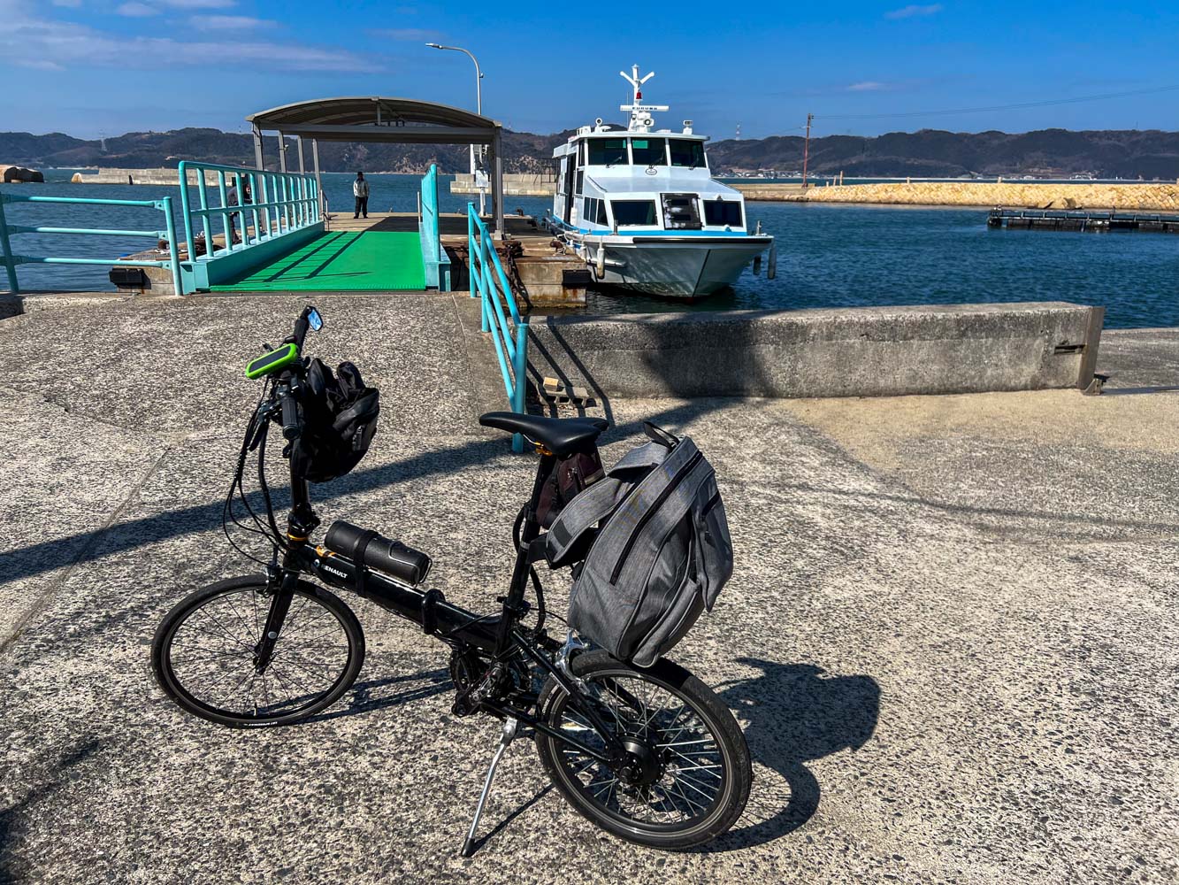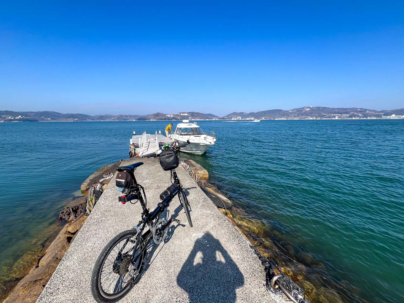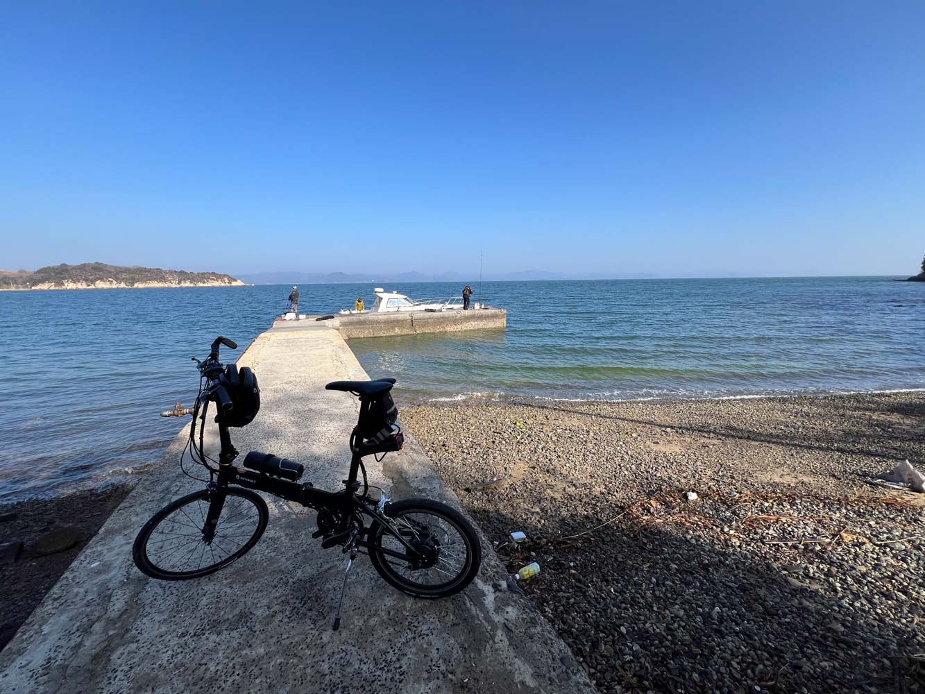 釣り人2名が桟橋にいた。自転車で来たことにあきれてはいたが、感じのよい人たちで、自転車を船から持ち上げるのを手伝ってくれた。