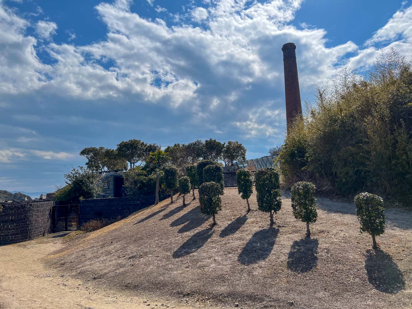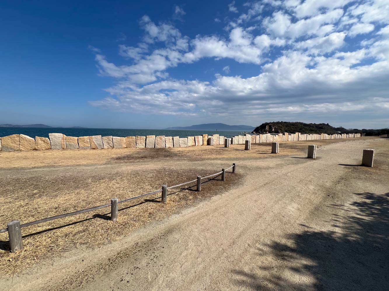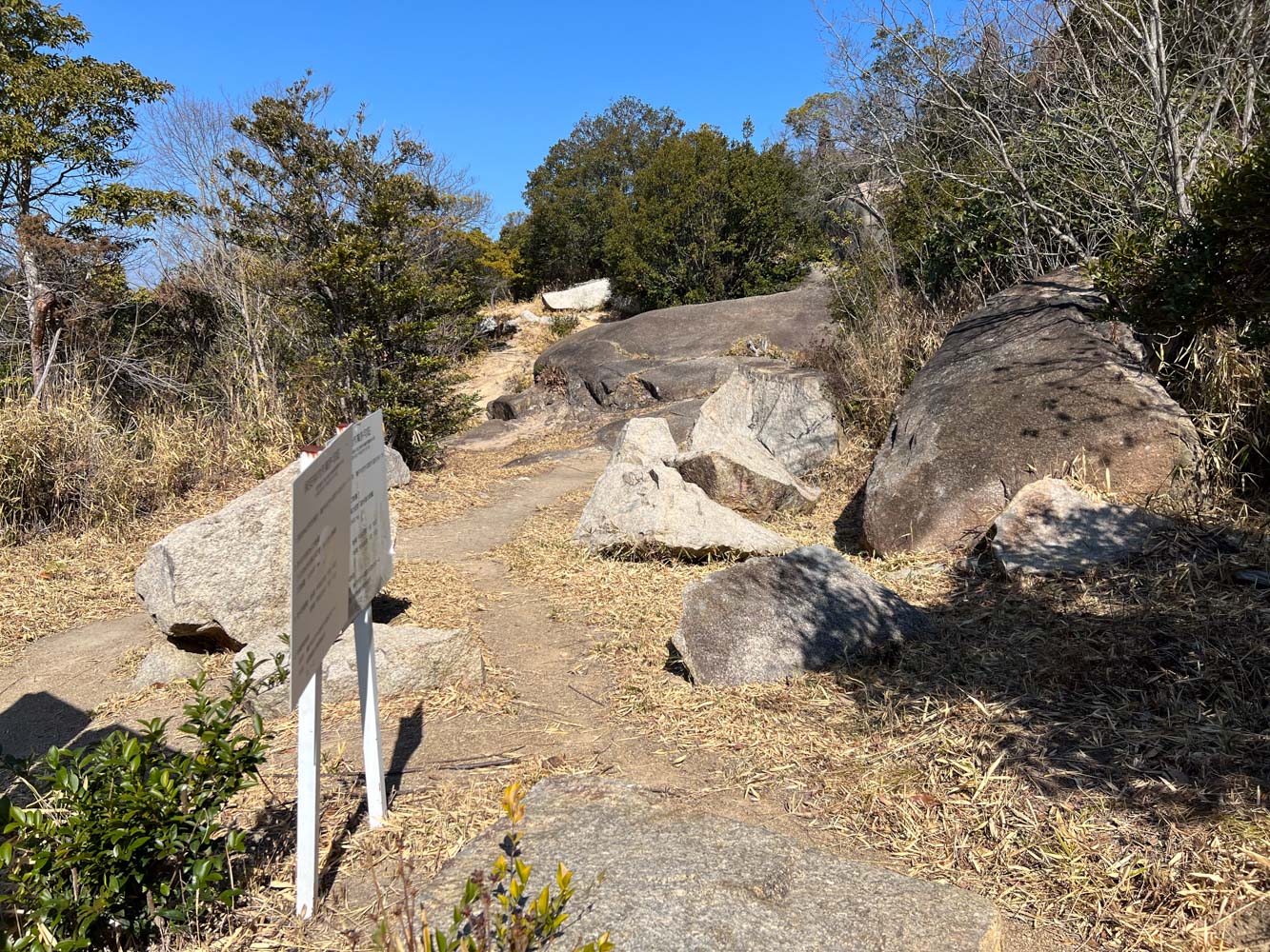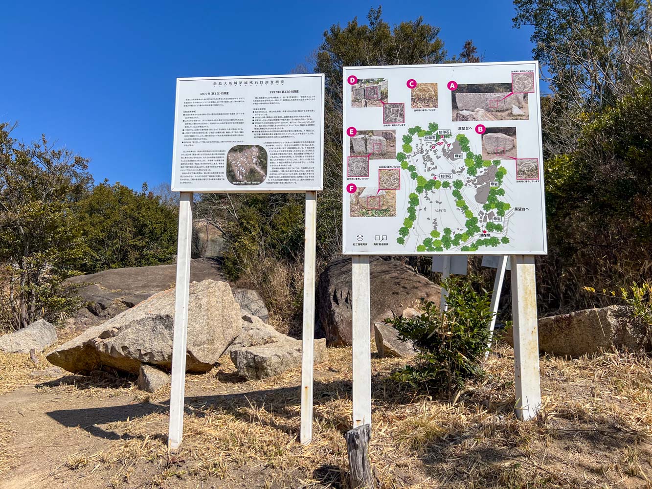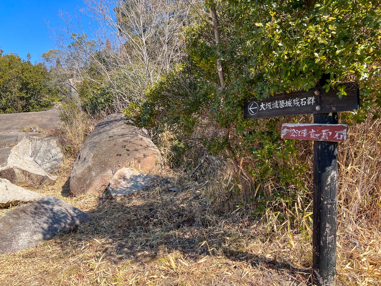 島の展望台のふもとに「大阪城築城残石群」なんていうのがありました。江戸時代初期(1620年~1629年)に徳川家により再建された大坂城の石垣を切り出した丁場の遺跡だそうです。
