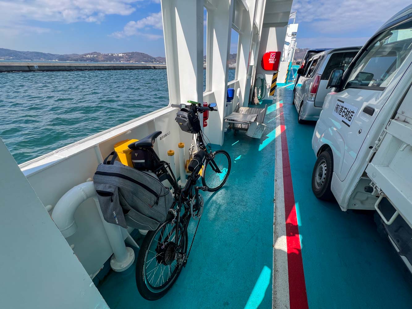 自転車は要パッキングとのことで、輪行袋に収めて乗船。