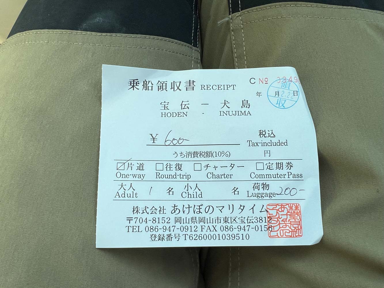 下船後、「株式会社あけぼのマリタイム 電話 086-947-0912」の前社長の娘さんらしきに大生汽船雄島さんからの「よろしく」を伝える。