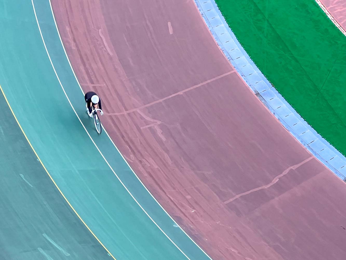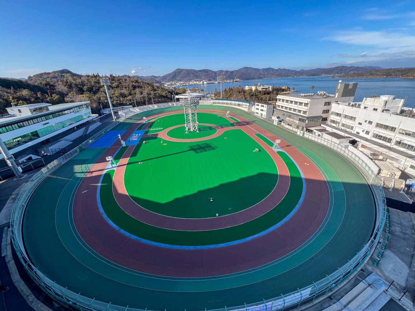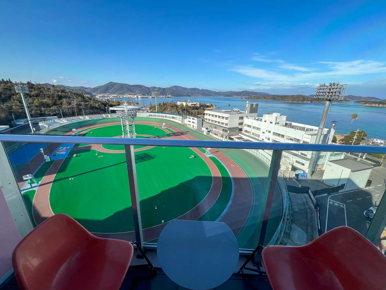 競輪場のホテルということで、公営ギャンブルに興ずる類いのお客さんだらけだったらイヤだな・・・、と思いつつも、宇野の町には他にたいして宿もないので、こちらに宿泊した。部屋のテラスから、眼下に屏風島、直島諸島、瀬戸内海が広がる。 選手の練習している、競輪のトラックを見下ろすという、特別なシチュエーションもなかなかのもの。
