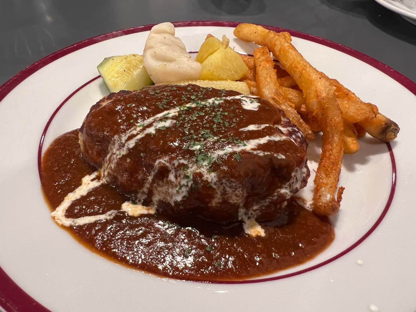 お店の質以前に客の質の問題があり大人集団が騒ぎまくり、あるいはしつけられていない子供たちが喚きチラシて走りまくっている。目の前で躾をする気のない母親が幼児2人を走り回らせているので、「賑やかなのが苦手なので席を変わりたい」と十分婉曲に店員さんにつげたところ「何言ってんのコイツ」みたいな顔をされて驚いた。「場末の居酒屋ではなくホテルのレストラン」と考えて伺った自分が間違っていた。 部屋に戻ってiPodを持ってきて、音楽を鳴らしても効果はなく、脳裏をつんざくような叫声が店内に響き渡るような環境で食事をした。