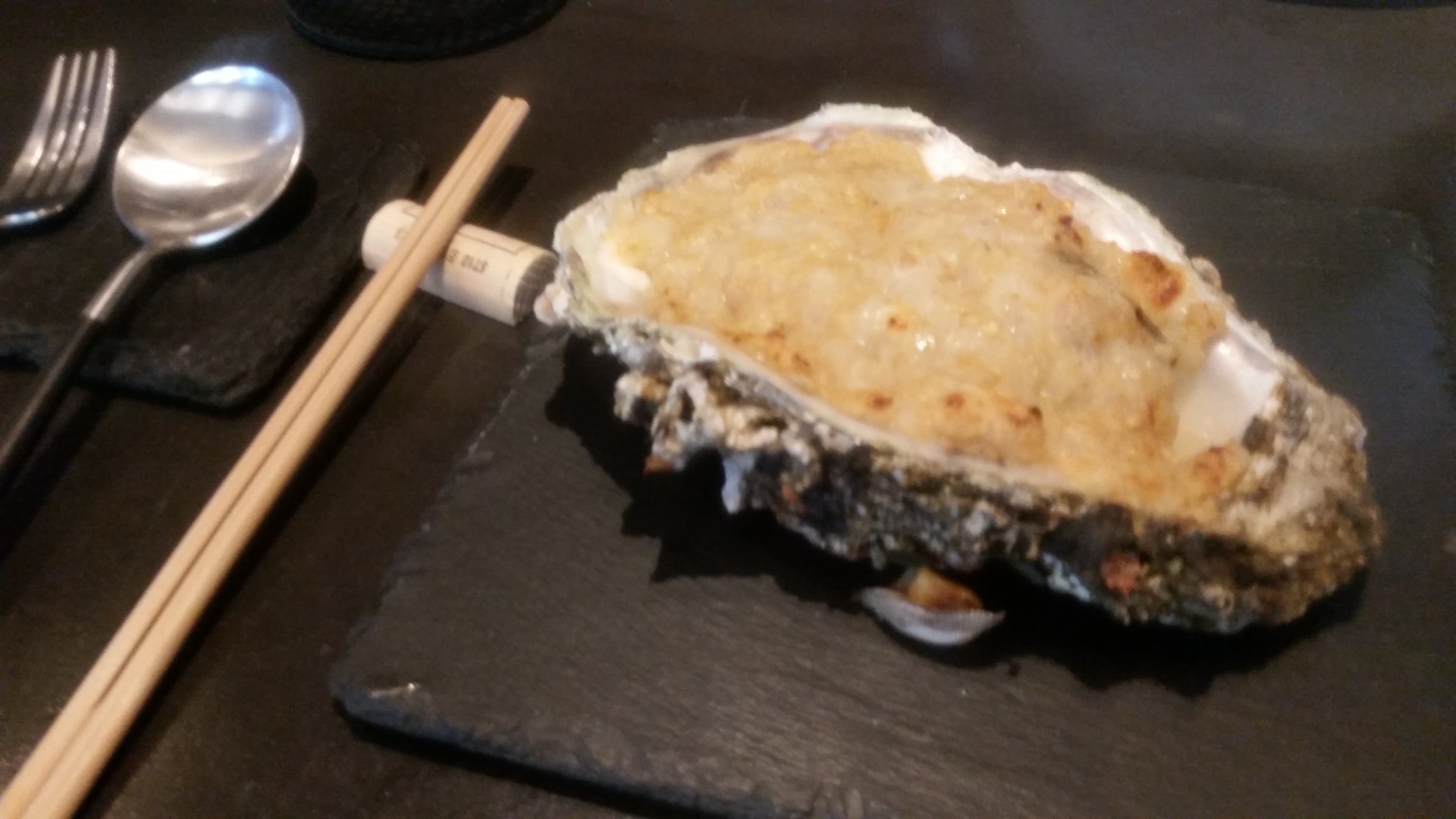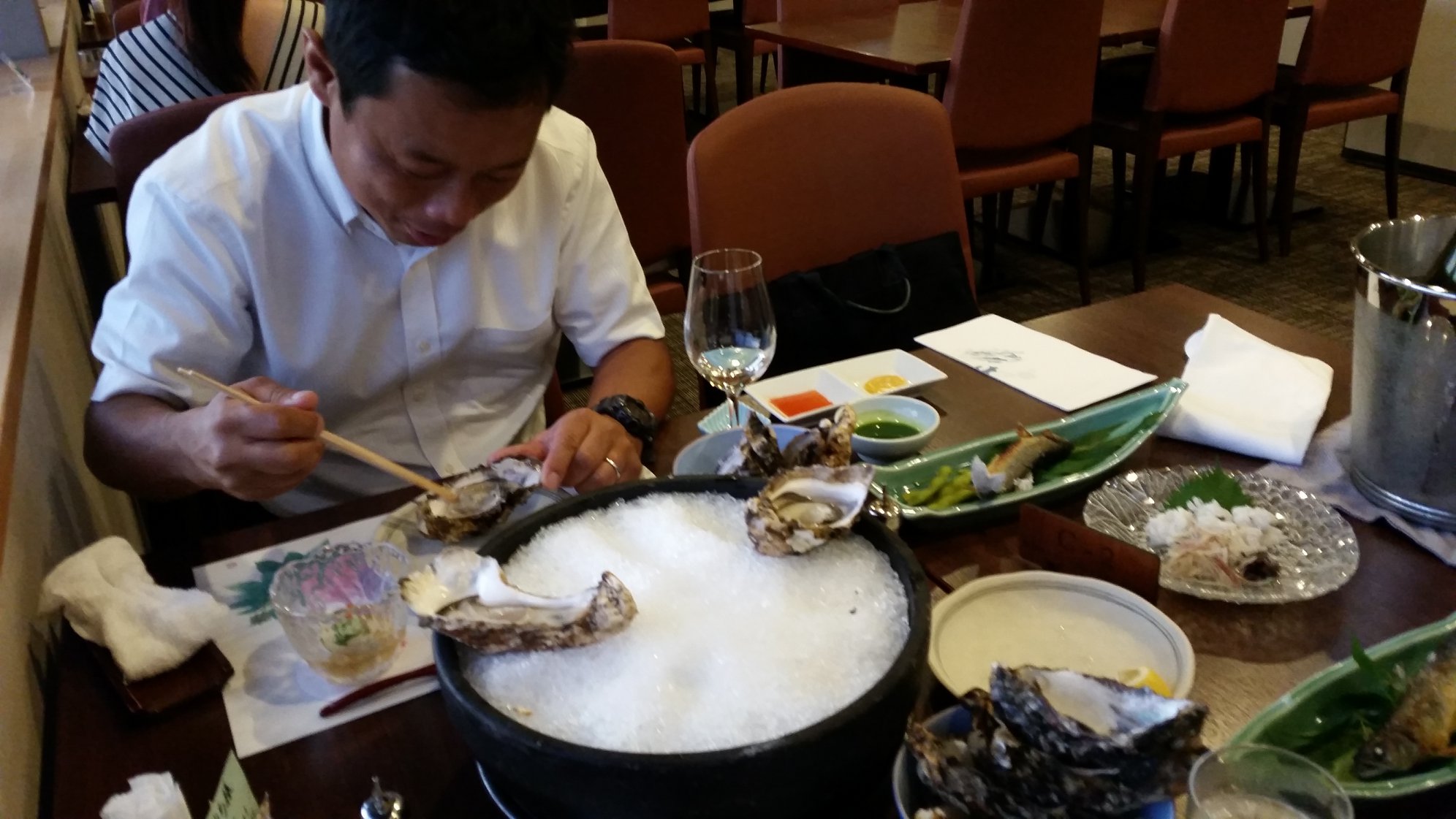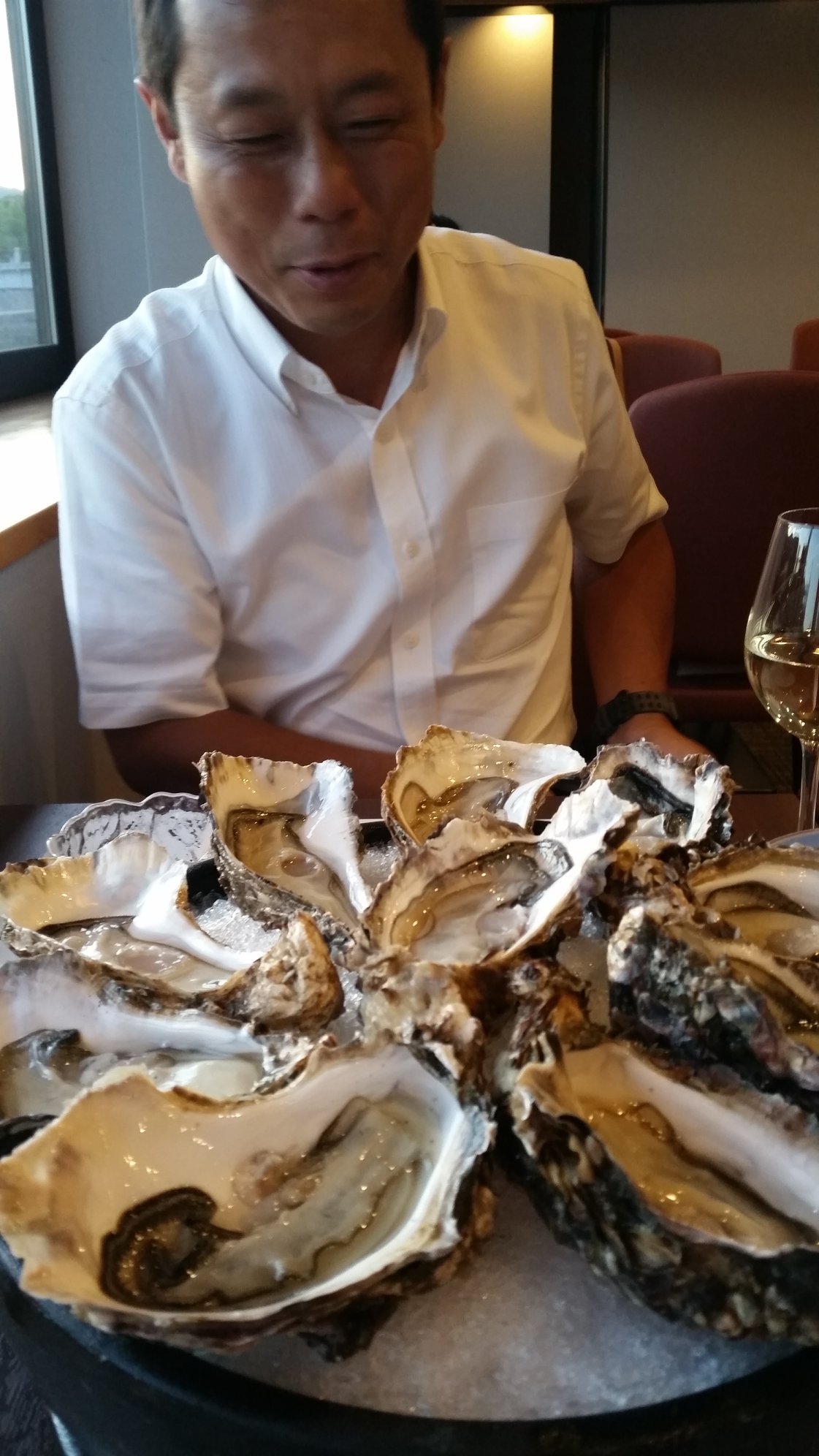 先にシャンパンで生牡蠣をいただいていると、吉岡氏到着。