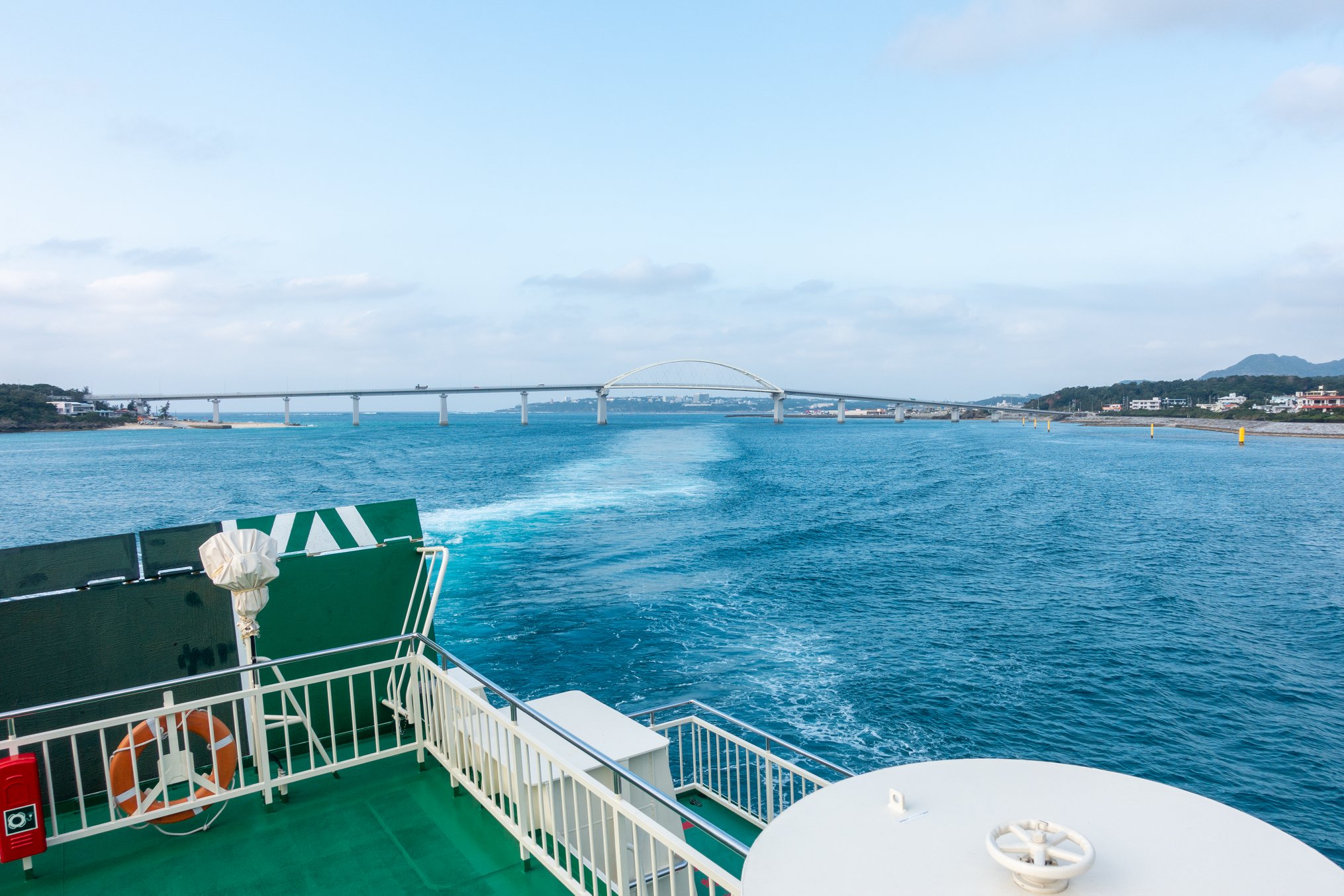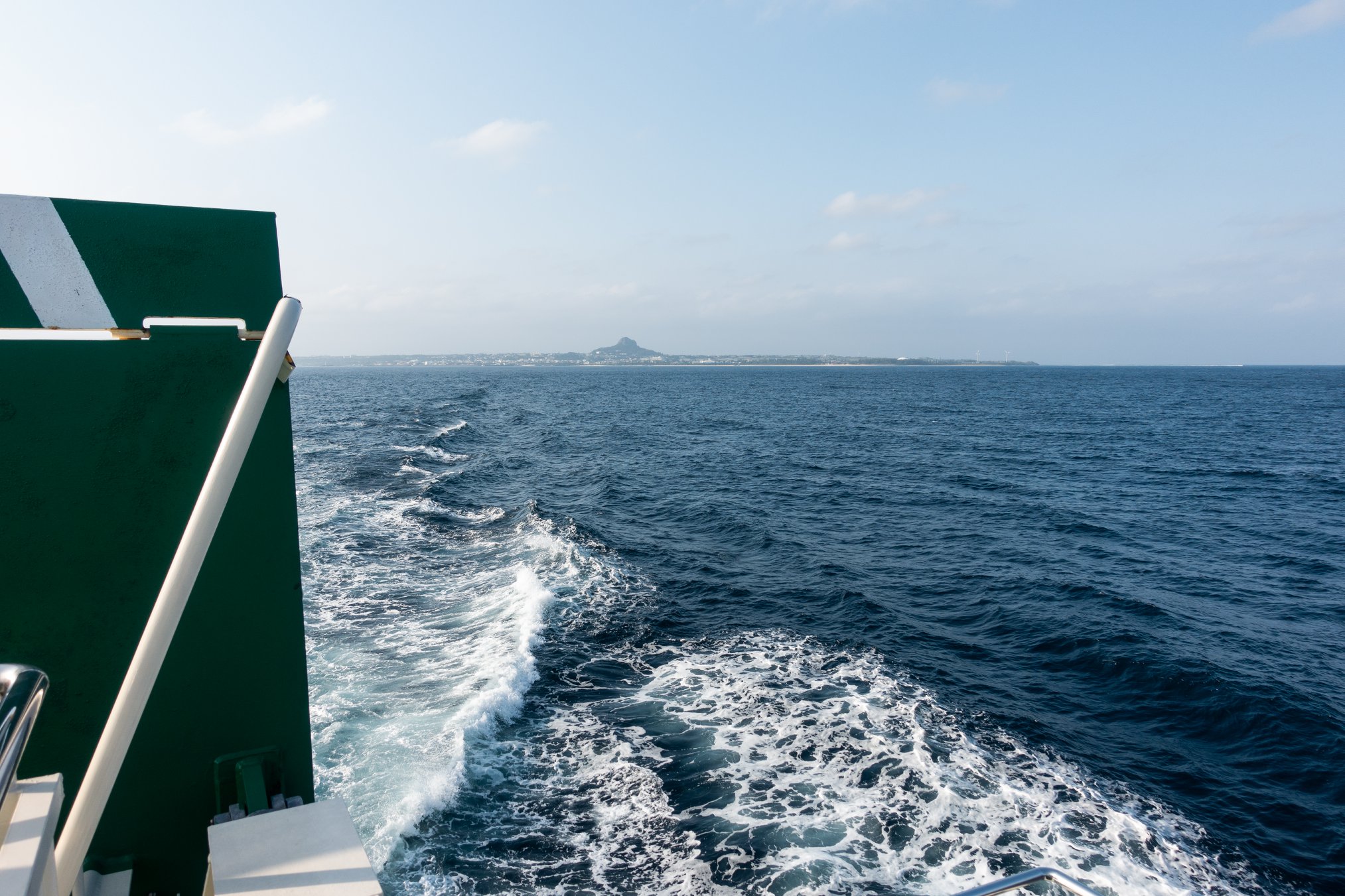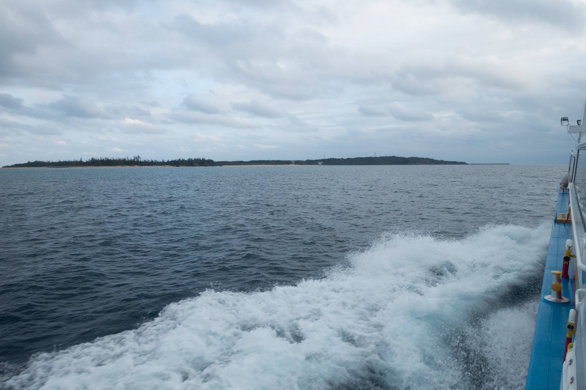 フェリーに乗船してスマホを見ると、着信あり。発信者は、翌日、伊平屋 ― 伊是名間の渡し(途中、無人島に寄りながら)をお願いしてあるH・Yマリンの比嘉さんだった。折り返すと、「明日、時化が予測されているので、無人島は無理。渡しは波次第で・・・」とのこと。天気予報では2-3mの波なんだがなあ・・・。