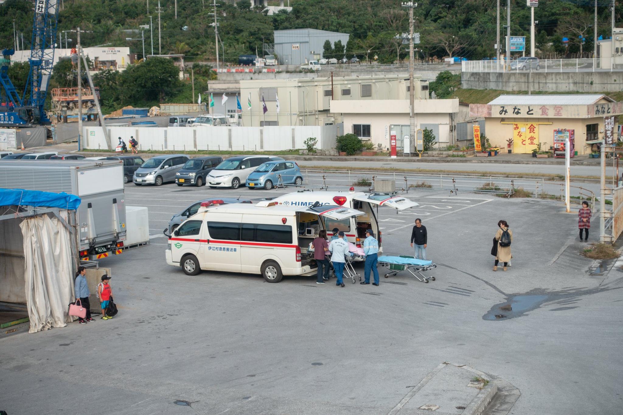帰路のフェリーには救急車が乗り込み、本部港で待つ別の救急車まで患者を移送していた。