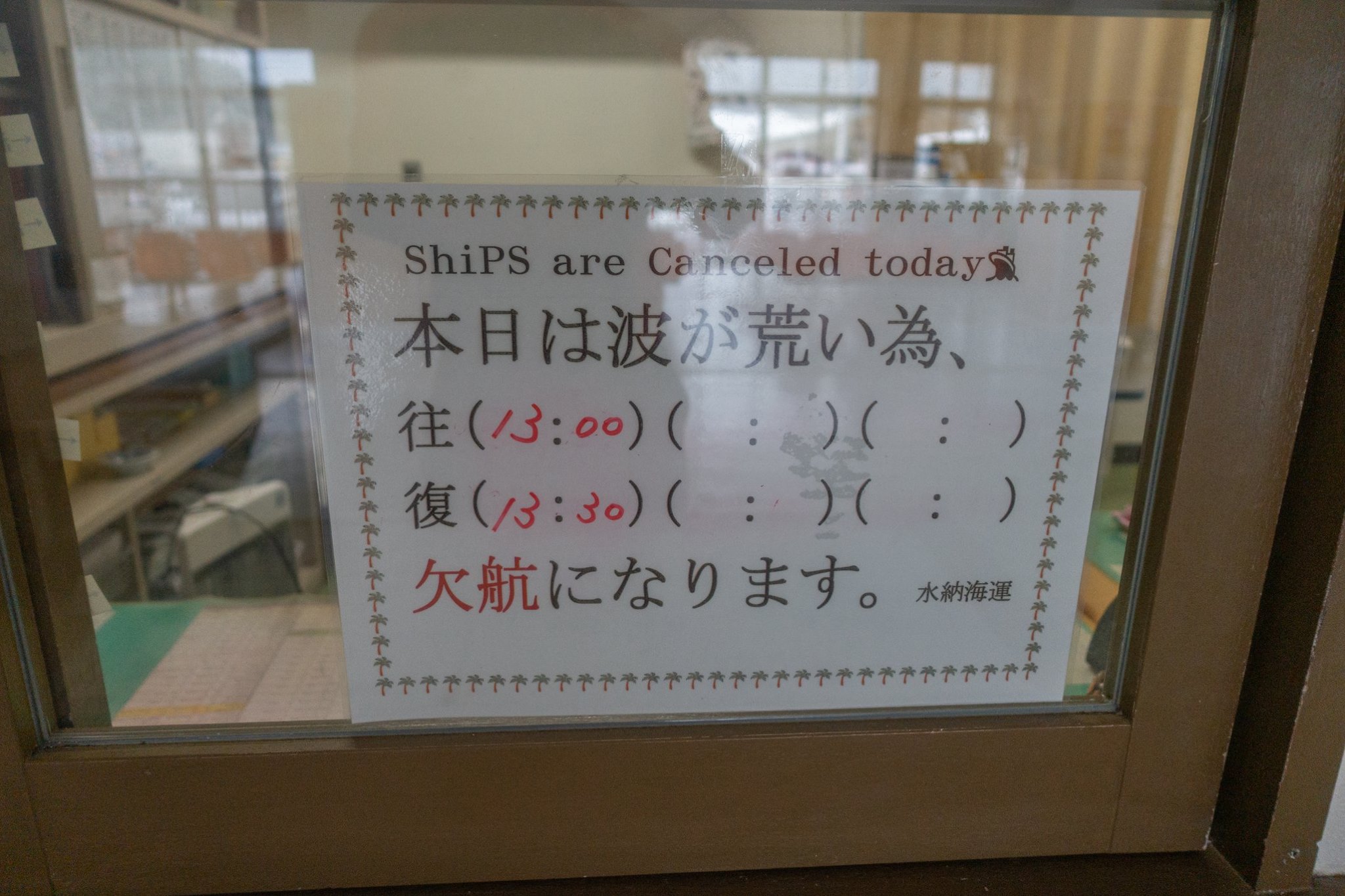 13:00渡久地ー13:15水納1330ー渡久地13:45 の高速船は時化を理由に運休。