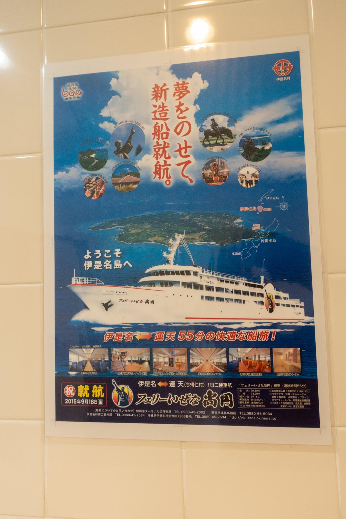 船内に貼られた、那覇での民謡公演のポスターを見て納得。さっきフェリーから下りてきて、バスに乗り込んだのは、観光客ではなく、那覇での公演に向かう伊平屋島民の団体だった。